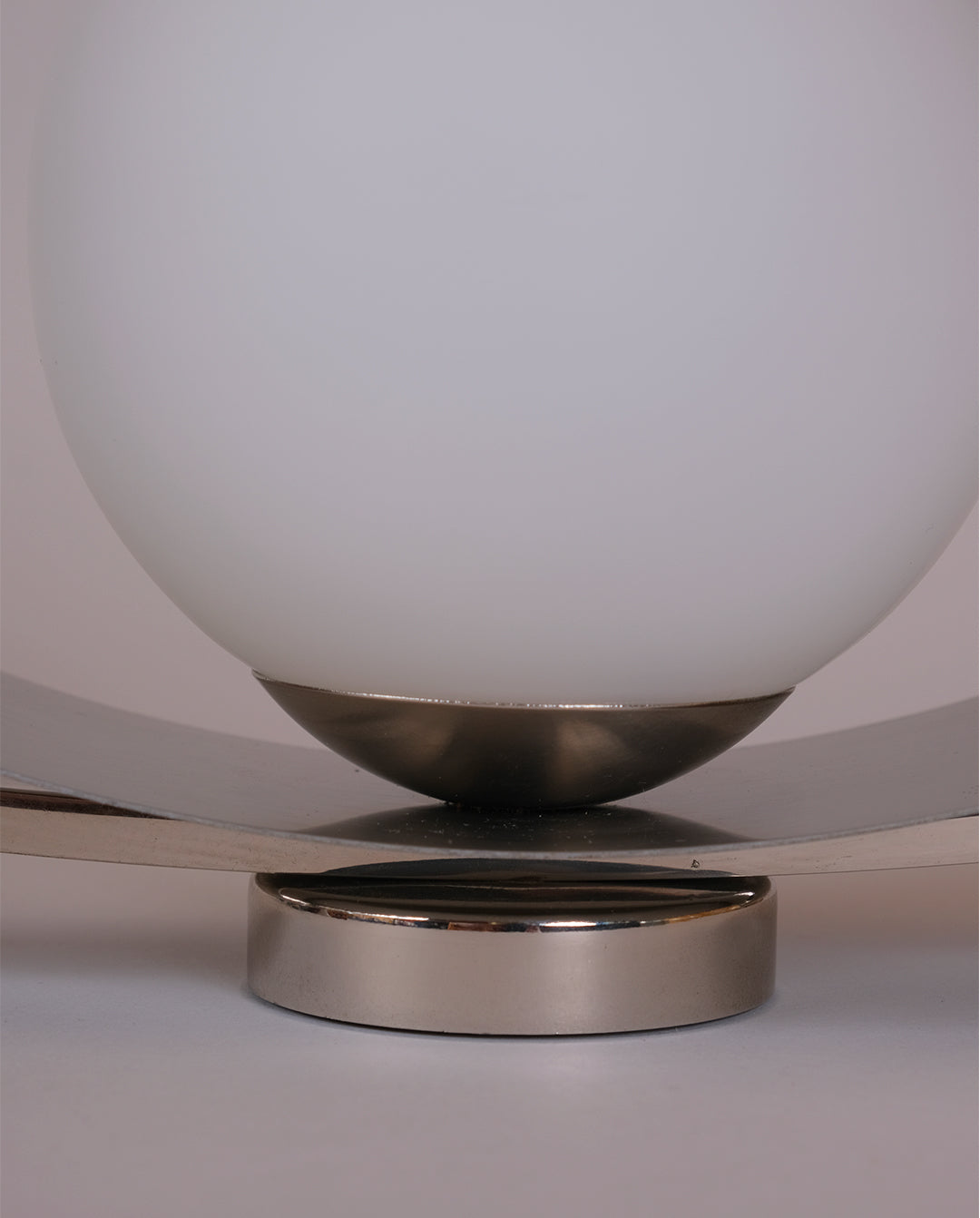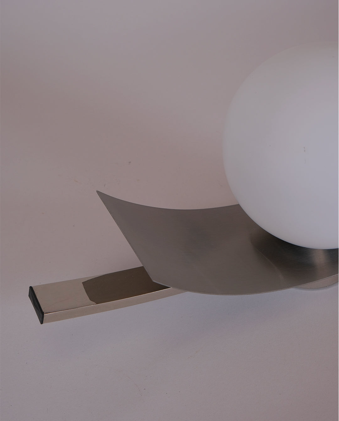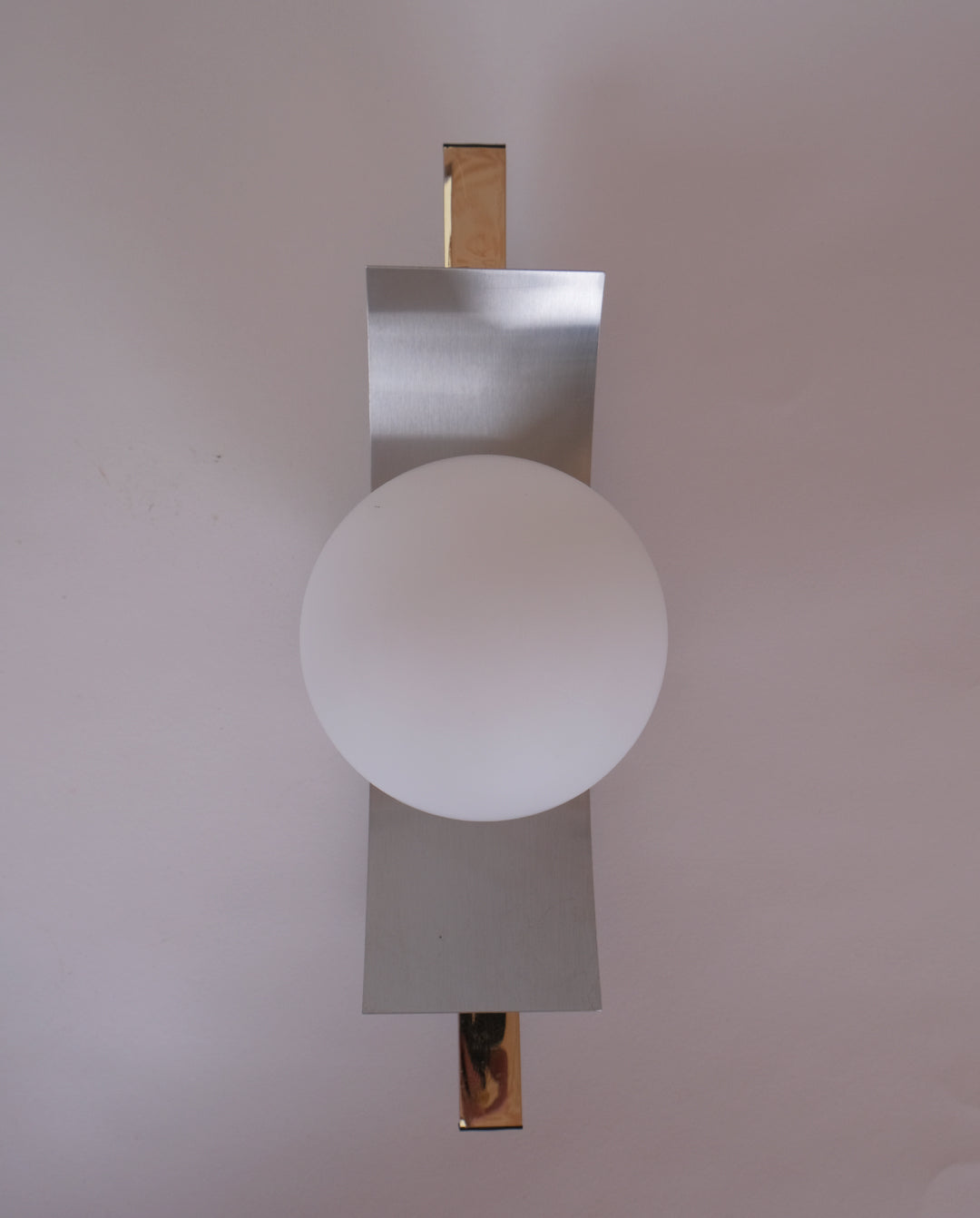 Applique lumineuse murale composée d'une base en aluminum et d'une sphère en verre dépoli.
