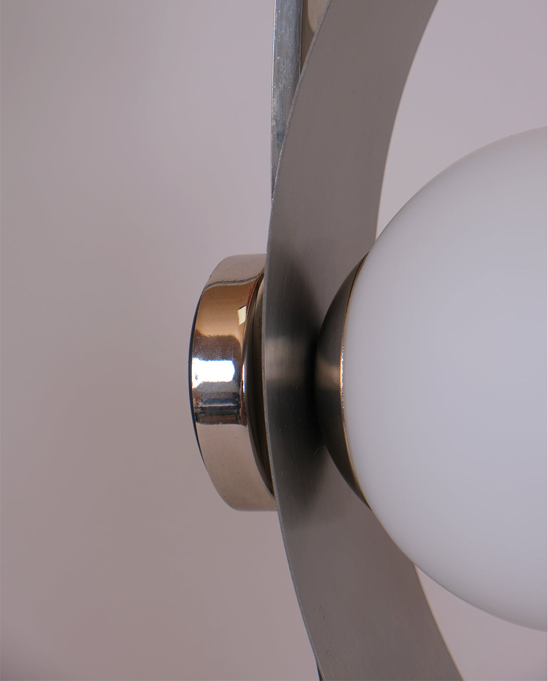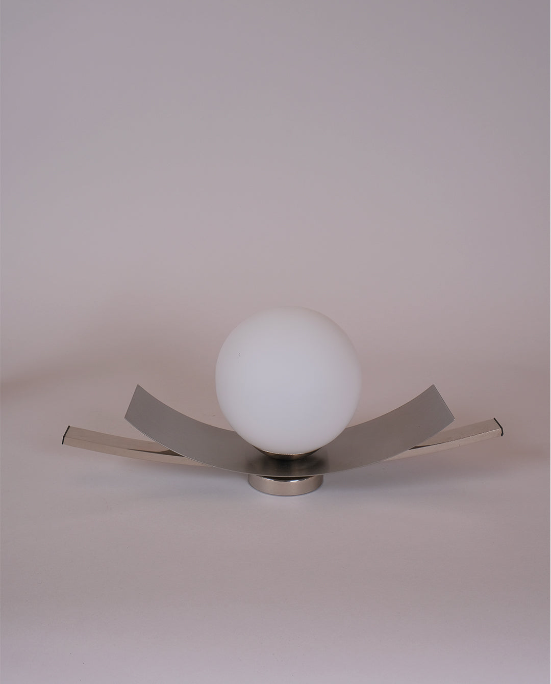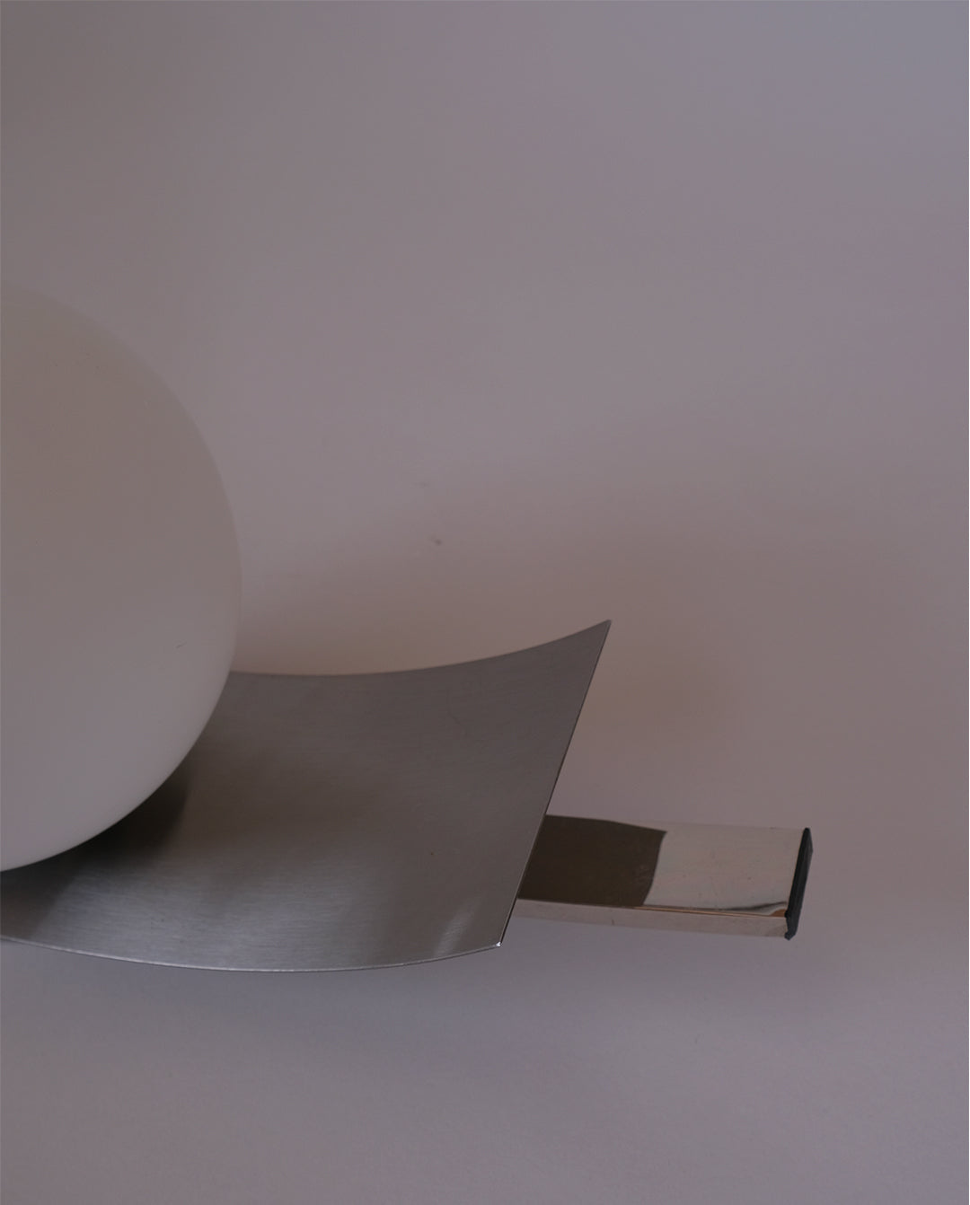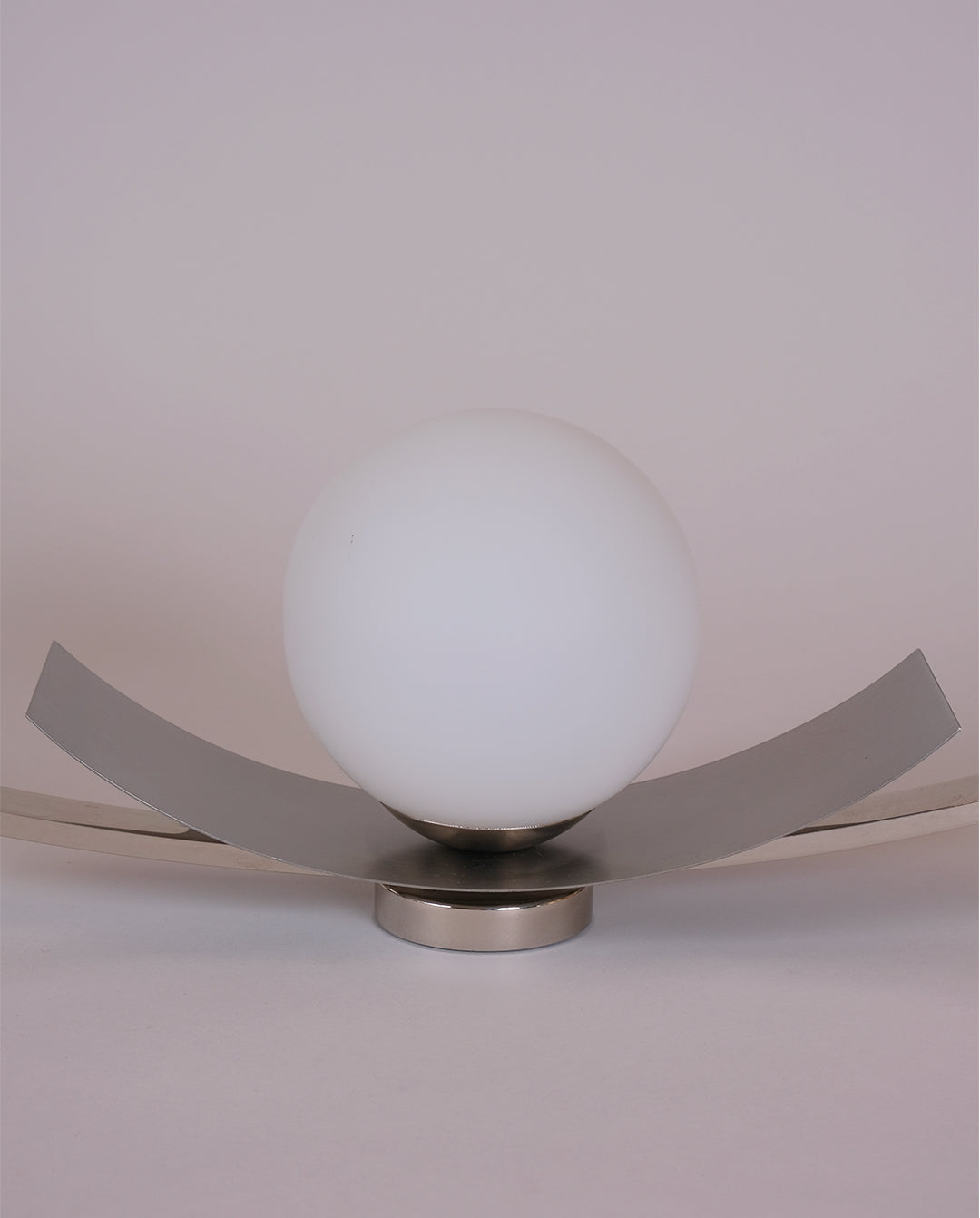 Applique lumineuse murale composée d'une base en aluminum et d'une sphère en verre dépoli.