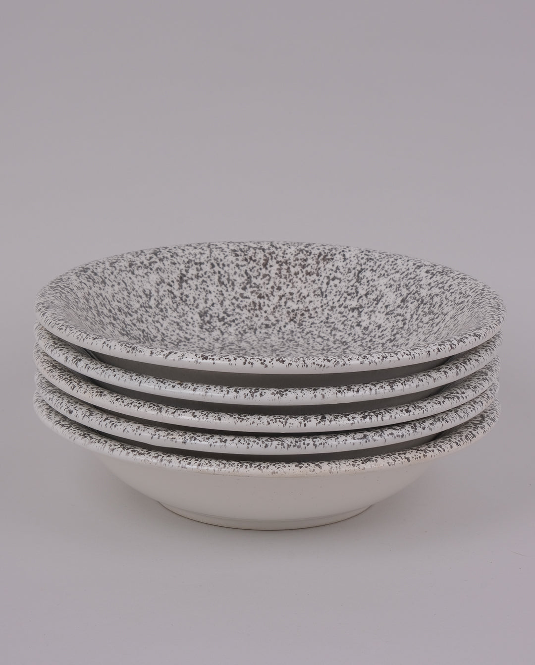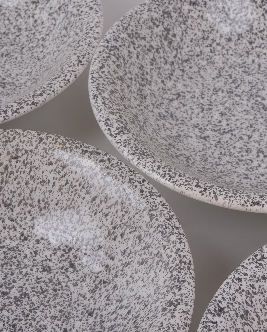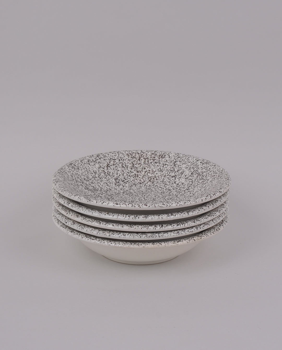 Ensemble de 5 assiettes creuses en faïence mouchetées noir sur fond blanc