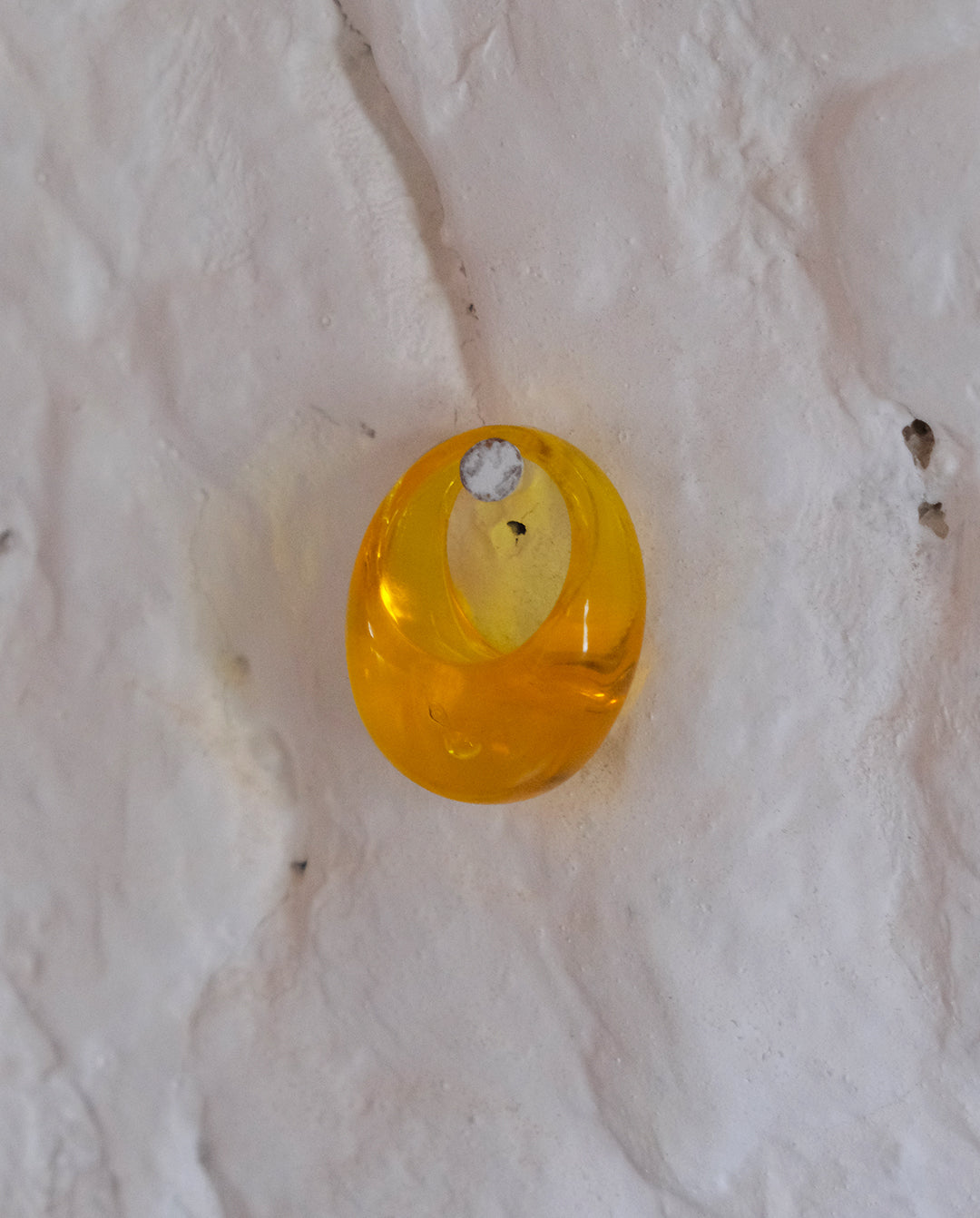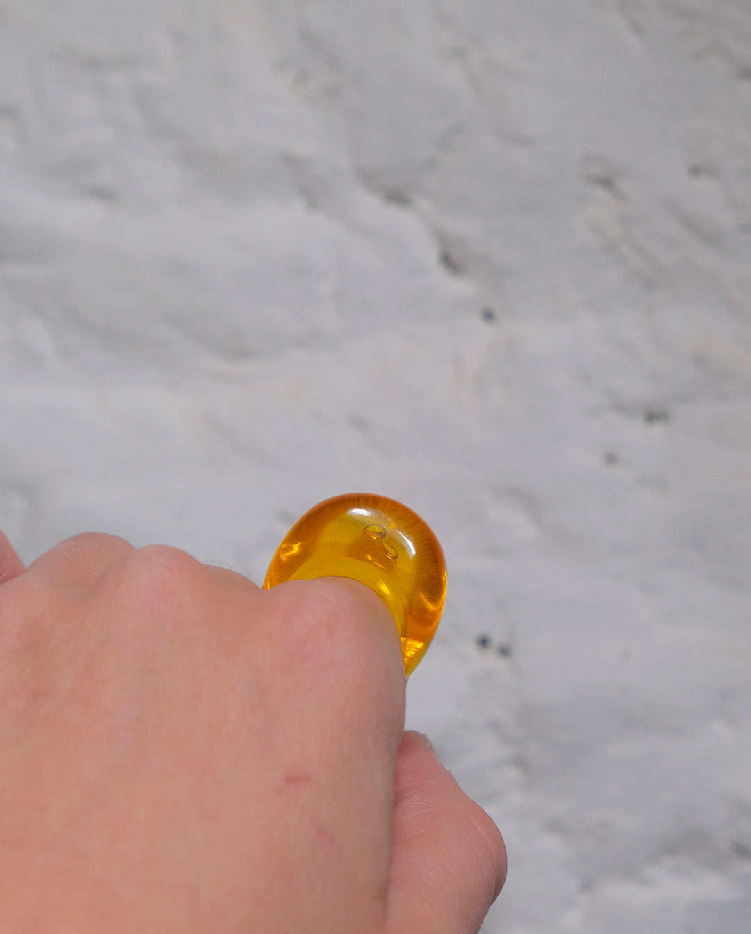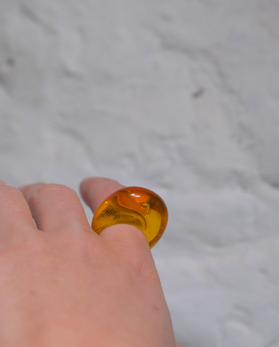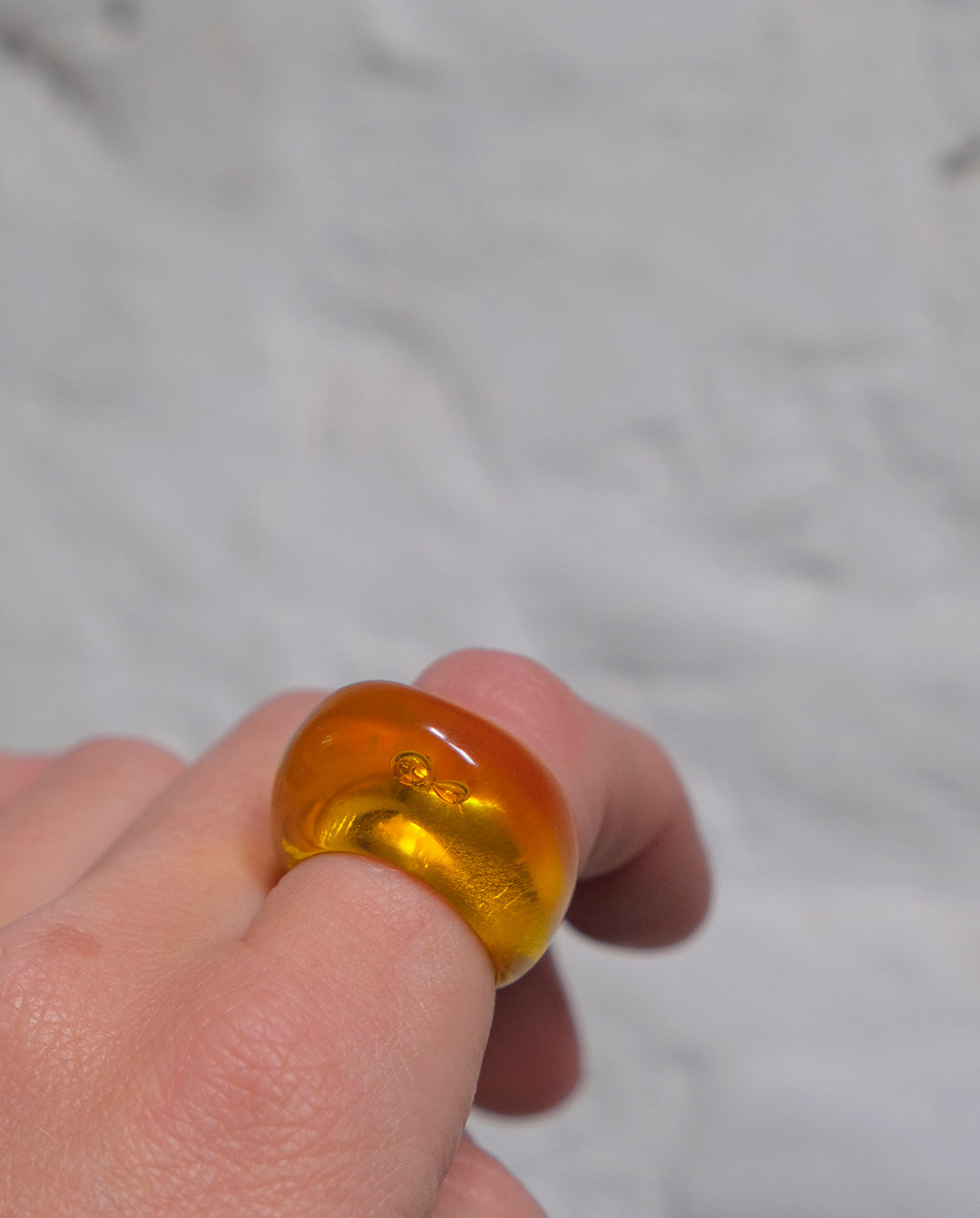 Bague en résine plastique transparente jaune avec des bulles à l'intérieur.