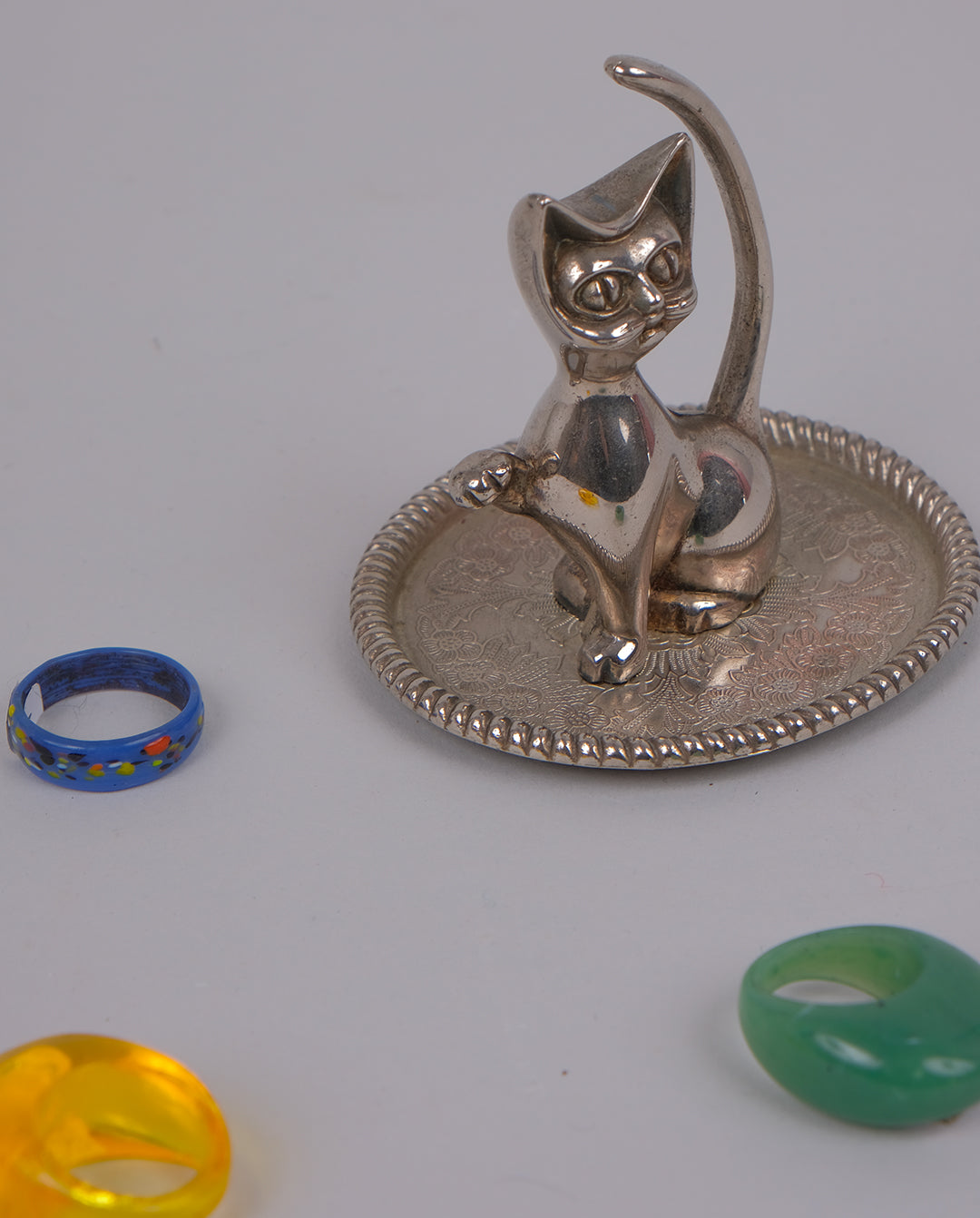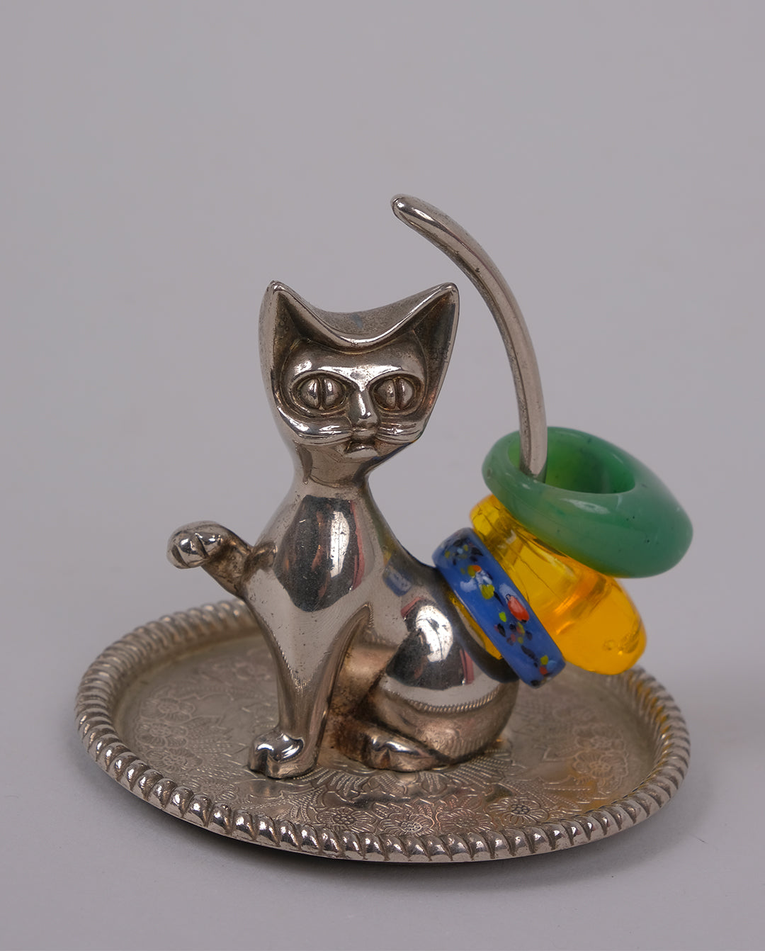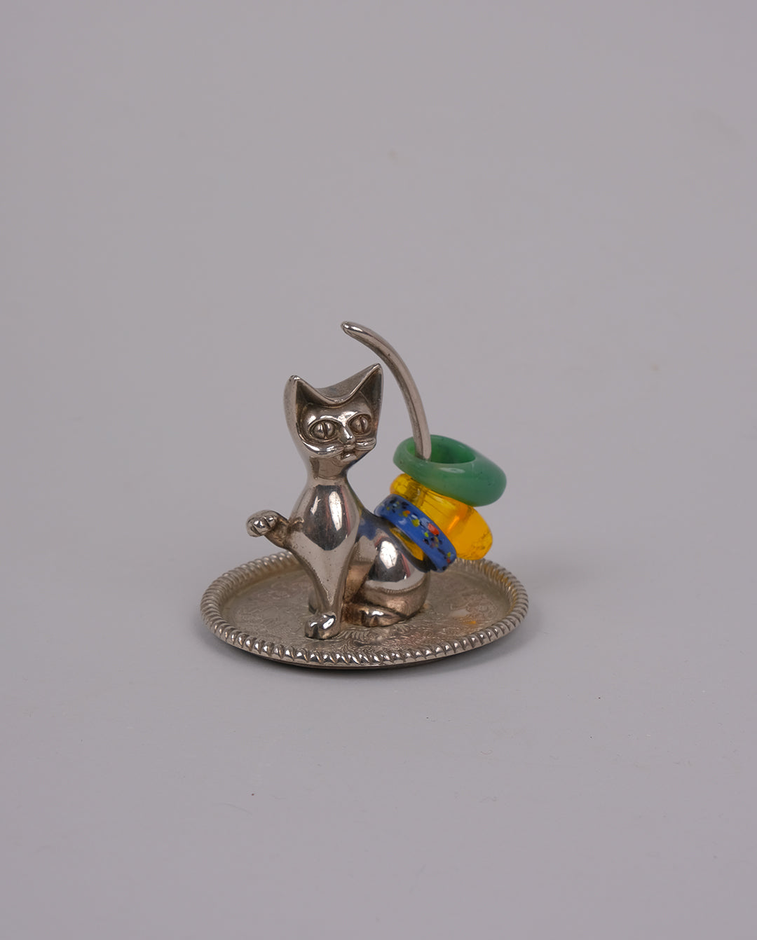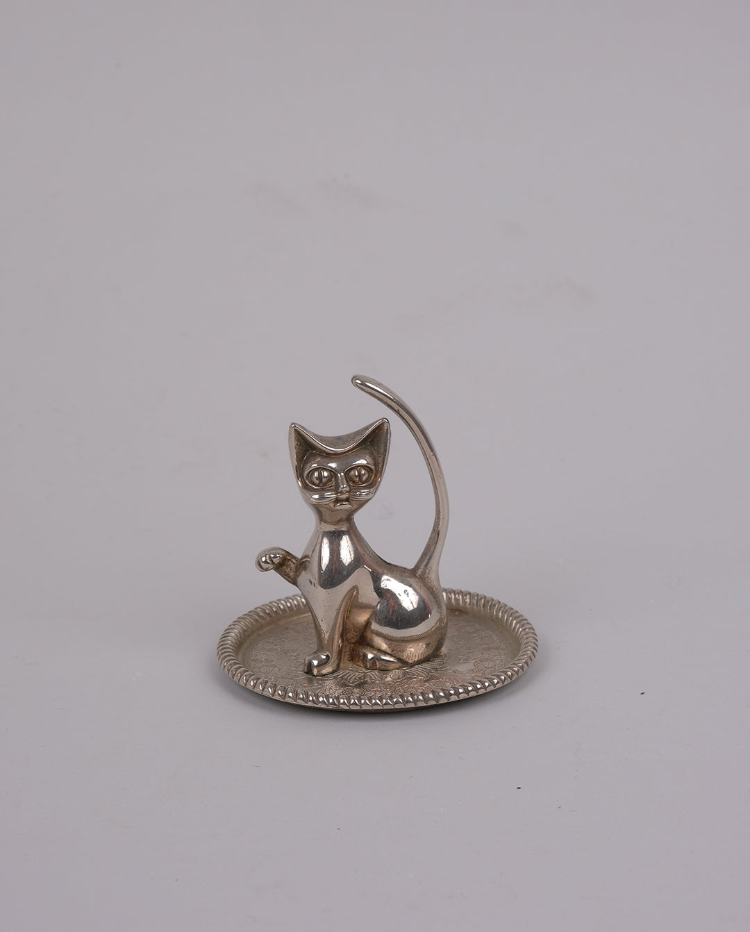 Support à bagues en forme de chat en métal argenté.