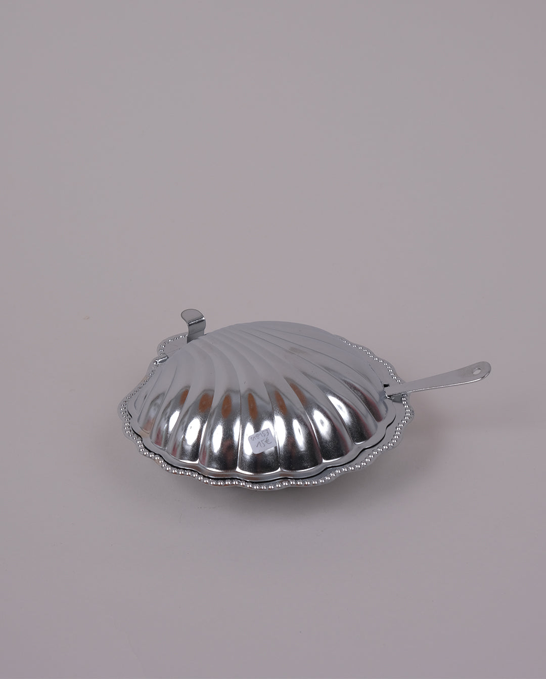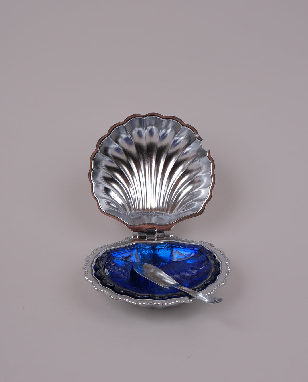 Beurrier en forme de coquille Saint-Jacques en acier inoxydable et verre teinté bleu.