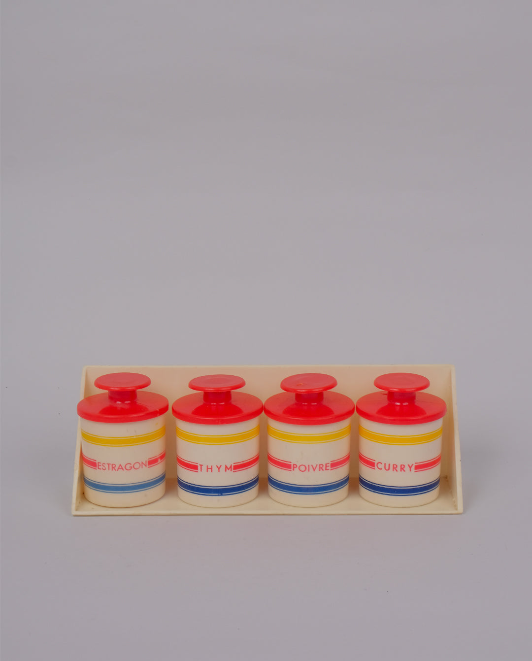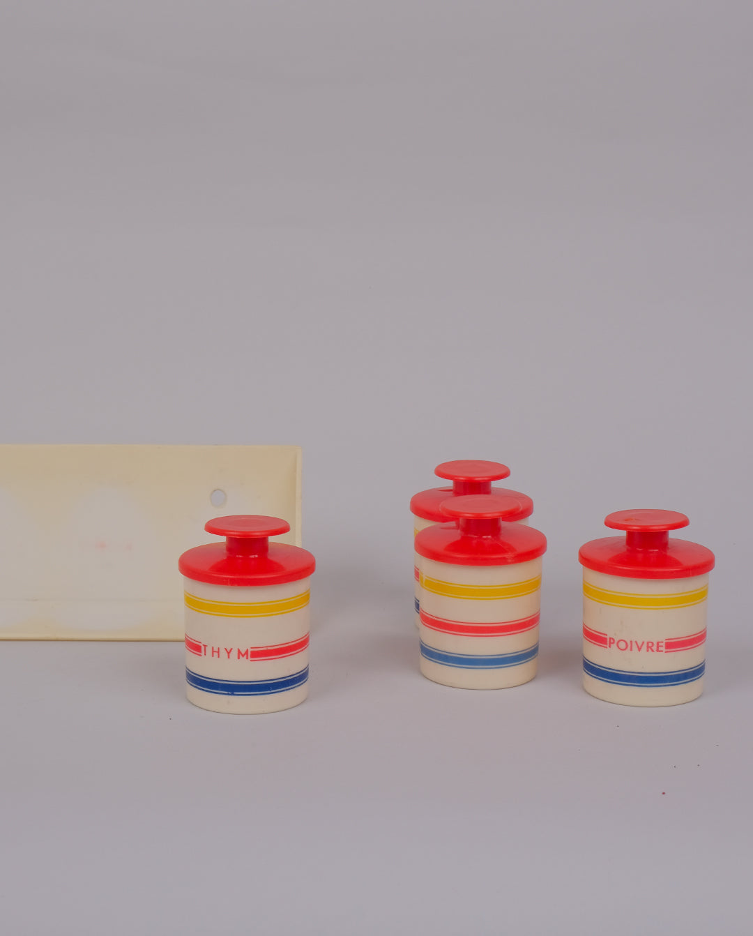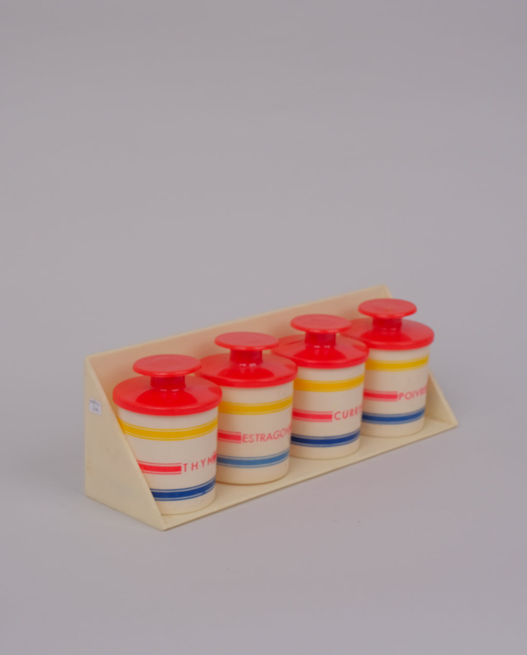 Ensemble composé d’un étagère et de 4 pots à épices en plastique, années 70