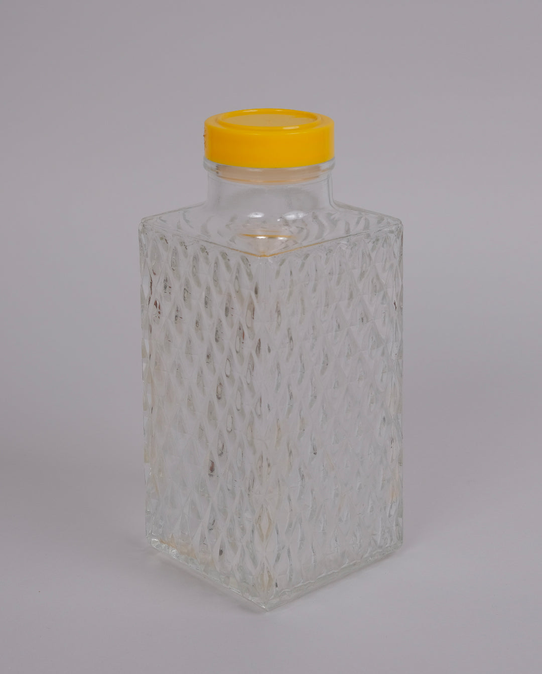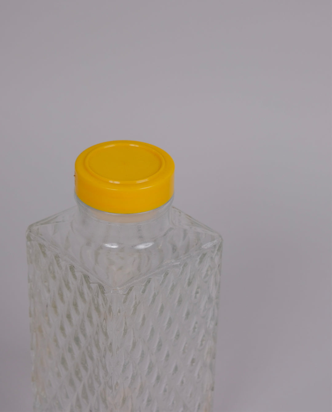 Bouteille vintage en verre facetté et bouchon en plastique jaune, années 80