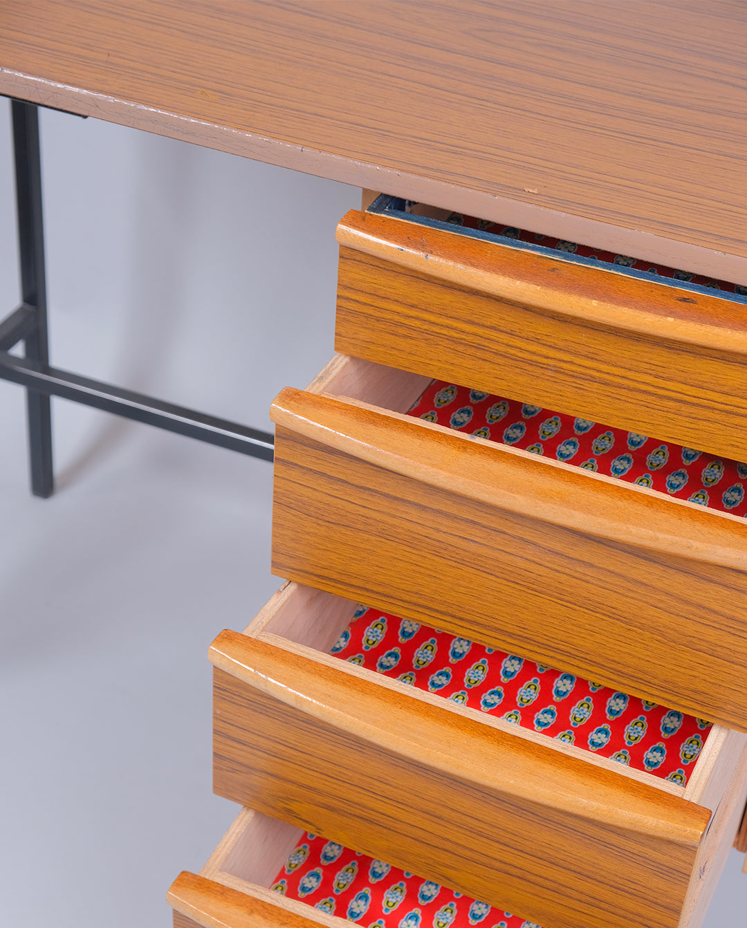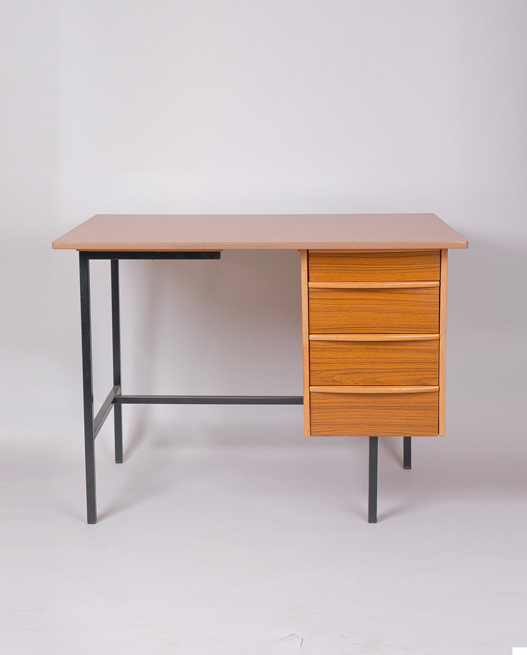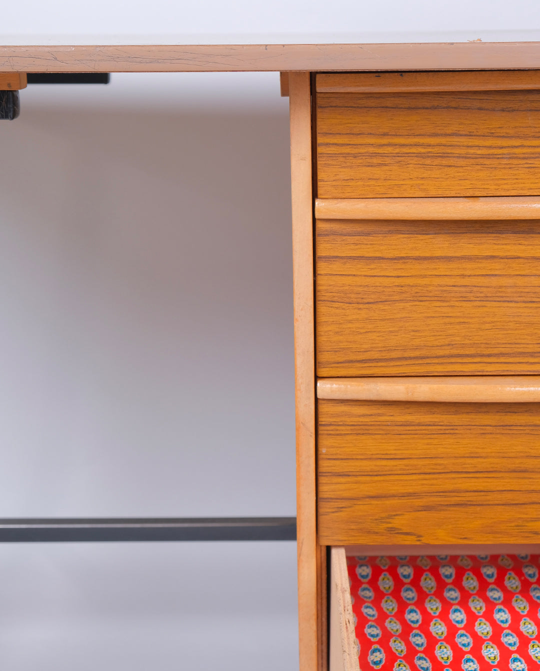 Bureau vintage en formica, style Jacques Hitier. Piétement en métal noir et 4 tiroirs. Bureau adulte ou enfant. Idéal pour les petites espaces.