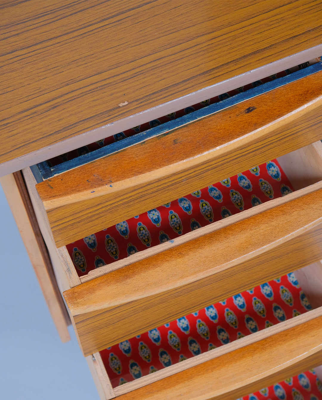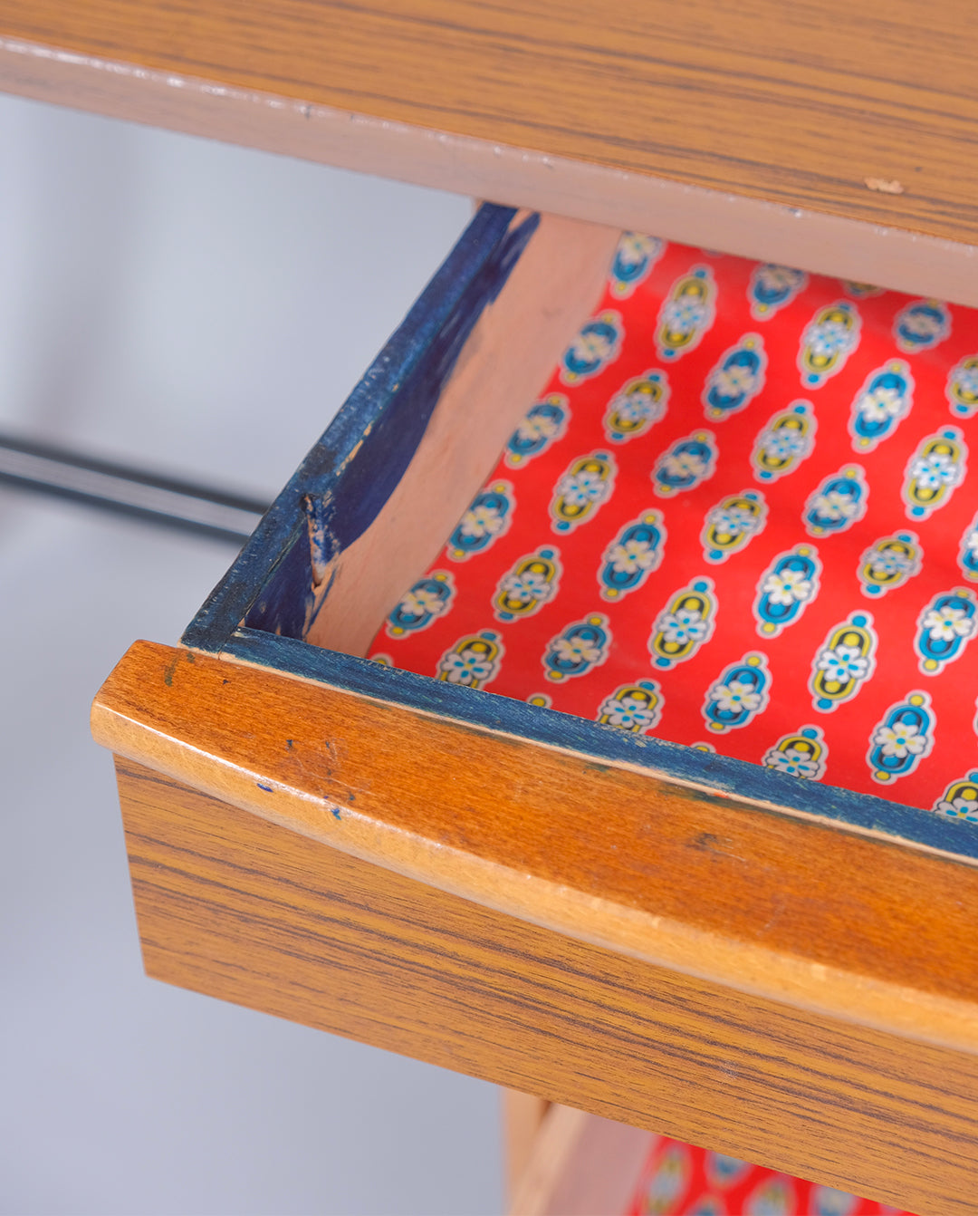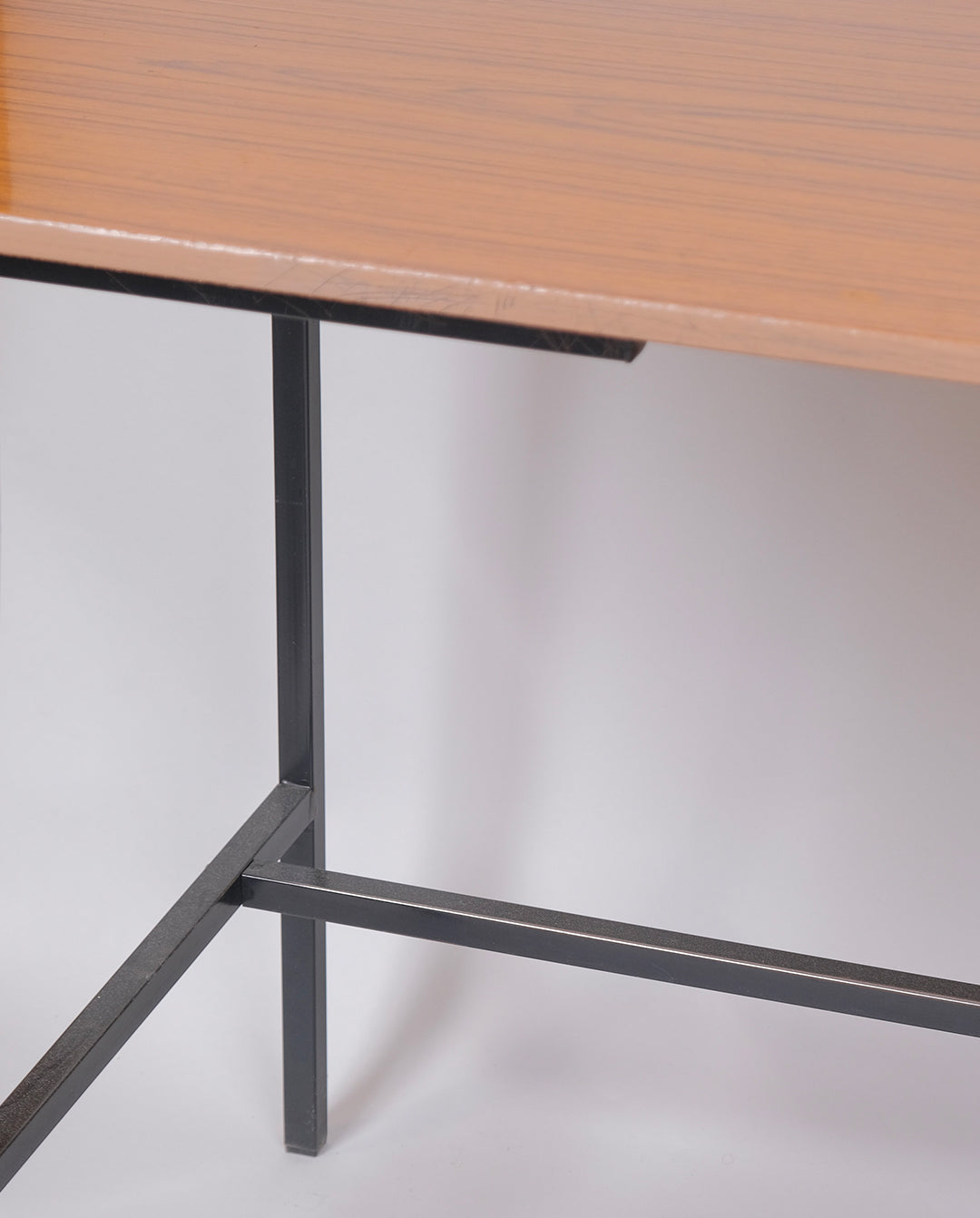 Bureau vintage en formica, style Jacques Hitier. Piétement en métal noir et 4 tiroirs. Bureau adulte ou enfant. Idéal pour les petites espaces.