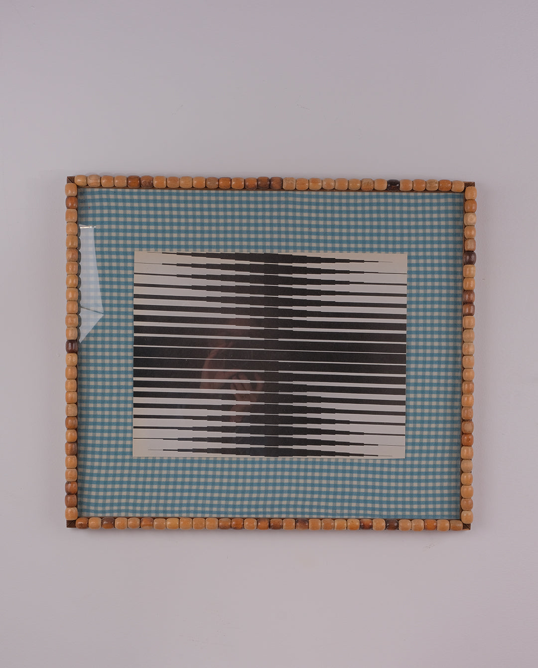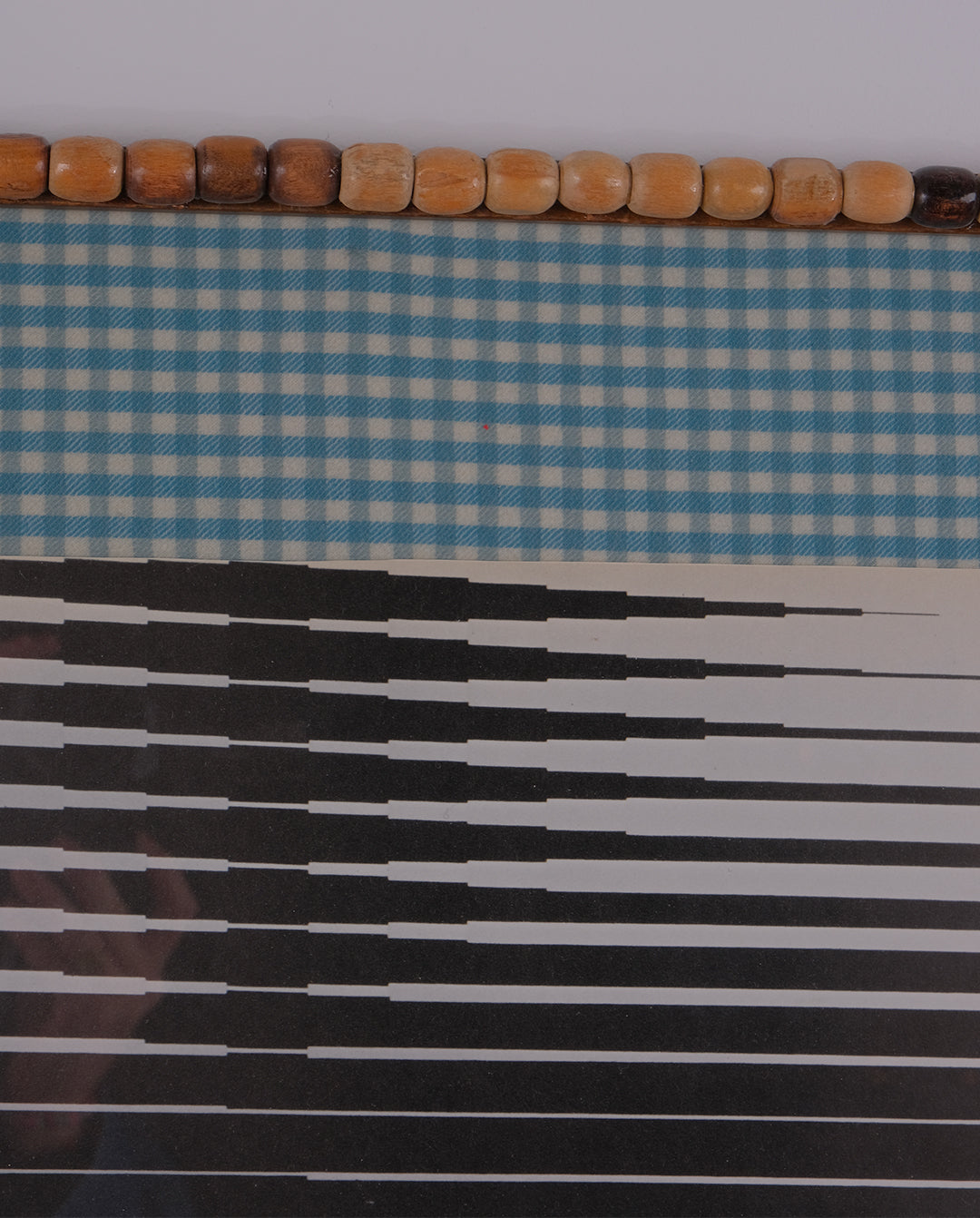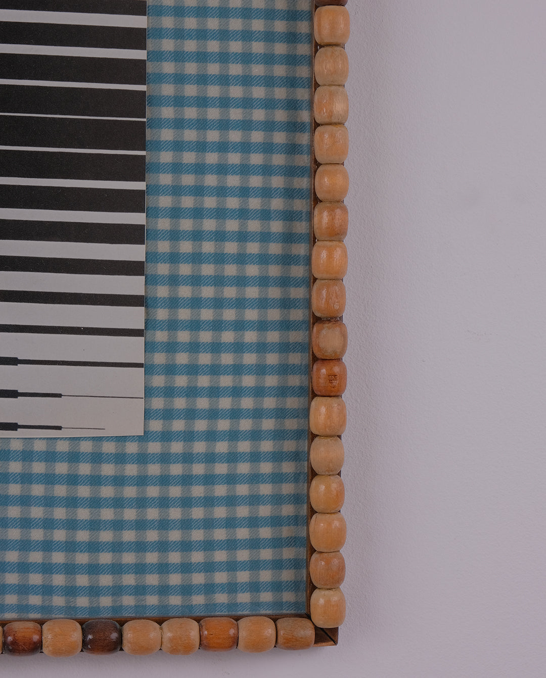 Cadre au contour en perles de bois. Fond en tissus vichy et reproduction d'une oeuvre d'abstraction géométrique.