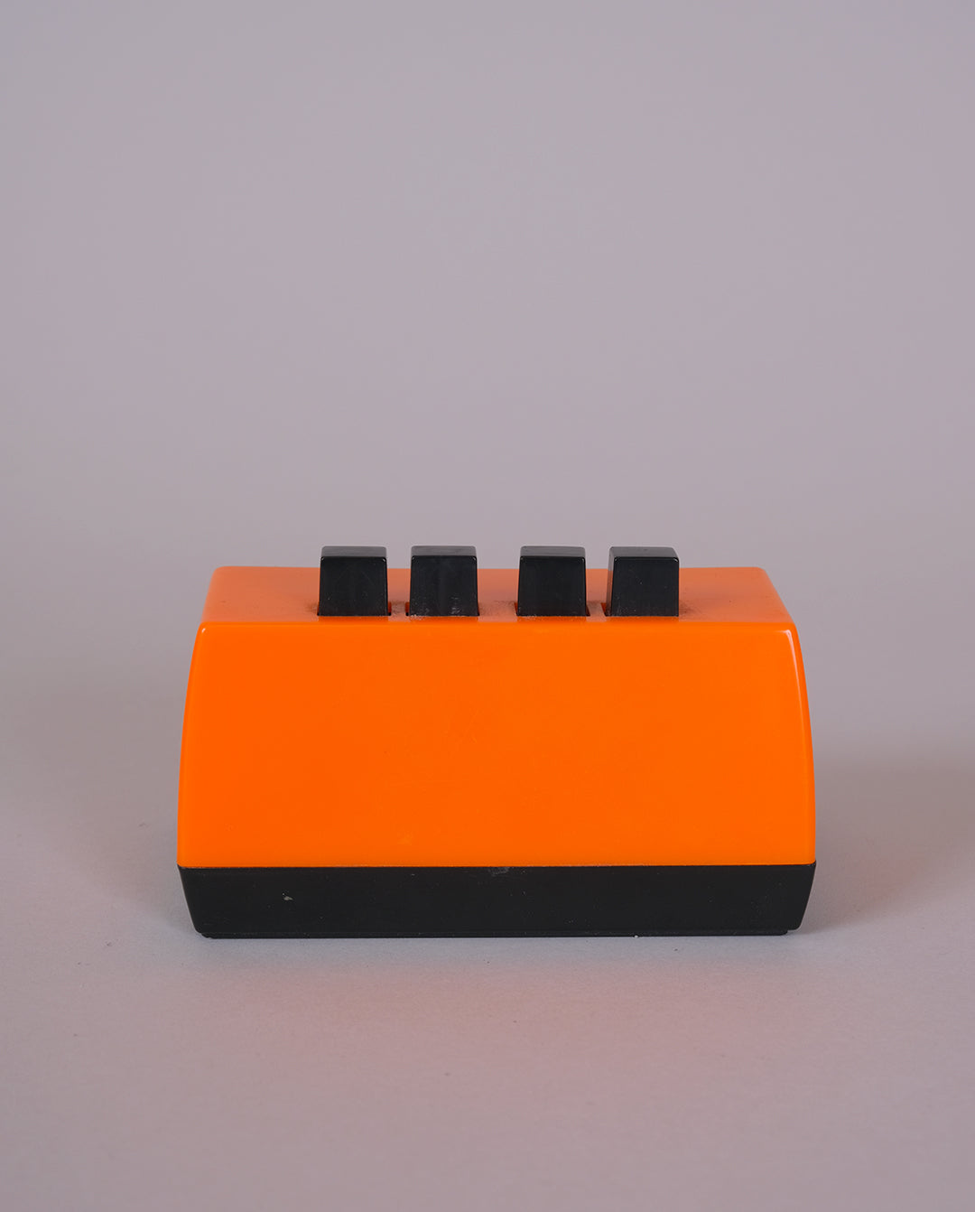 Calendrier perpétuel en plastique orange et noir. Objet des années 70 en parfait état de fonctionnement.