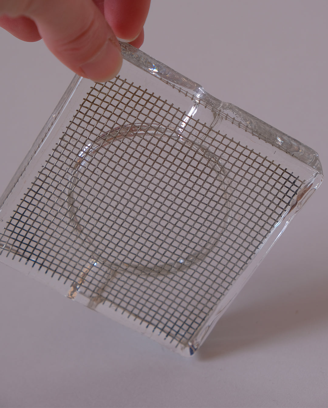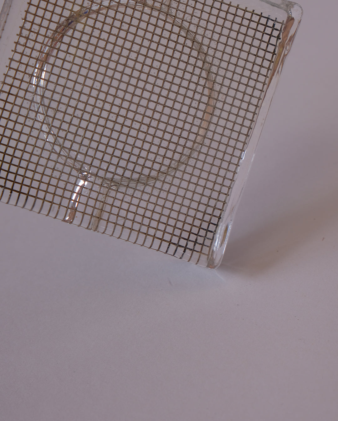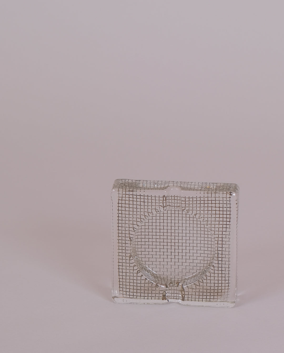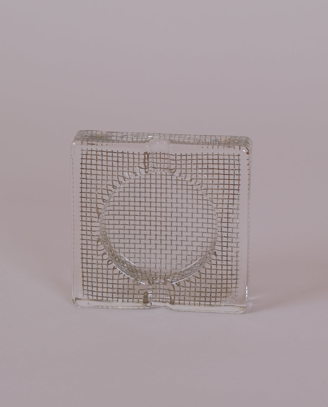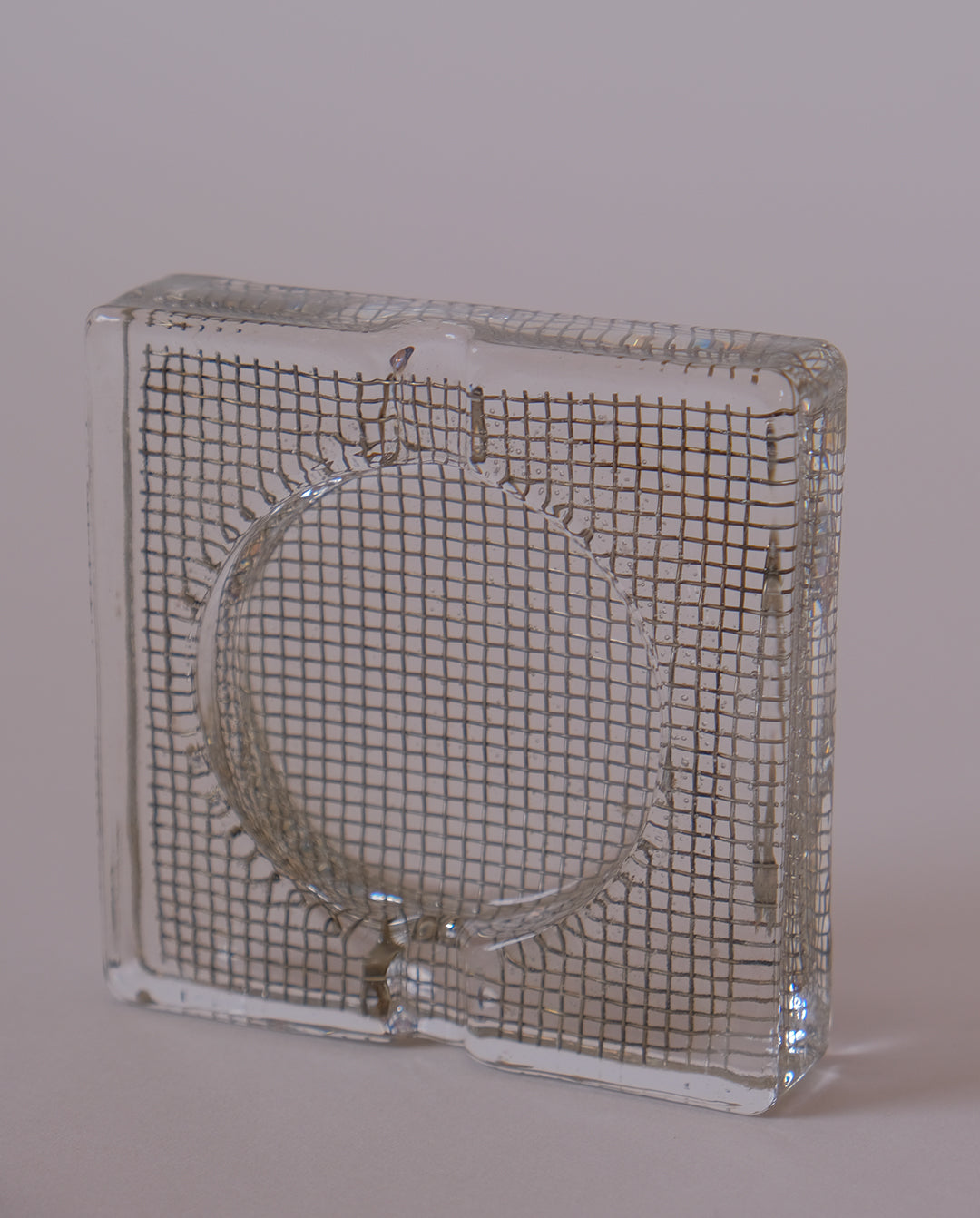 Cendrier carré en verre incrusté d'une délicate feuille de grillage métallique.