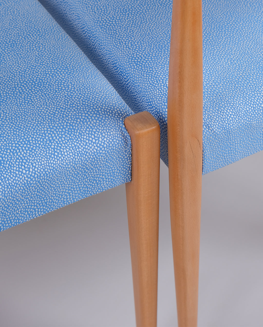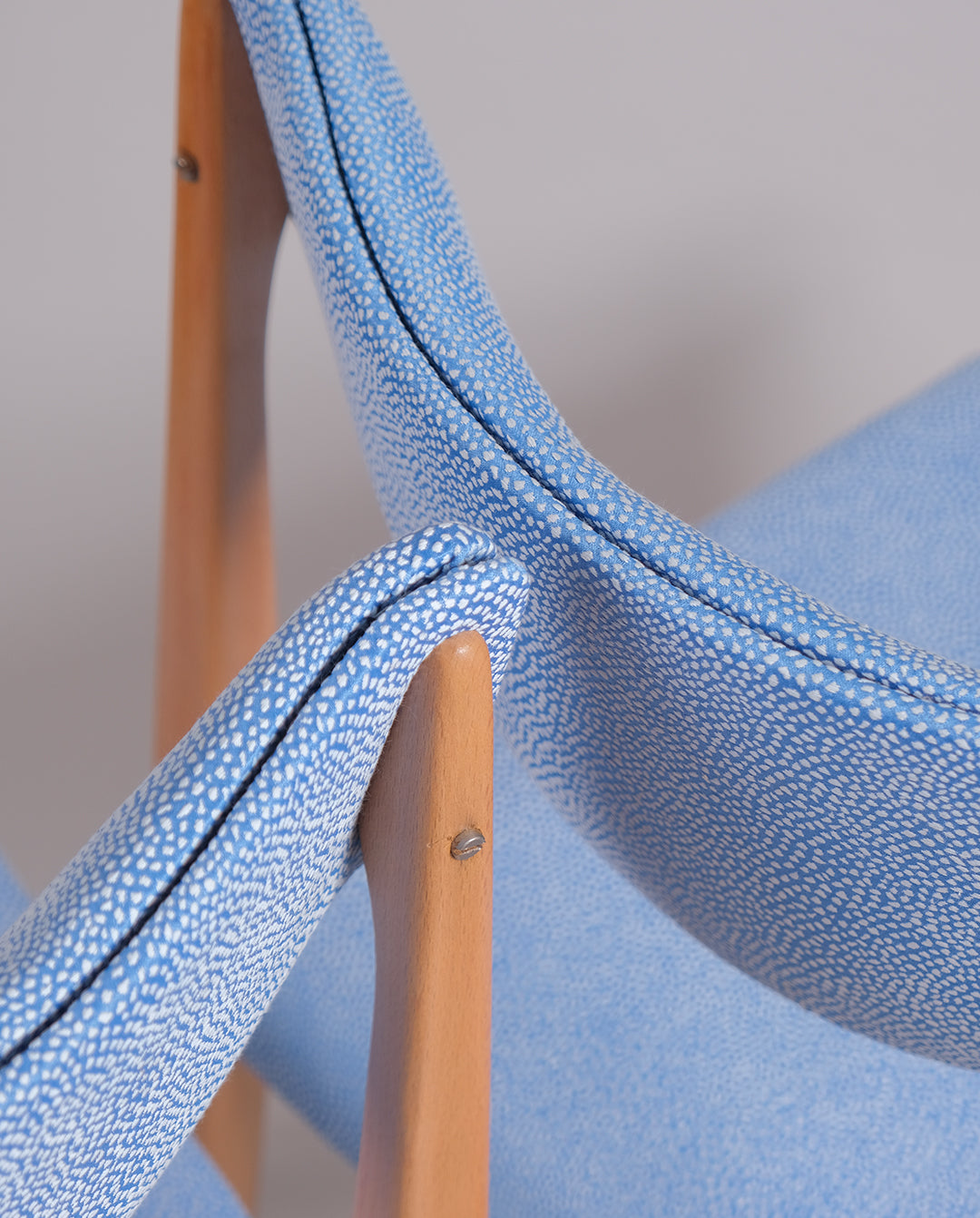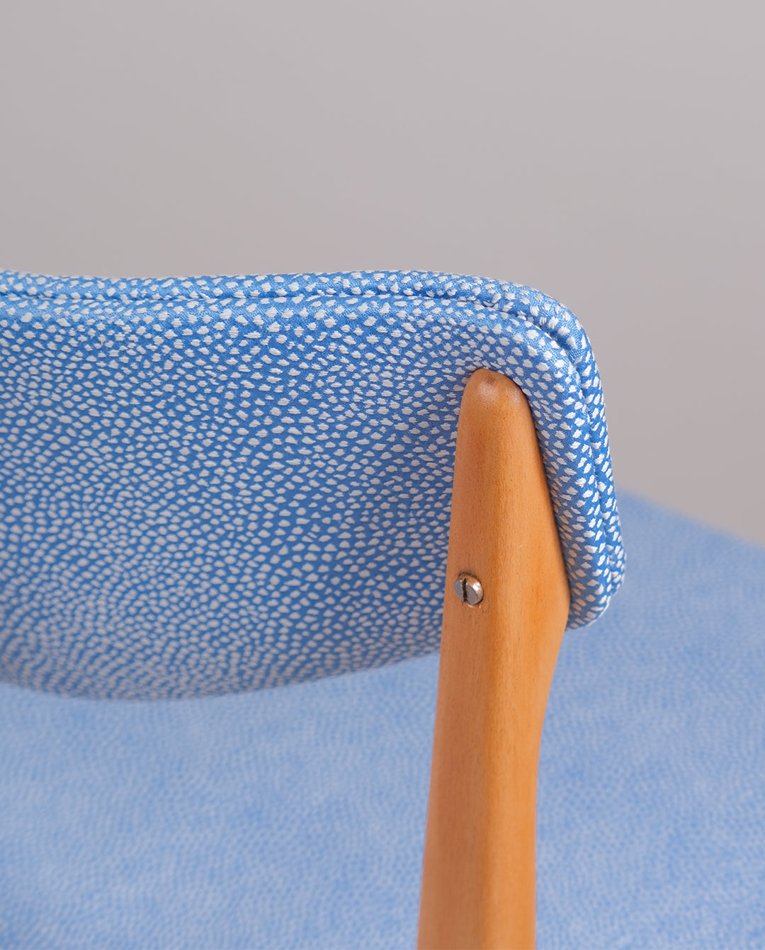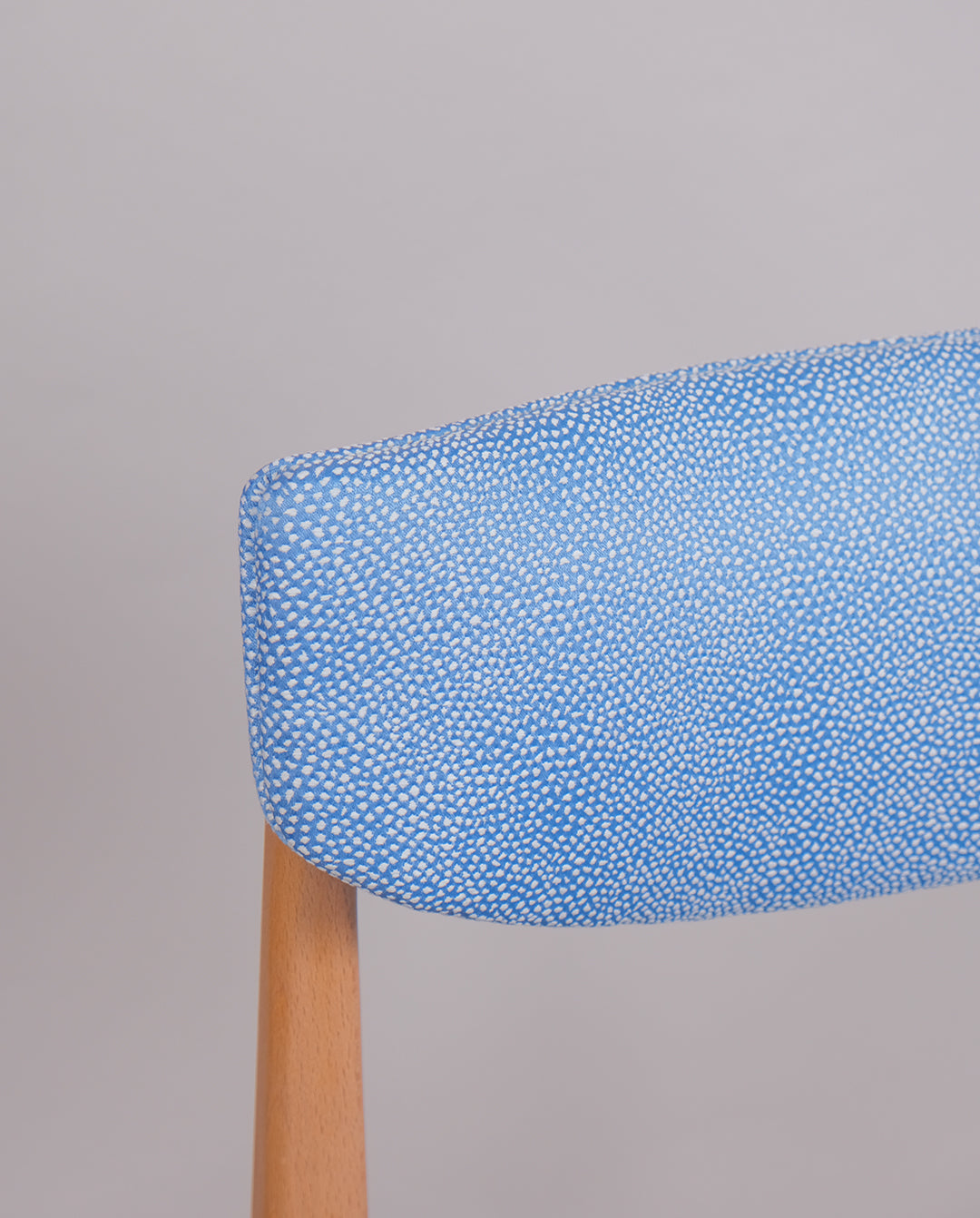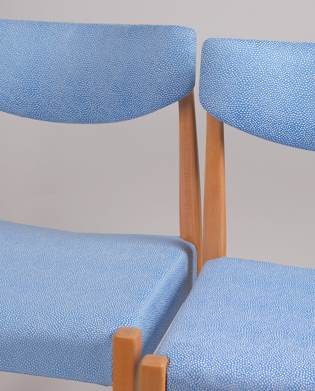 Paire de chaise en hêtre restaurées et retapissées à l'atelier. Assises et dossiers garnis de mousse et recouverts d'un tissus texturé bleu à pois blanc.