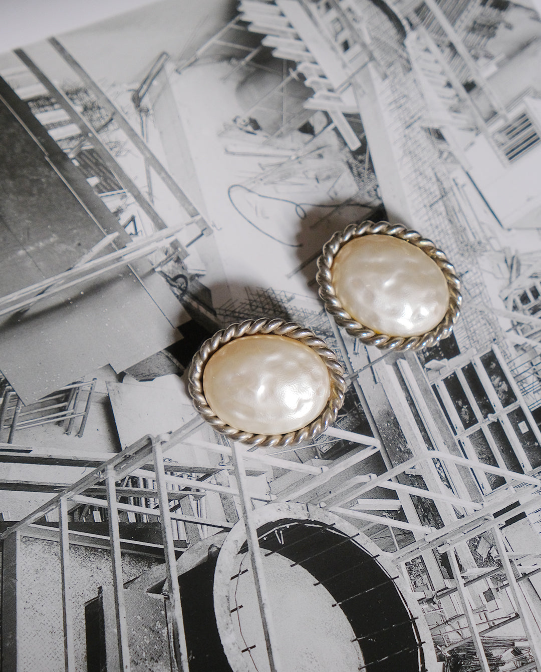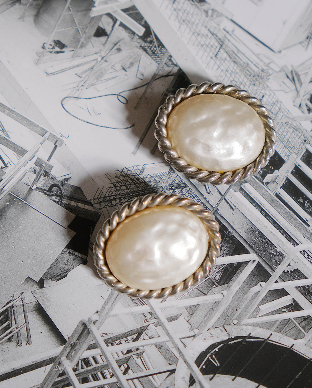 Paire de clips d'oreille Édouard Rambaud, en métal argenté et perle fantaisie blanche.