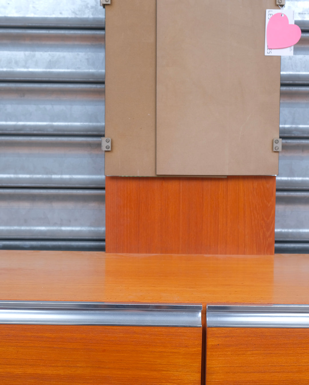 Coiffeuse en placage de teck et aluminium composée de deux tiroir et d'un miroir triptyque.