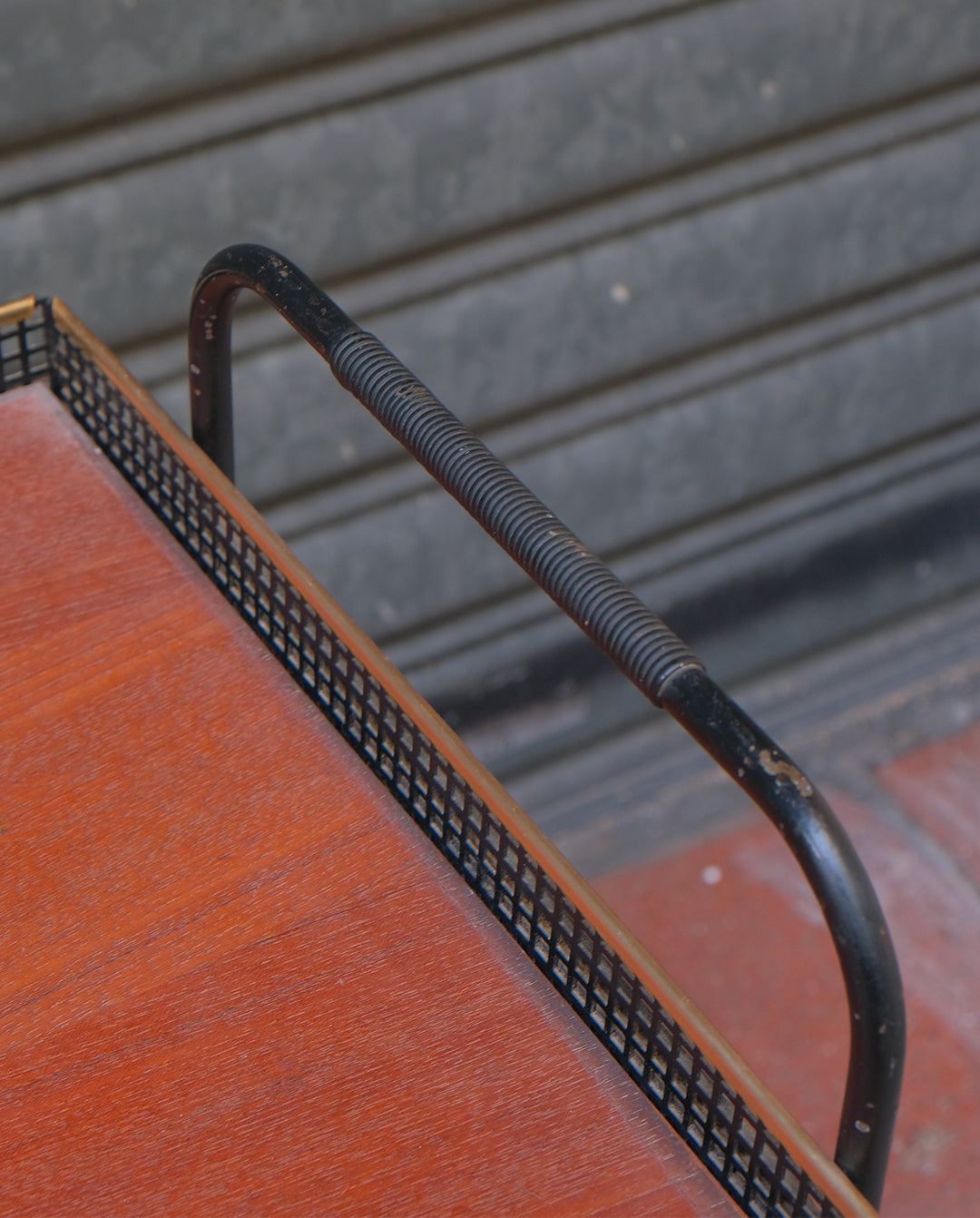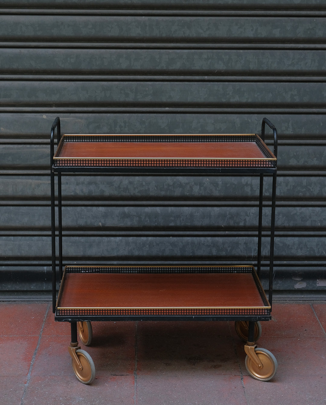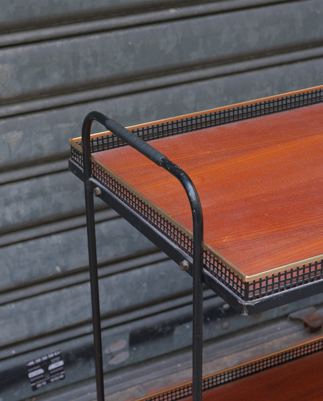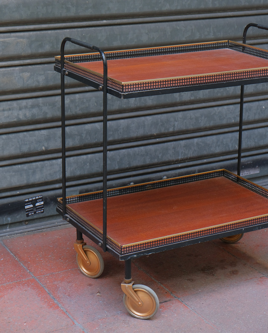 Desserte ou charriot en fer et teck sur grandes roulettes, années 60