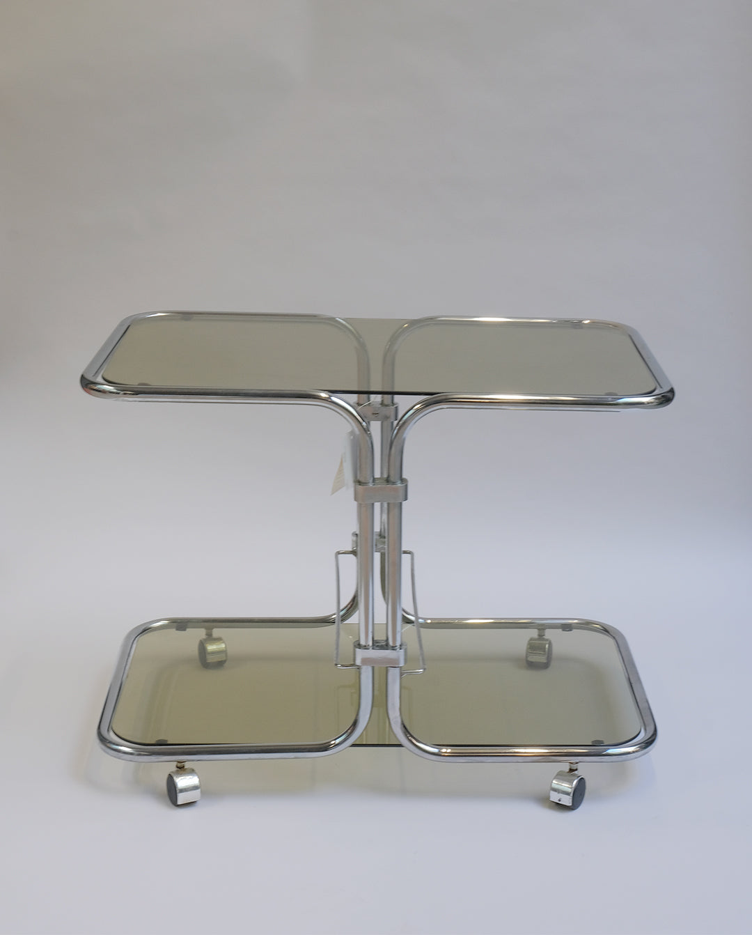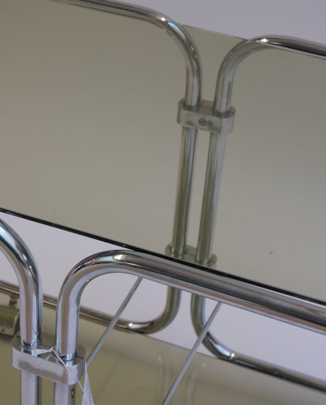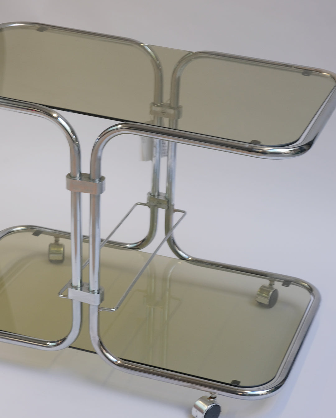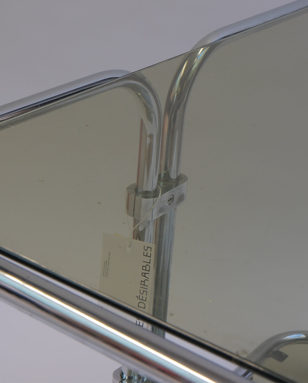 Desserte à roulettes en métal chromé et plateaux en verre fumé. Peut être utiliser en table basse. Emplacement pour les bouteilles au niveau du centre de la partie inférieure.