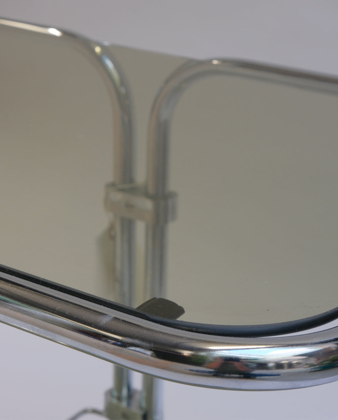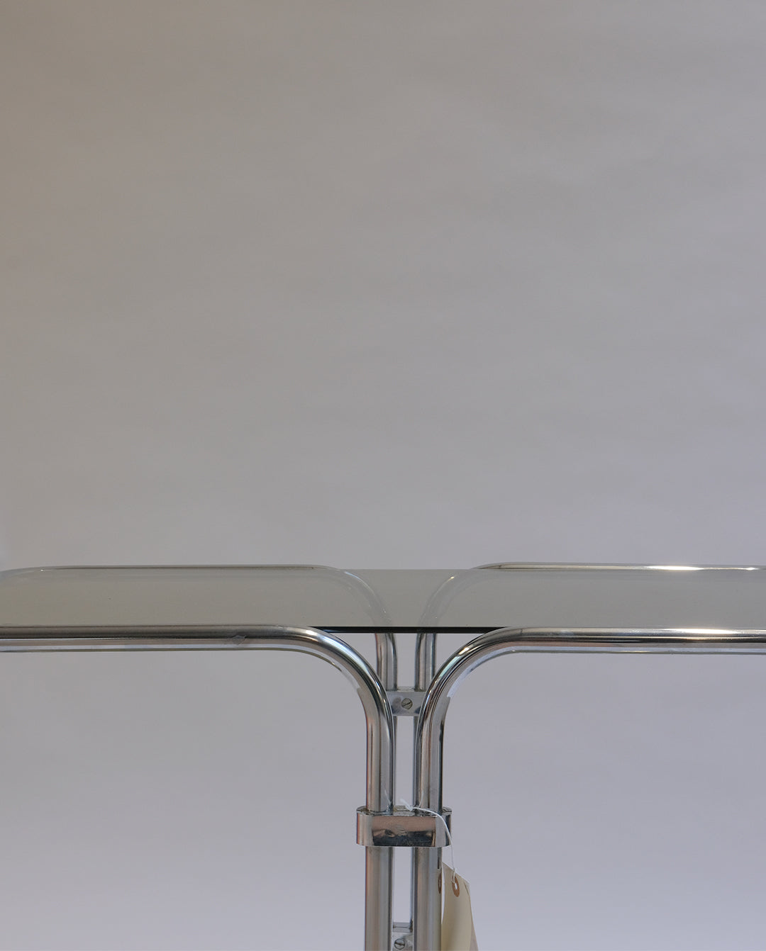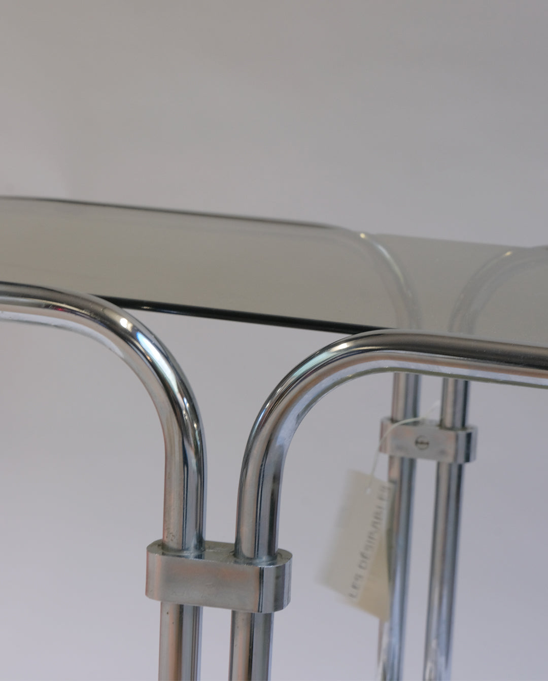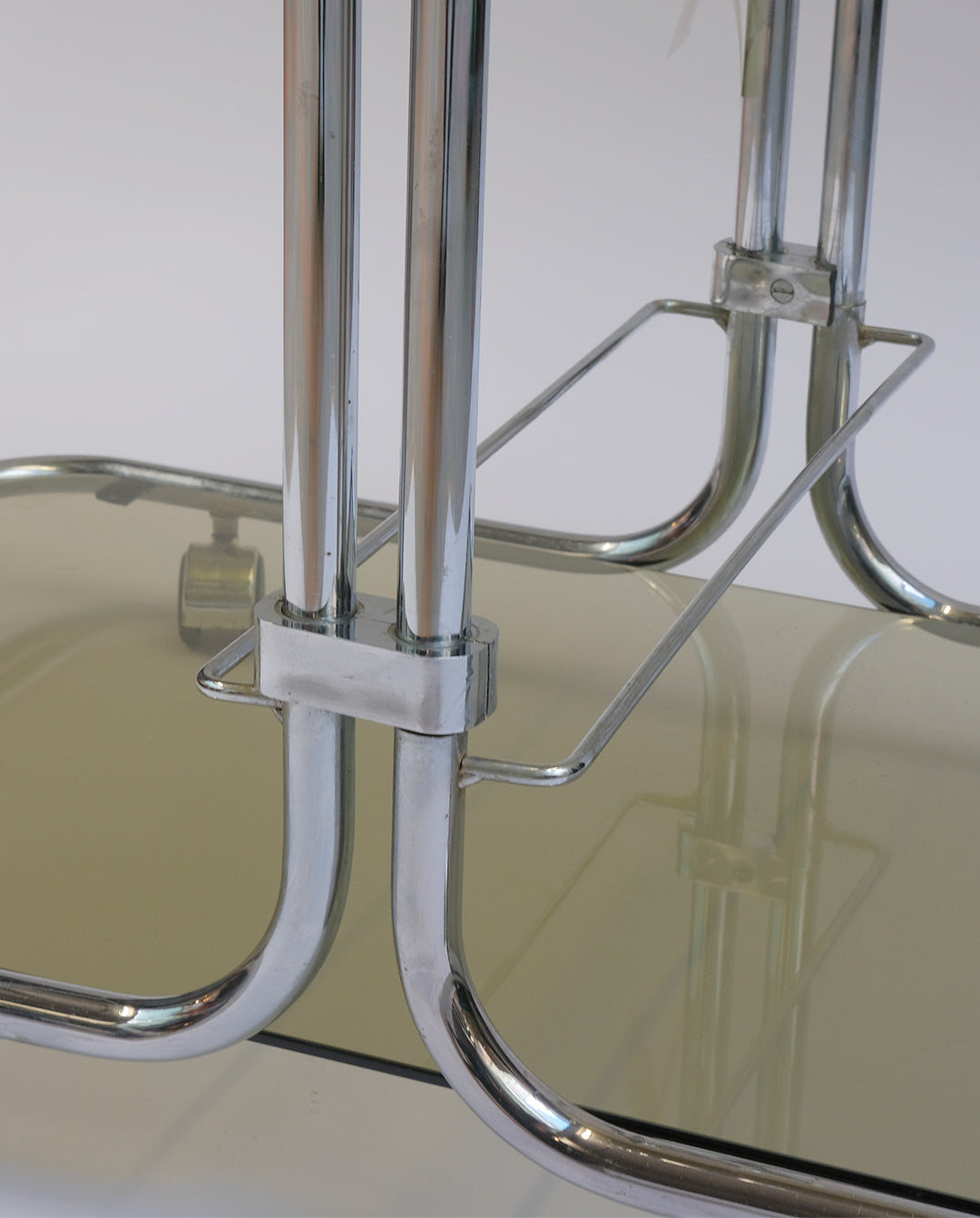 Desserte à roulettes en métal chromé et plateaux en verre fumé. Peut être utiliser en table basse. Emplacement pour les bouteilles au niveau du centre de la partie inférieure.