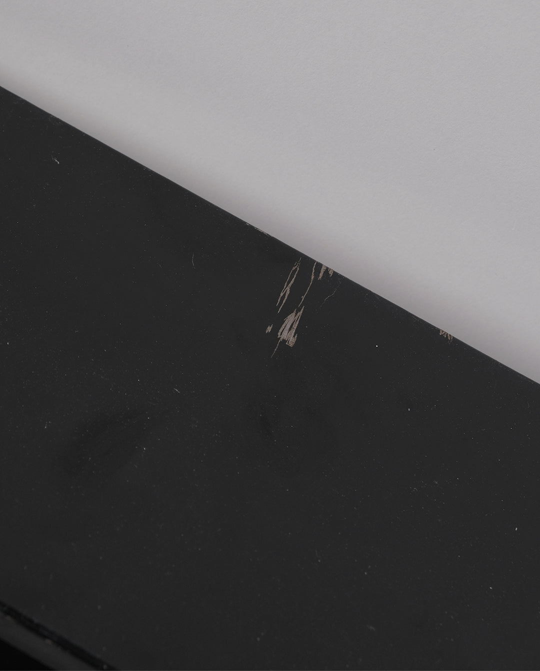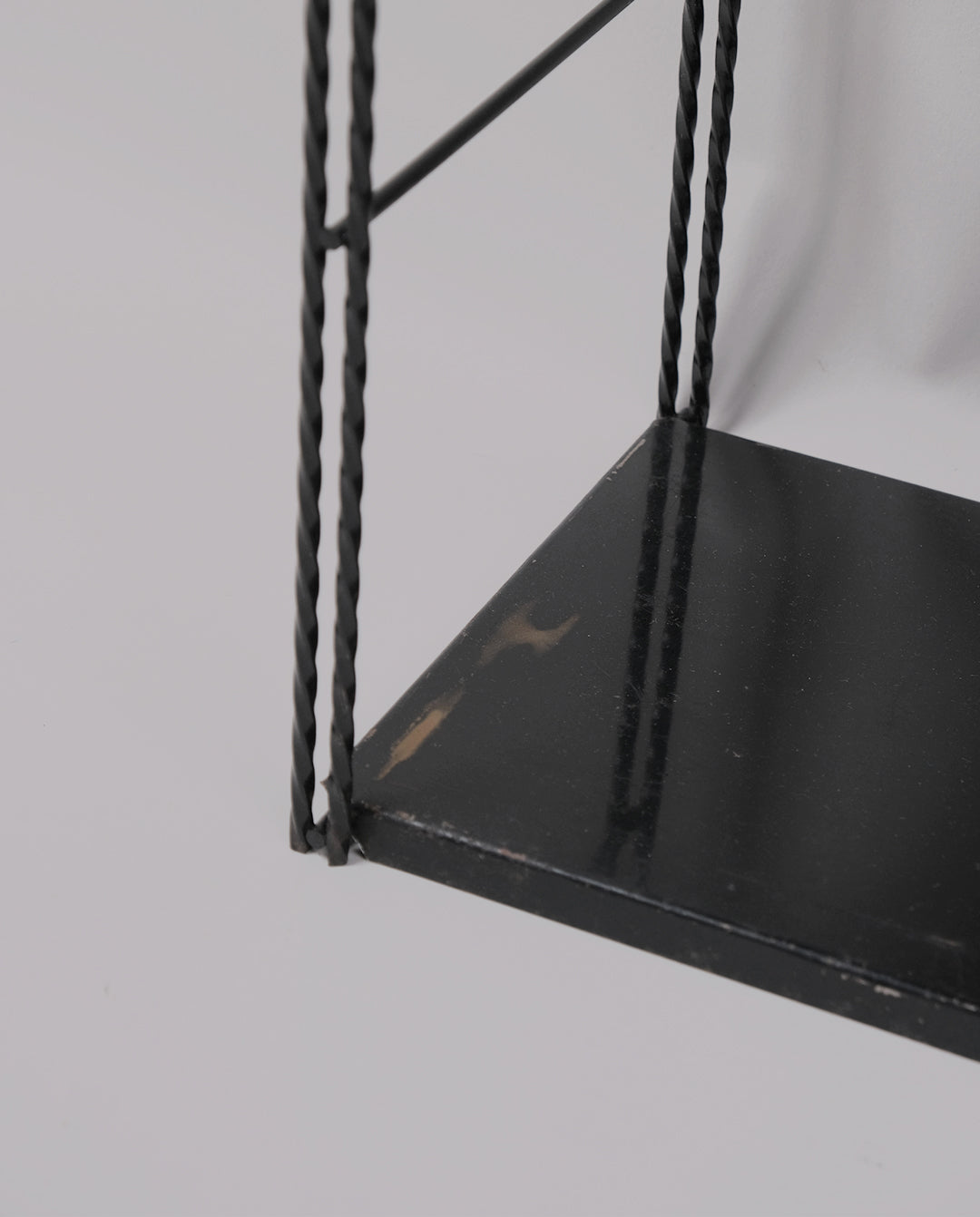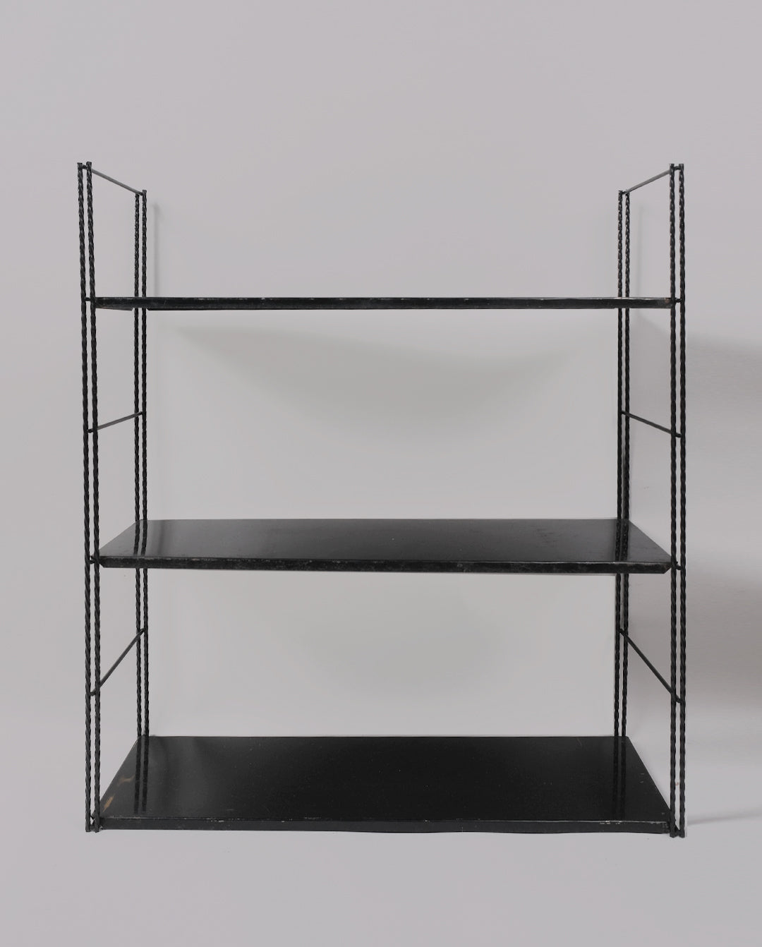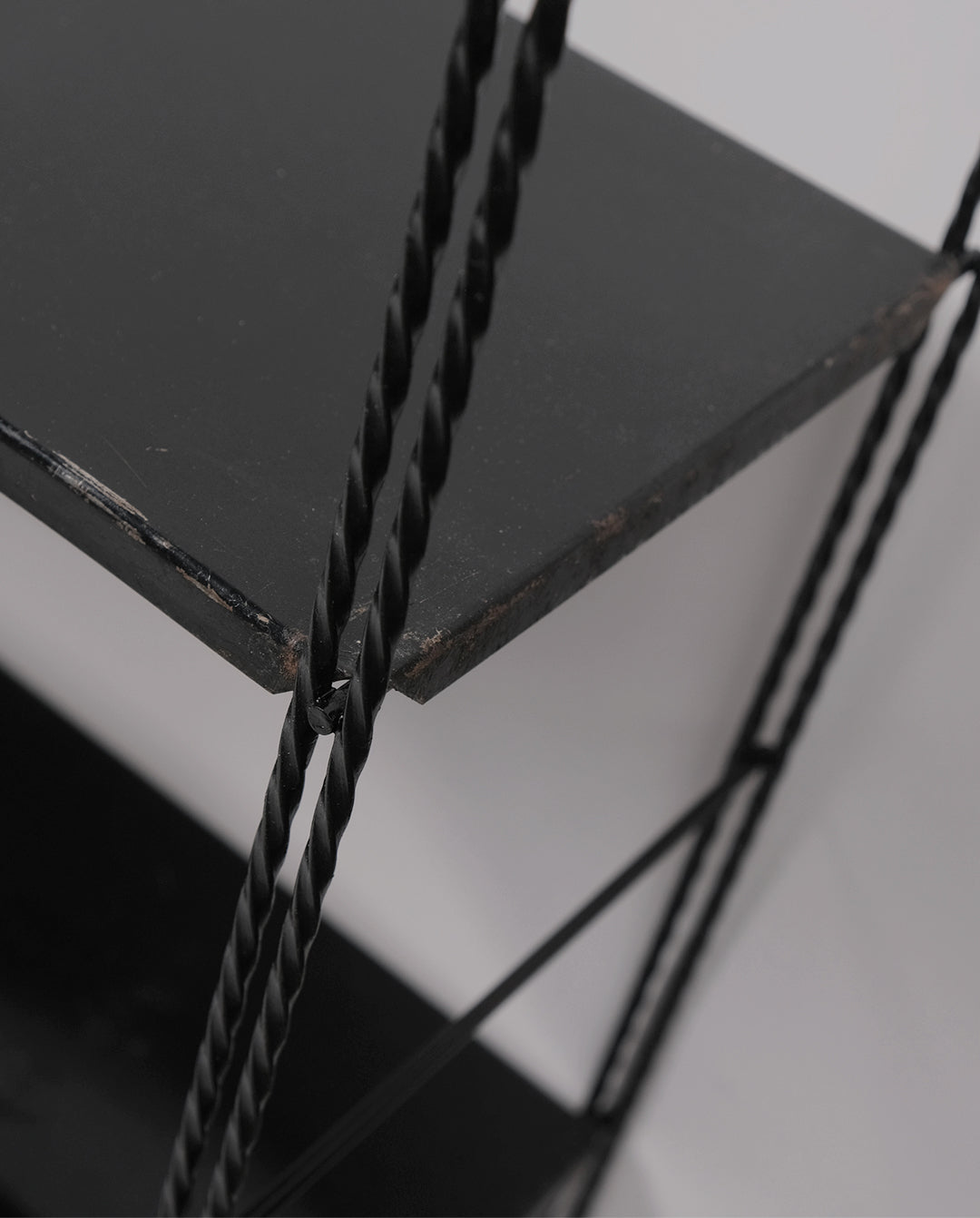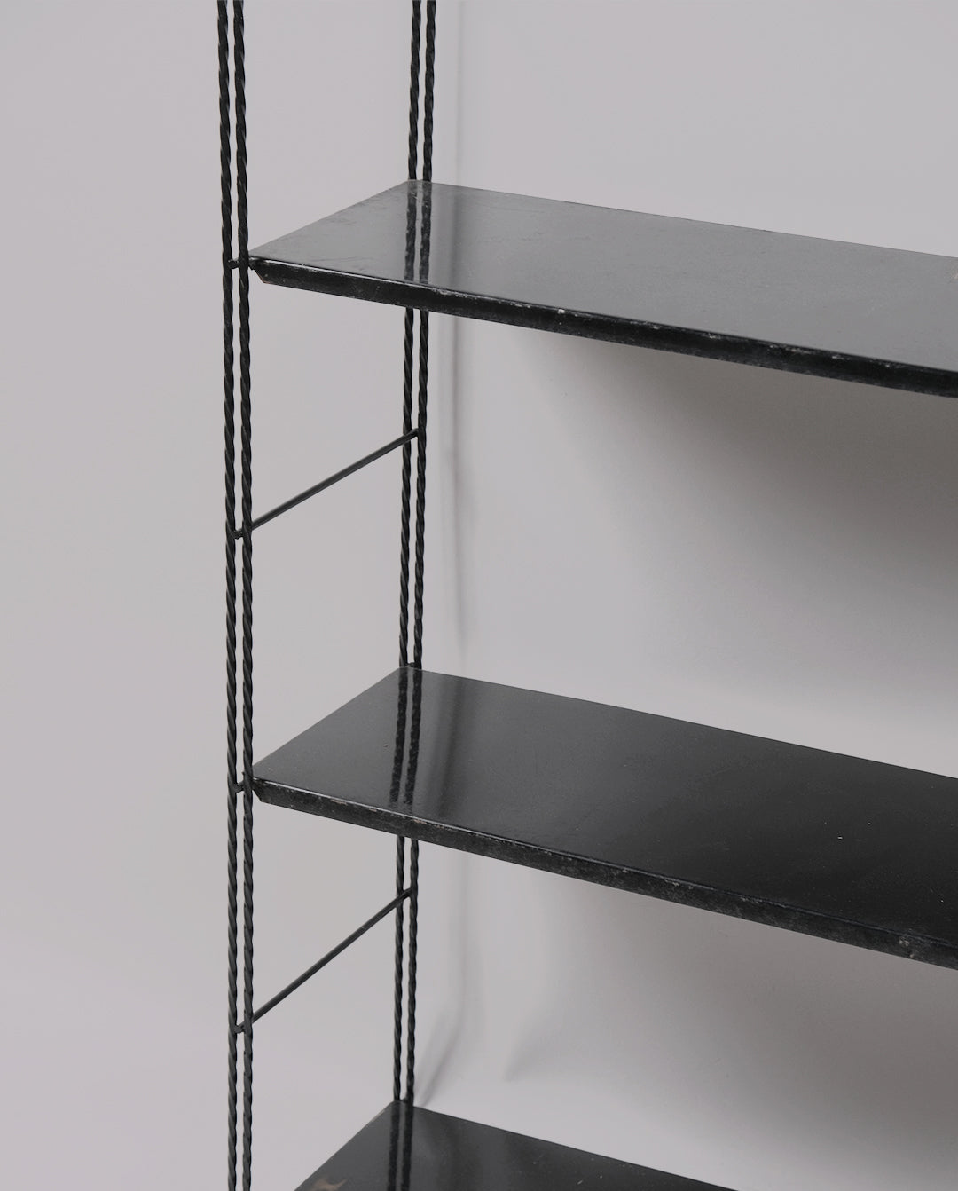 Étagère murale vintage à montants en fer et tablettes amovibles en tôle noire, années 60.