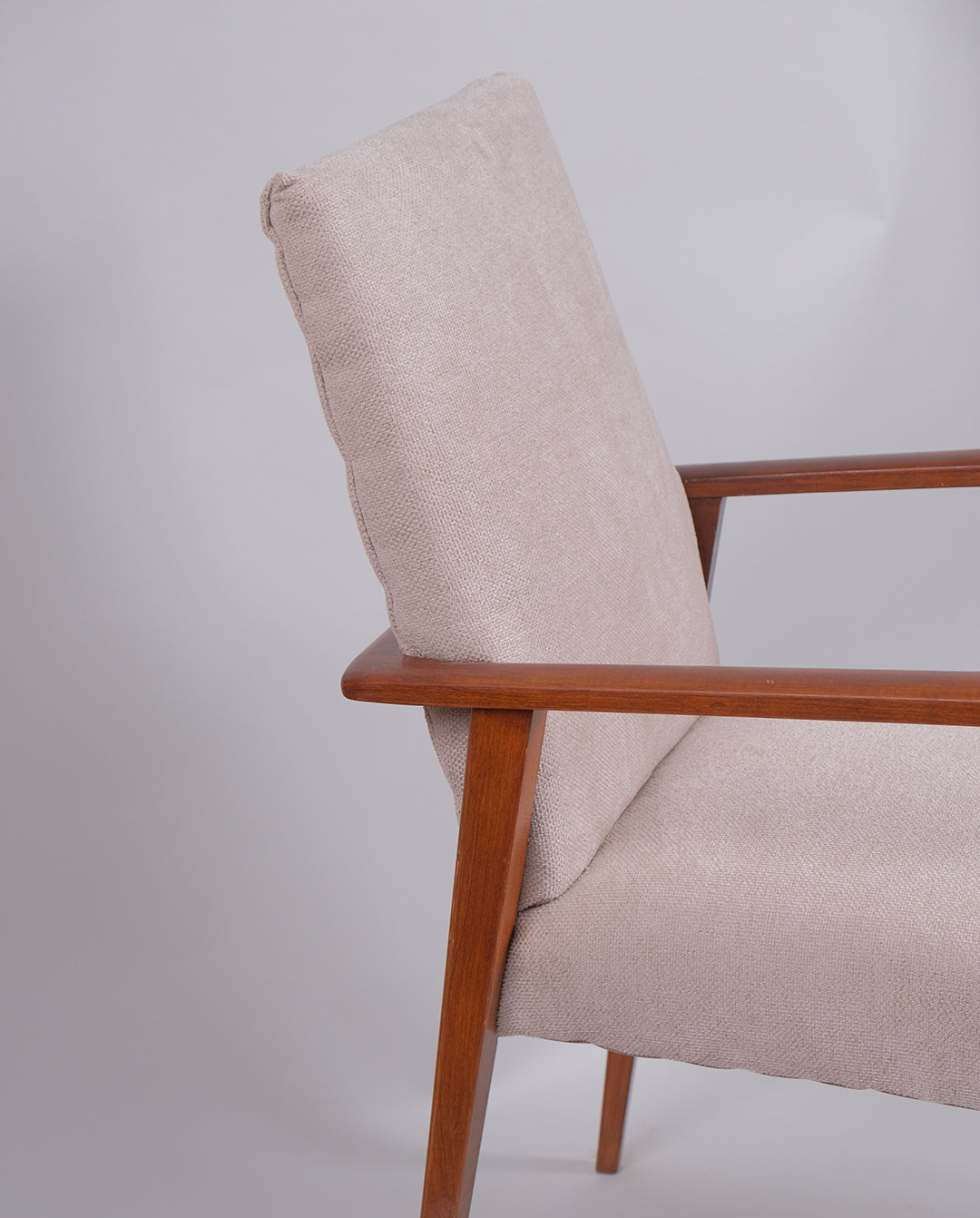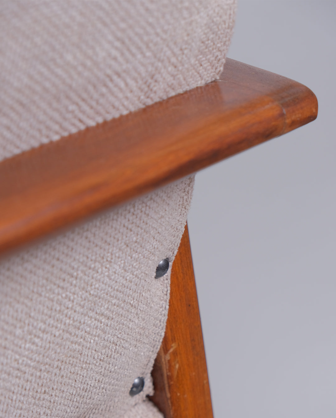 Fauteuil en bois garni d'un tissus lainé crème, 1970