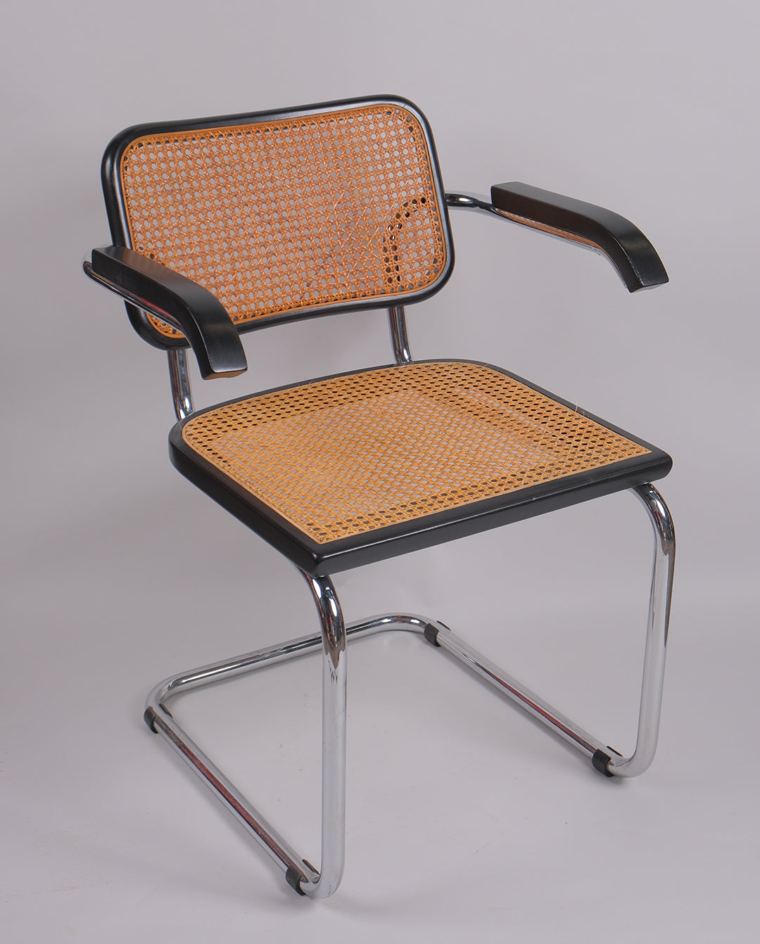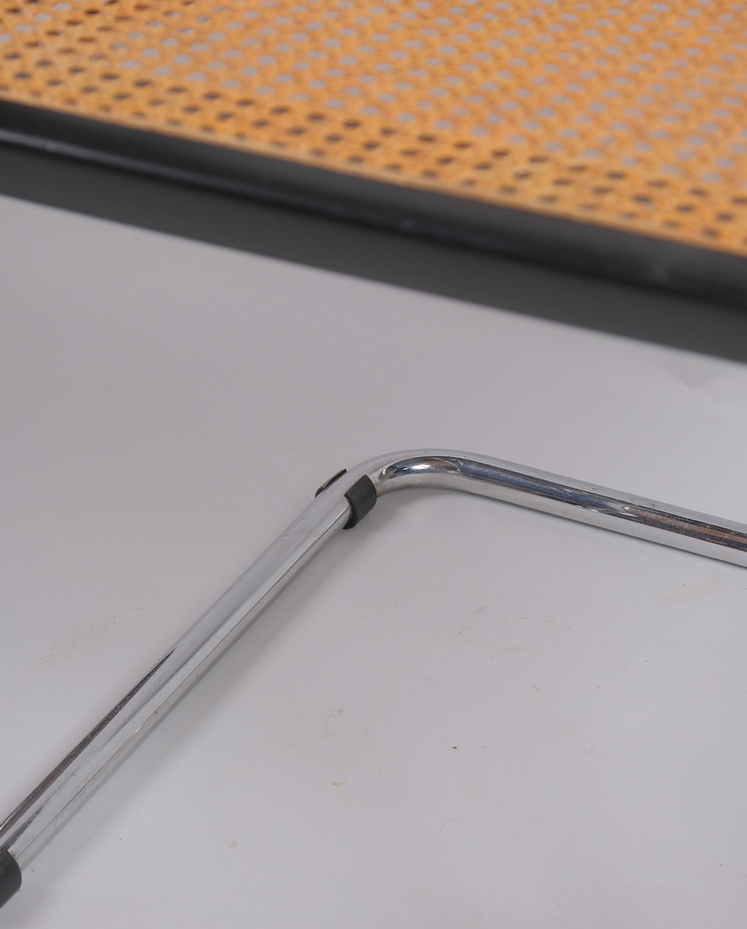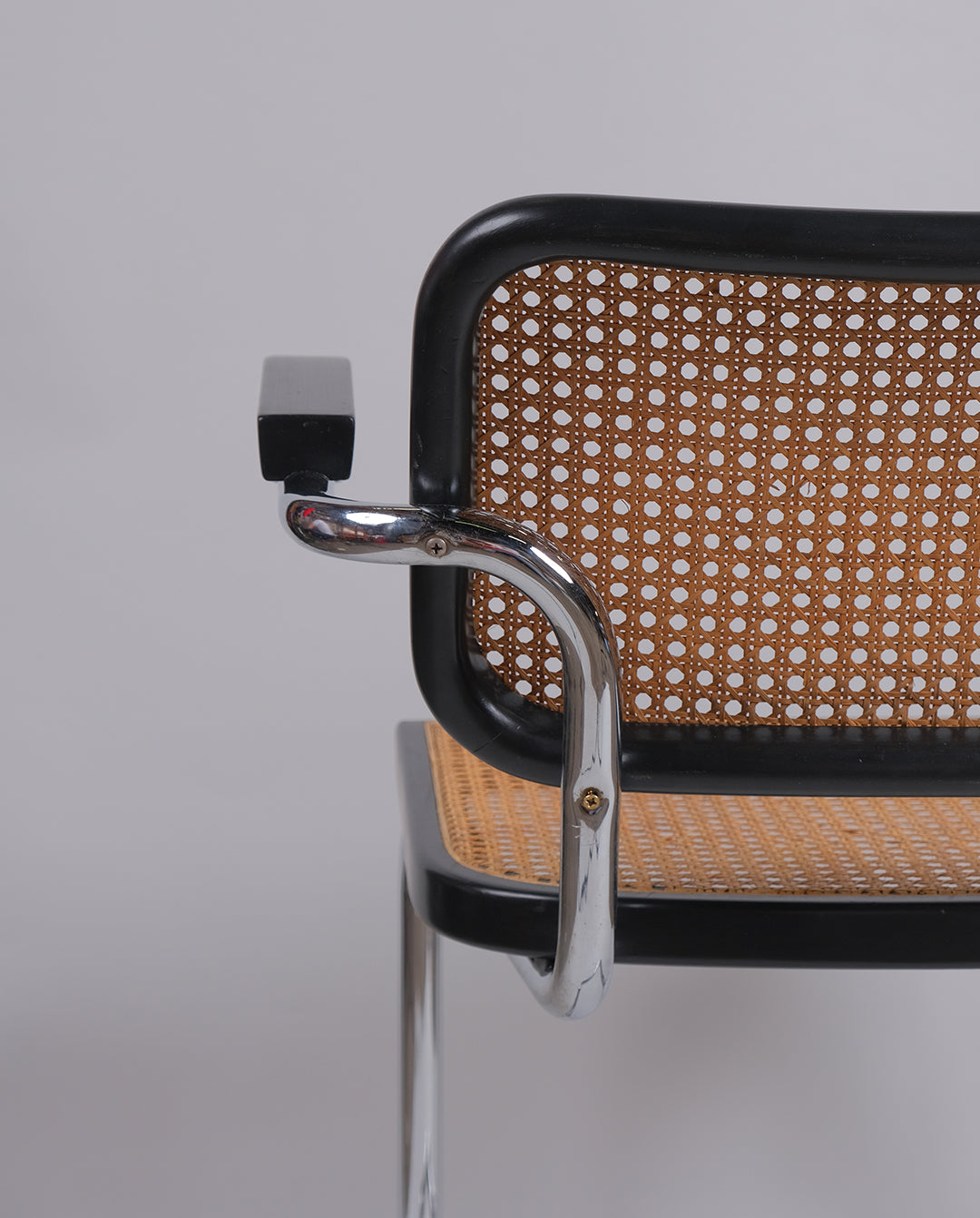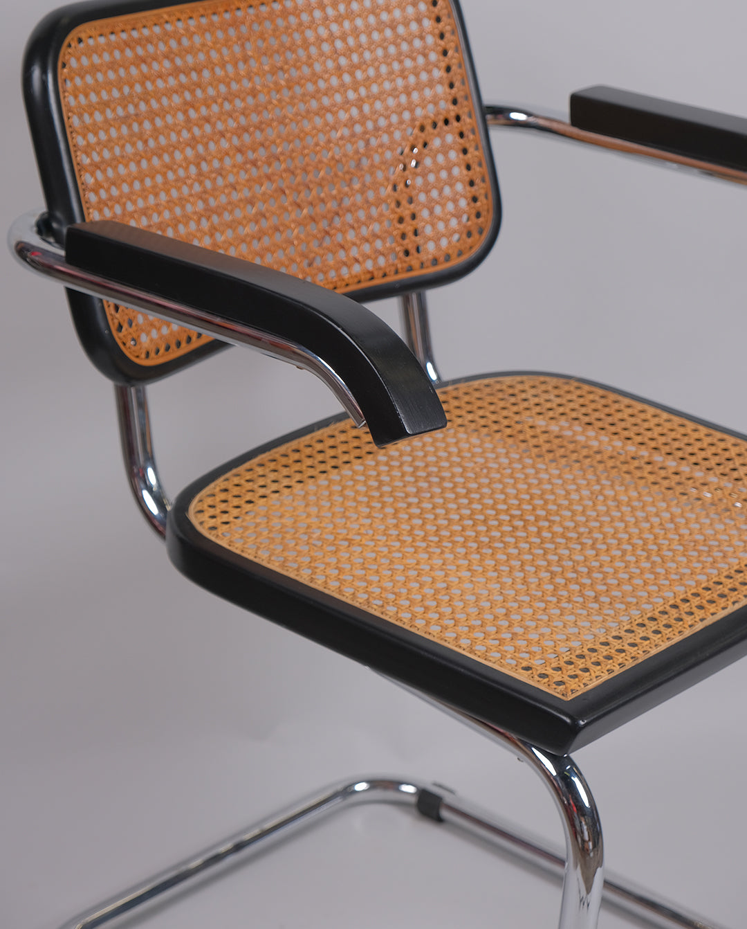 Fauteuil Cesca B64 conçu en 1928, un modèle iconique de Marcel Breuer. Structure tubulaire chromé, assise et dossier en osier naturel et cadre en bois noir.