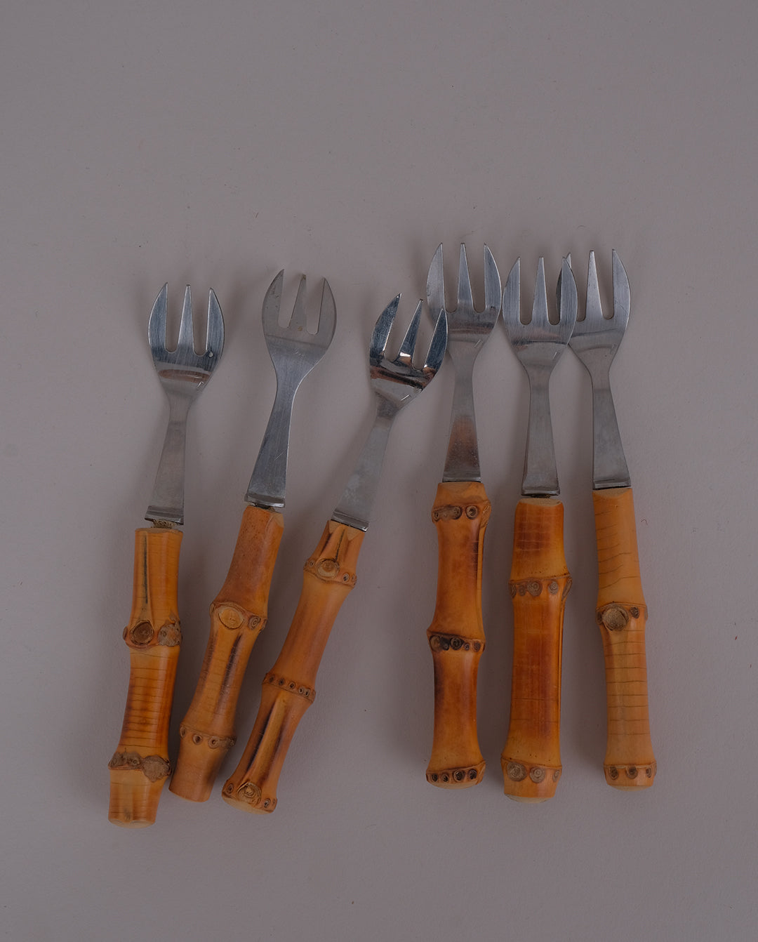 Ensemble de 6 fourchettes à huître vintage en acier inoxydable et manche en bambou
