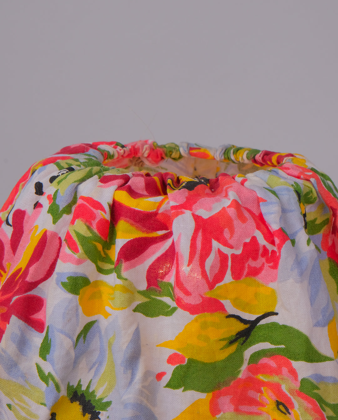 Lampe vintage en bois tourné peint en rouge et abat-jour en tissus fleuri.
