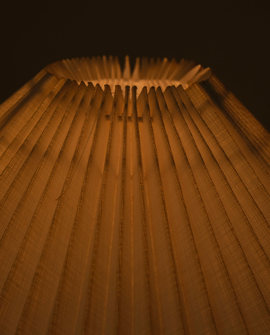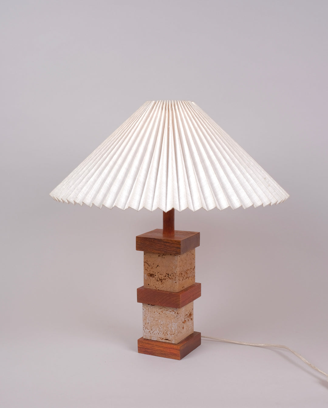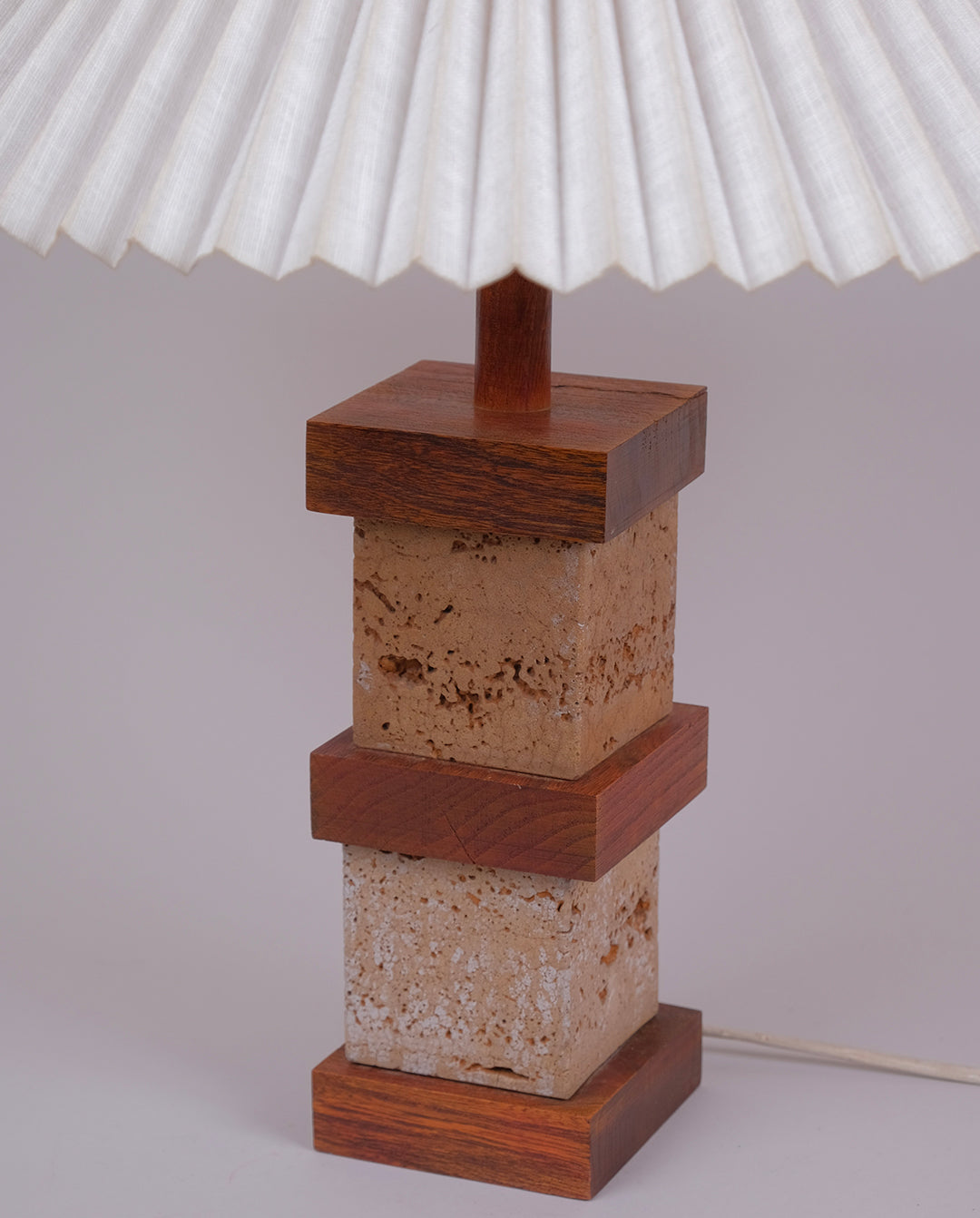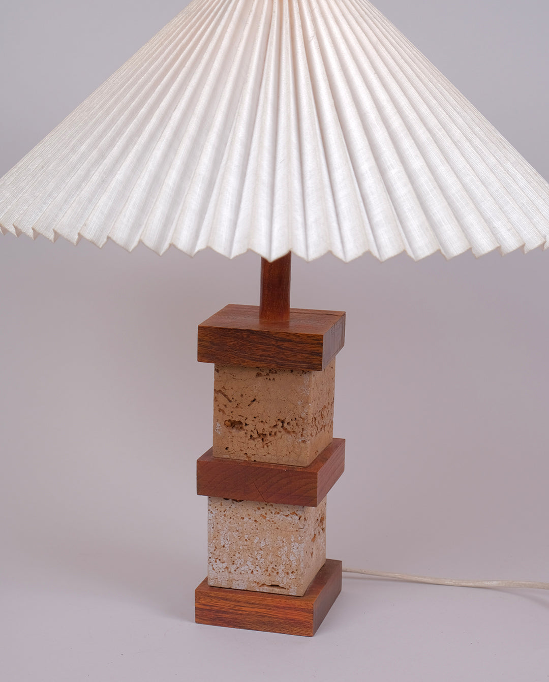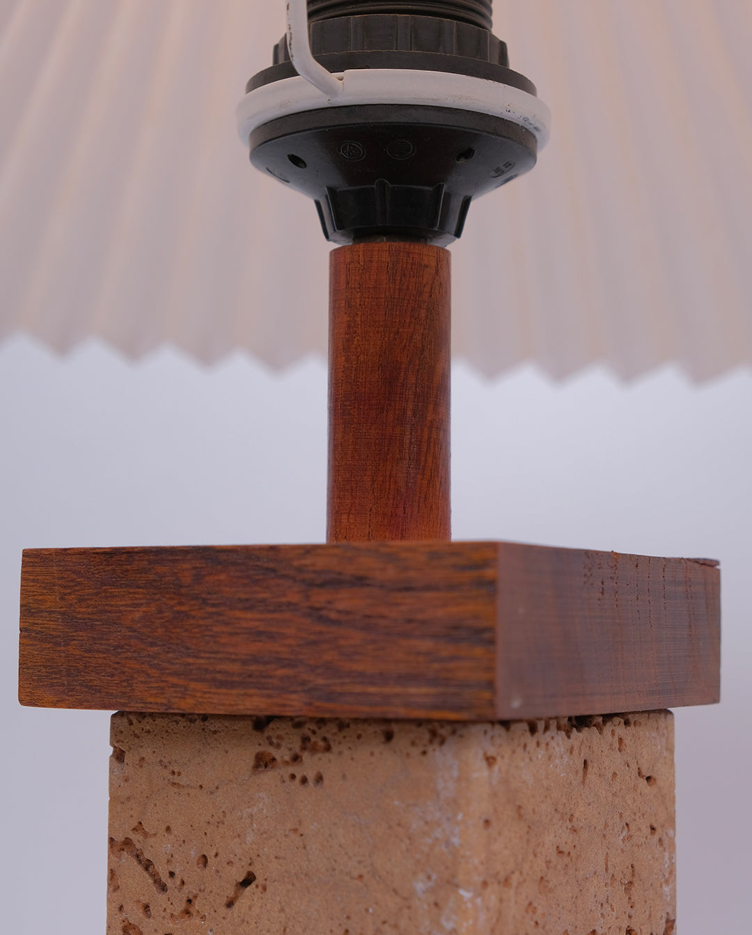 Pied de lampe en bois et pierre associé à un abat-jour plissé.