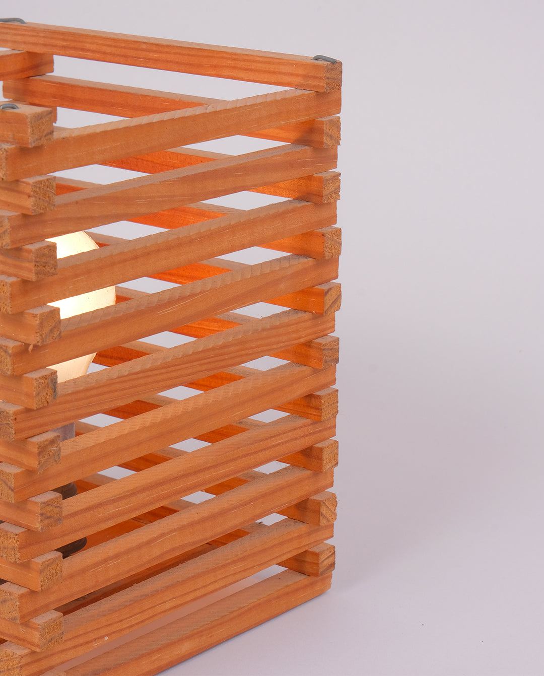 Lampe en forme de cube composée de mini-tasseaux de pin pour une projection de lumière striée.
