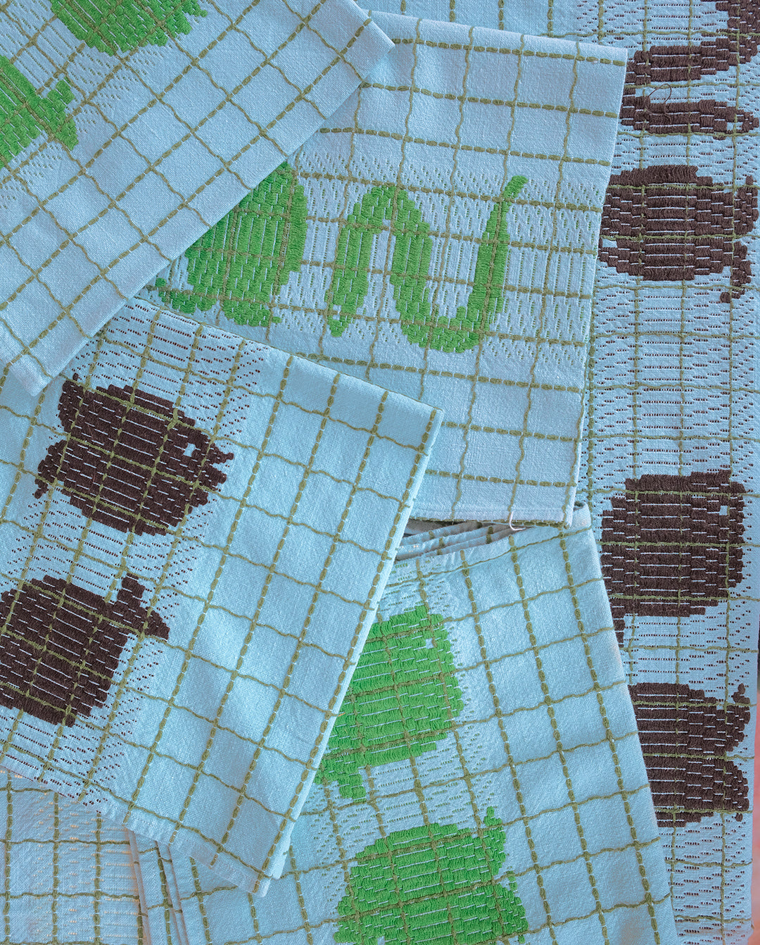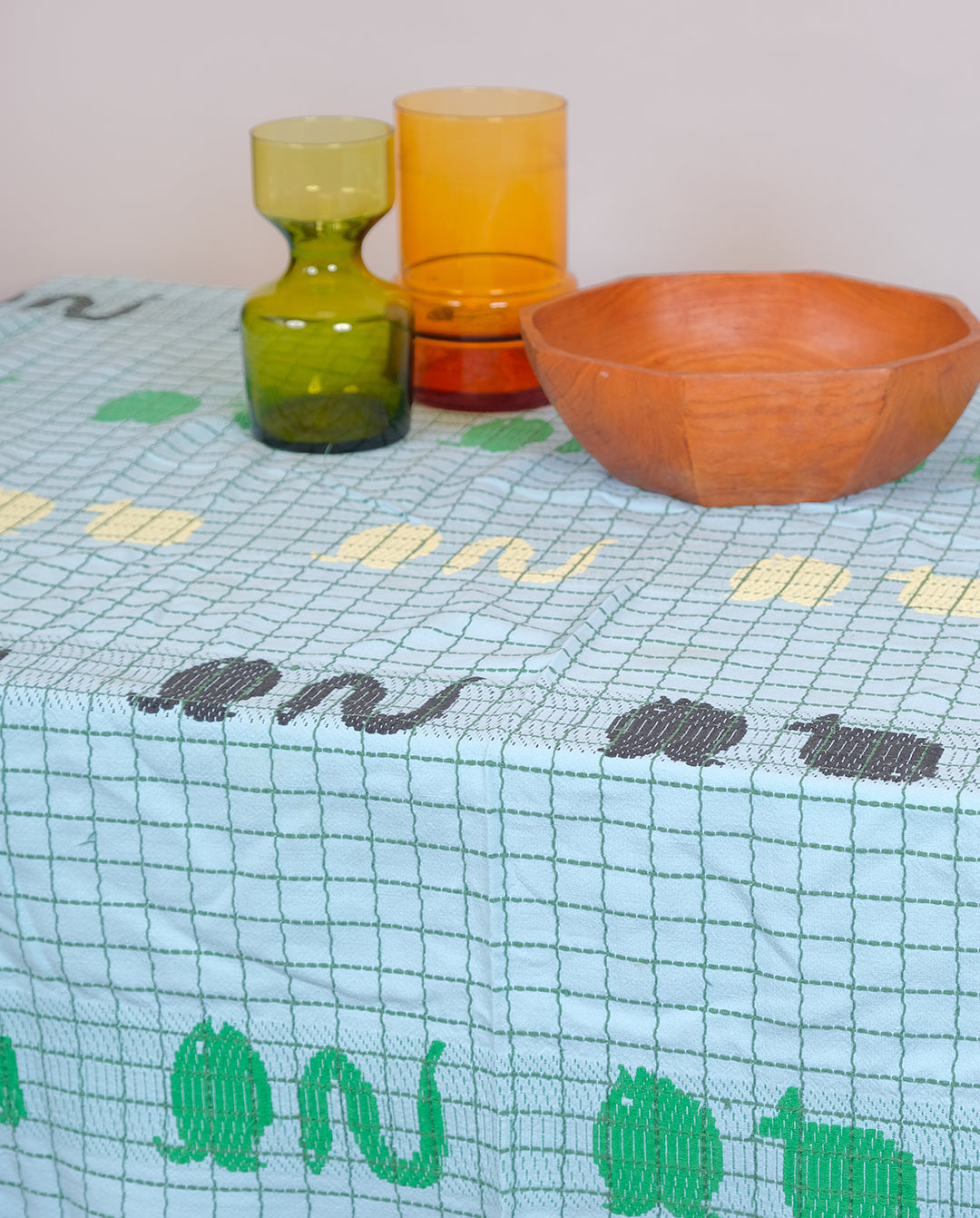 Tissus en coton bleu quadrillé de fil vert et frises brodées d'animaux : noir, jaune, vert.
