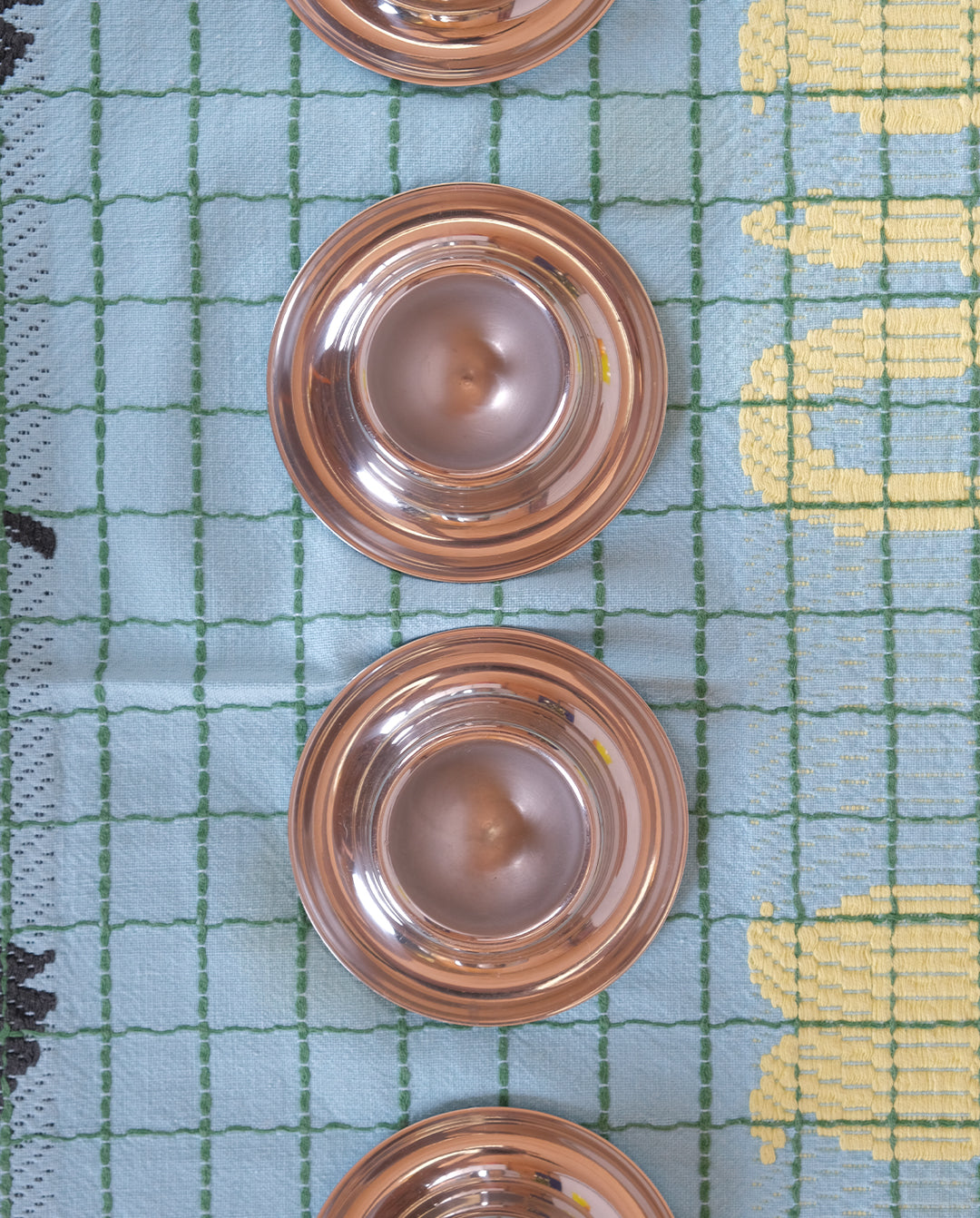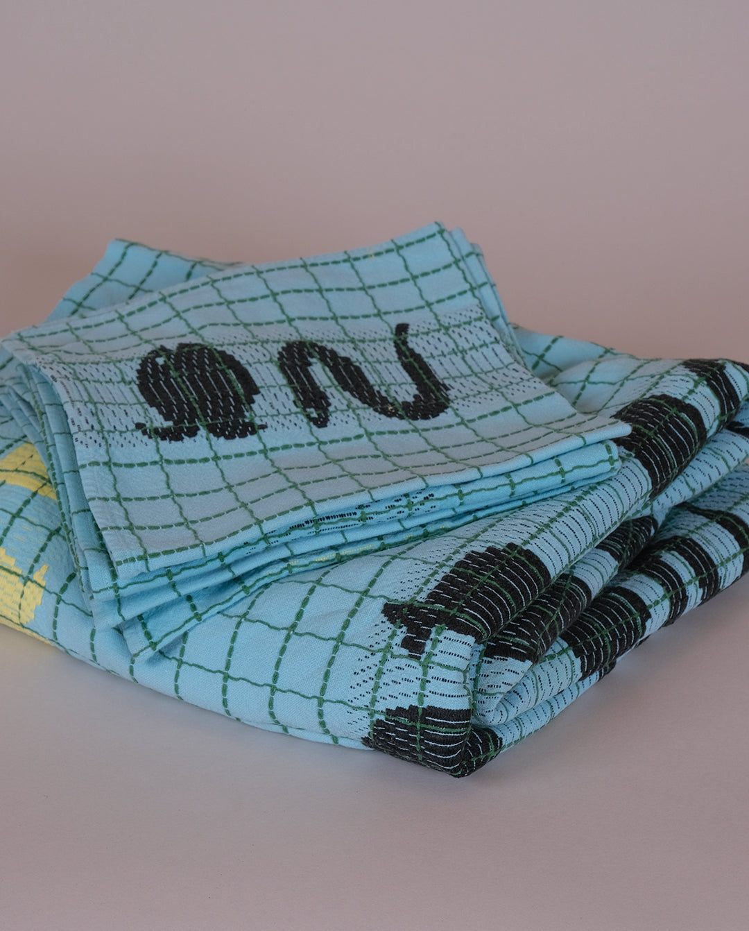 Ensemble de linge de maison composé d'une nappe rectangulaire et de quatre serviettes carrées.