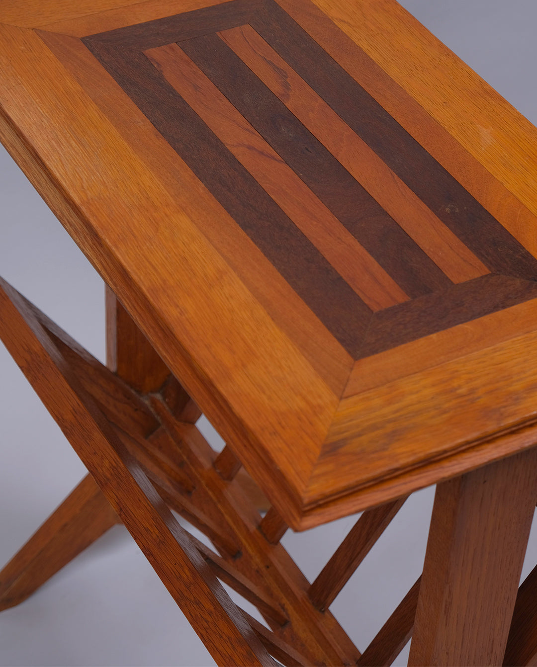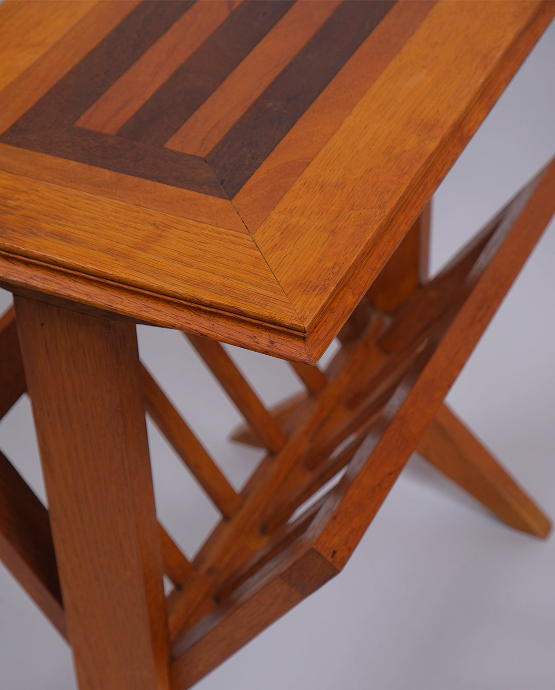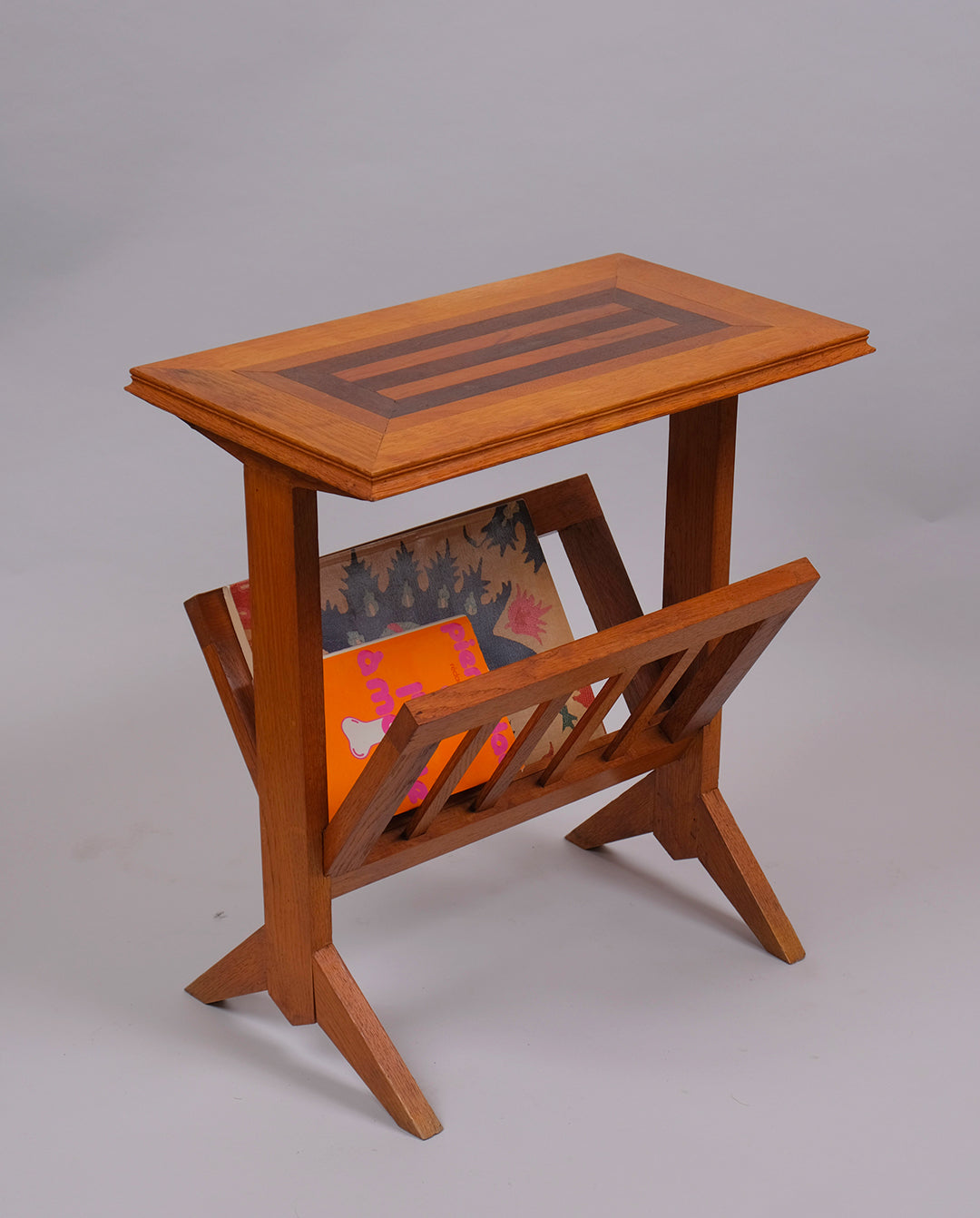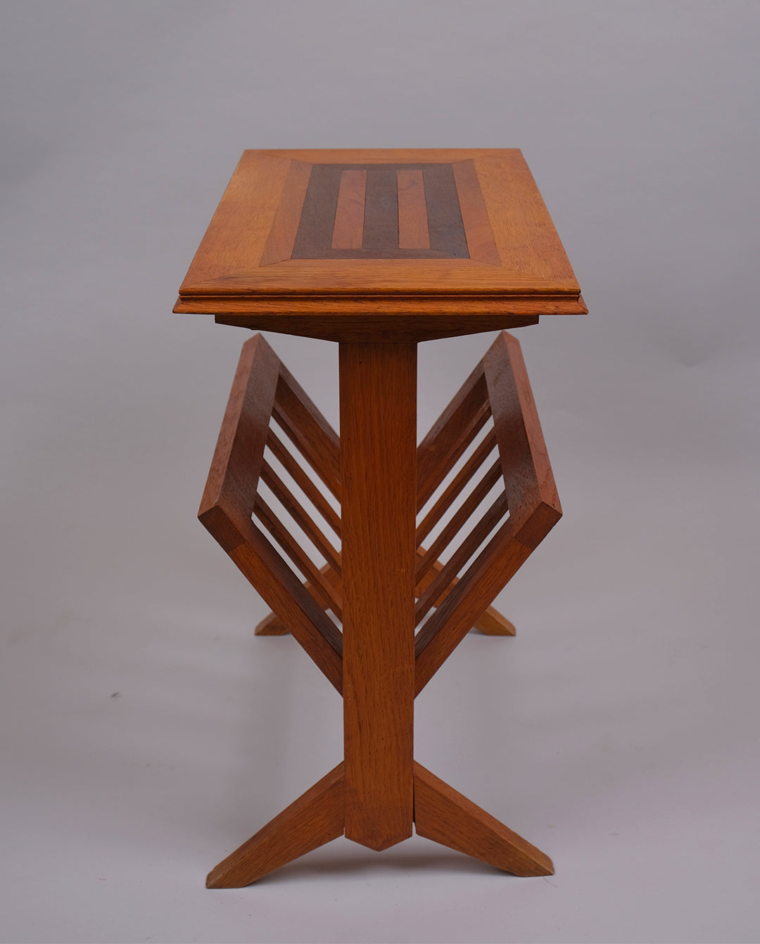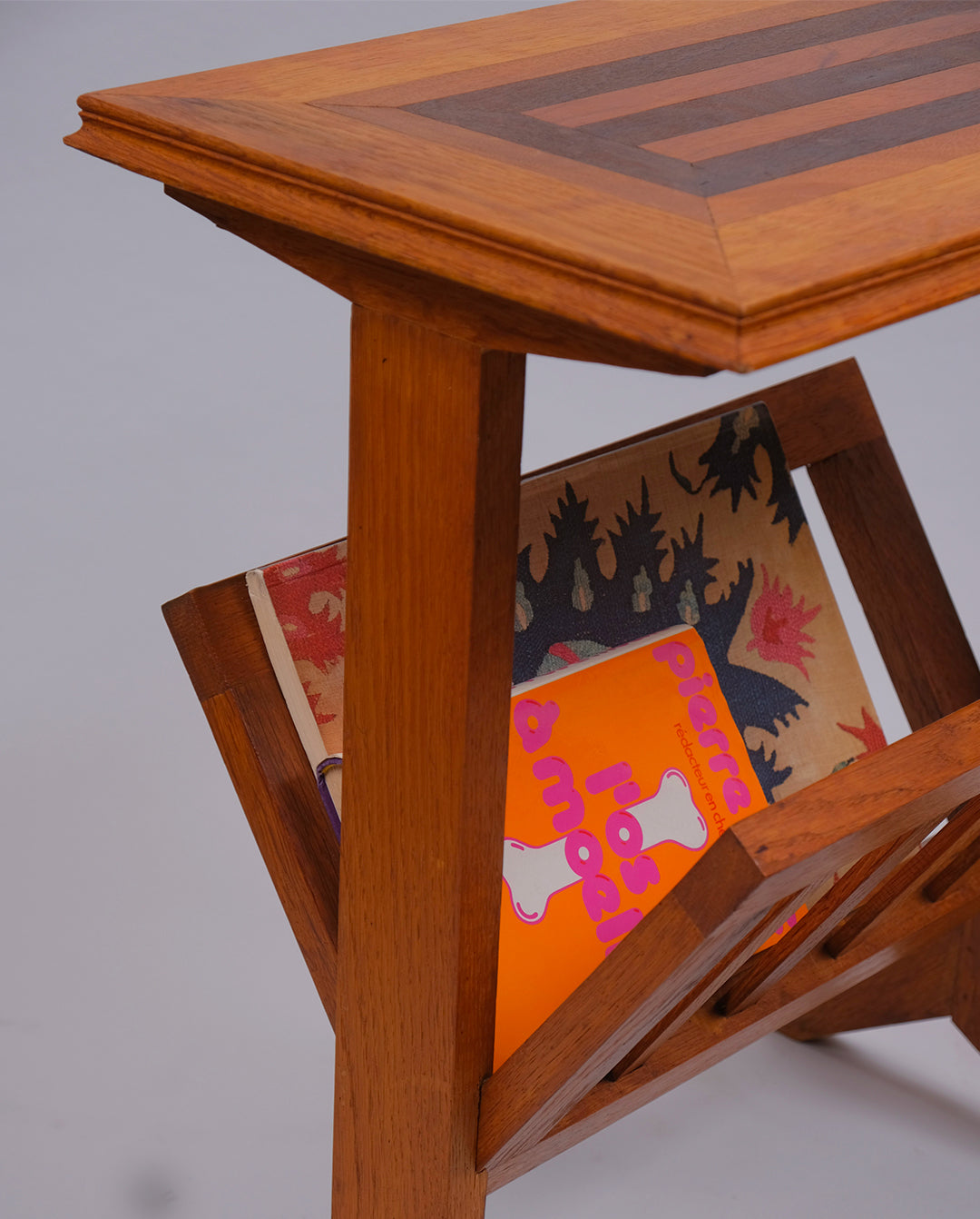 Meuble desserte et porte-revues vintage à plateau en placage de bois.