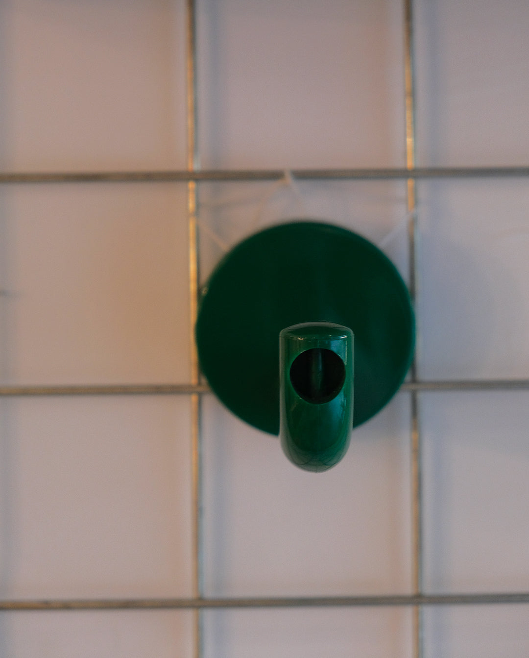 Patère en plastique vert vintage design. Une partie se fixe au mur, l'autre se clipse sur la partie fixé.