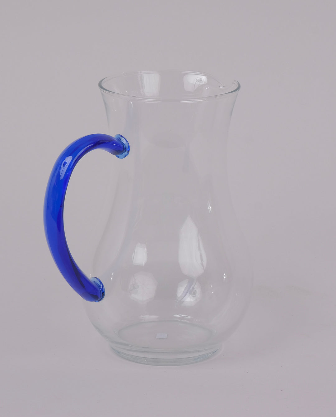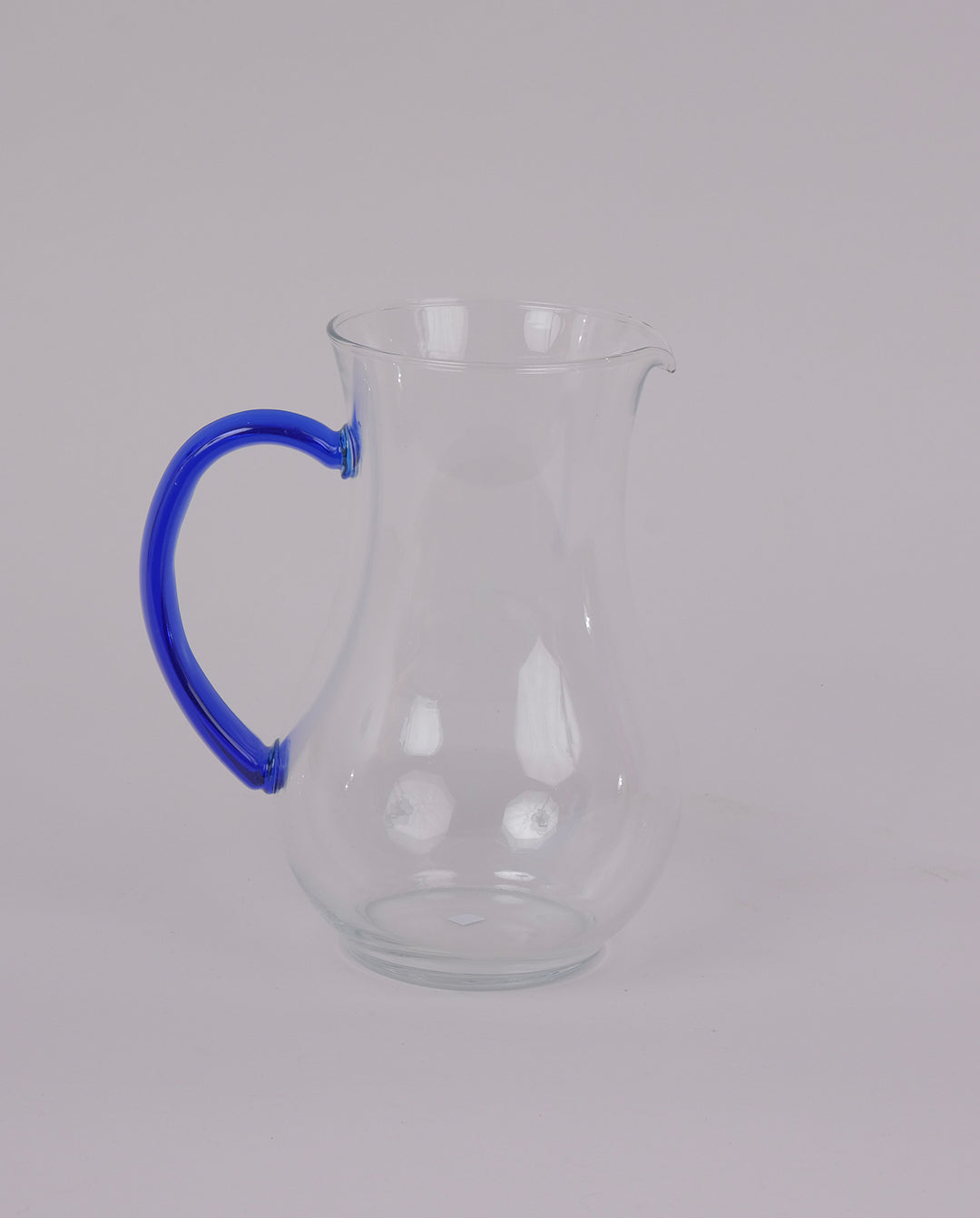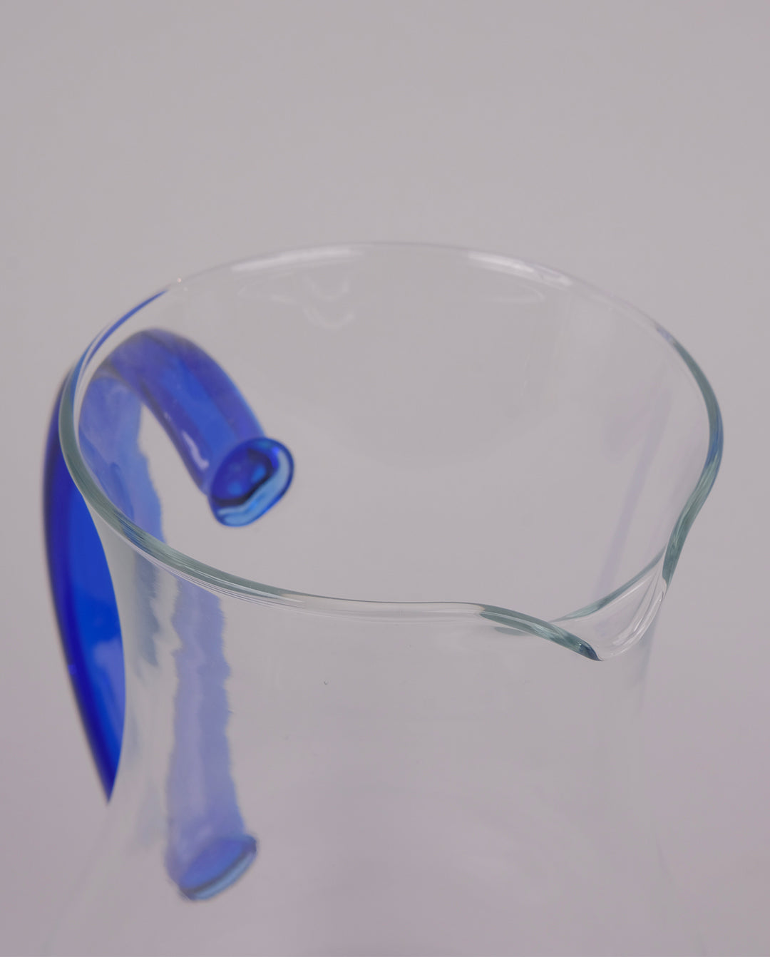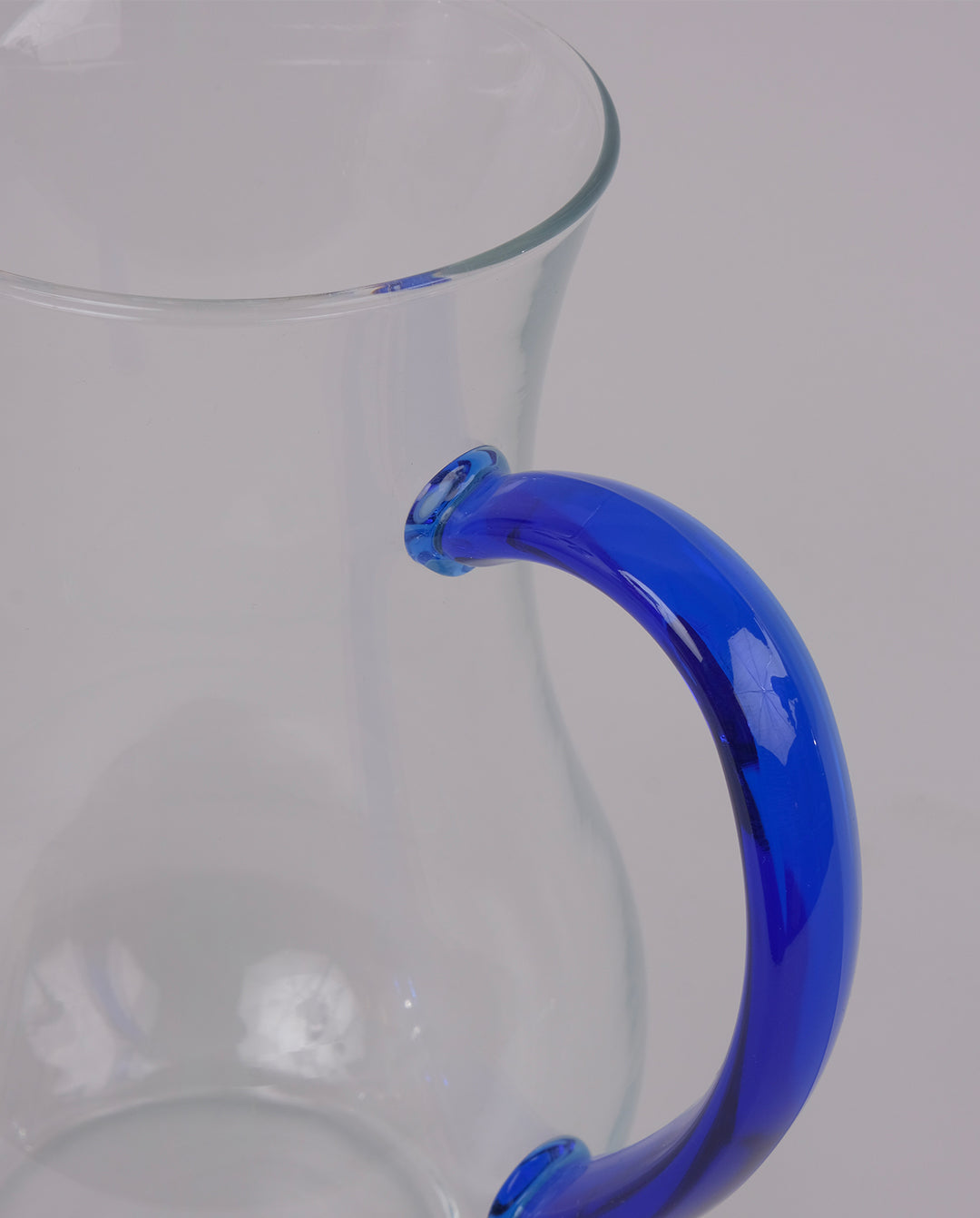 Pichet en verre transparent à la anse en verre teinté d'un bleu profond.