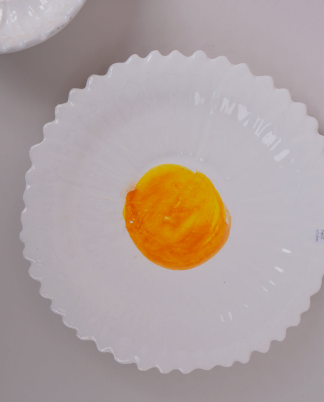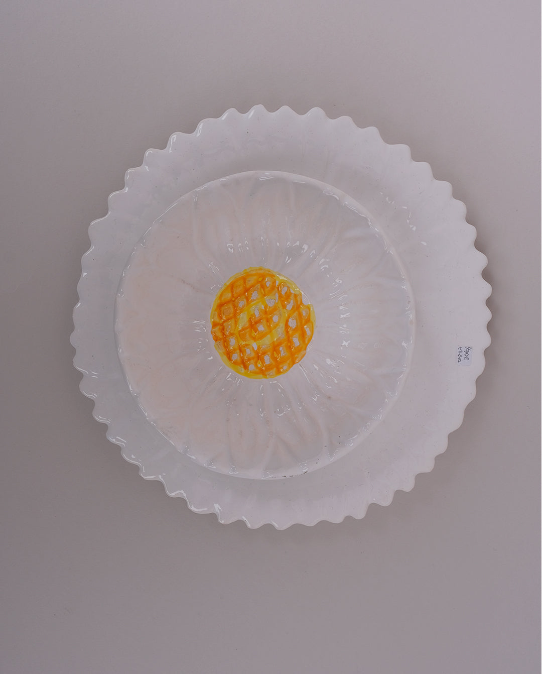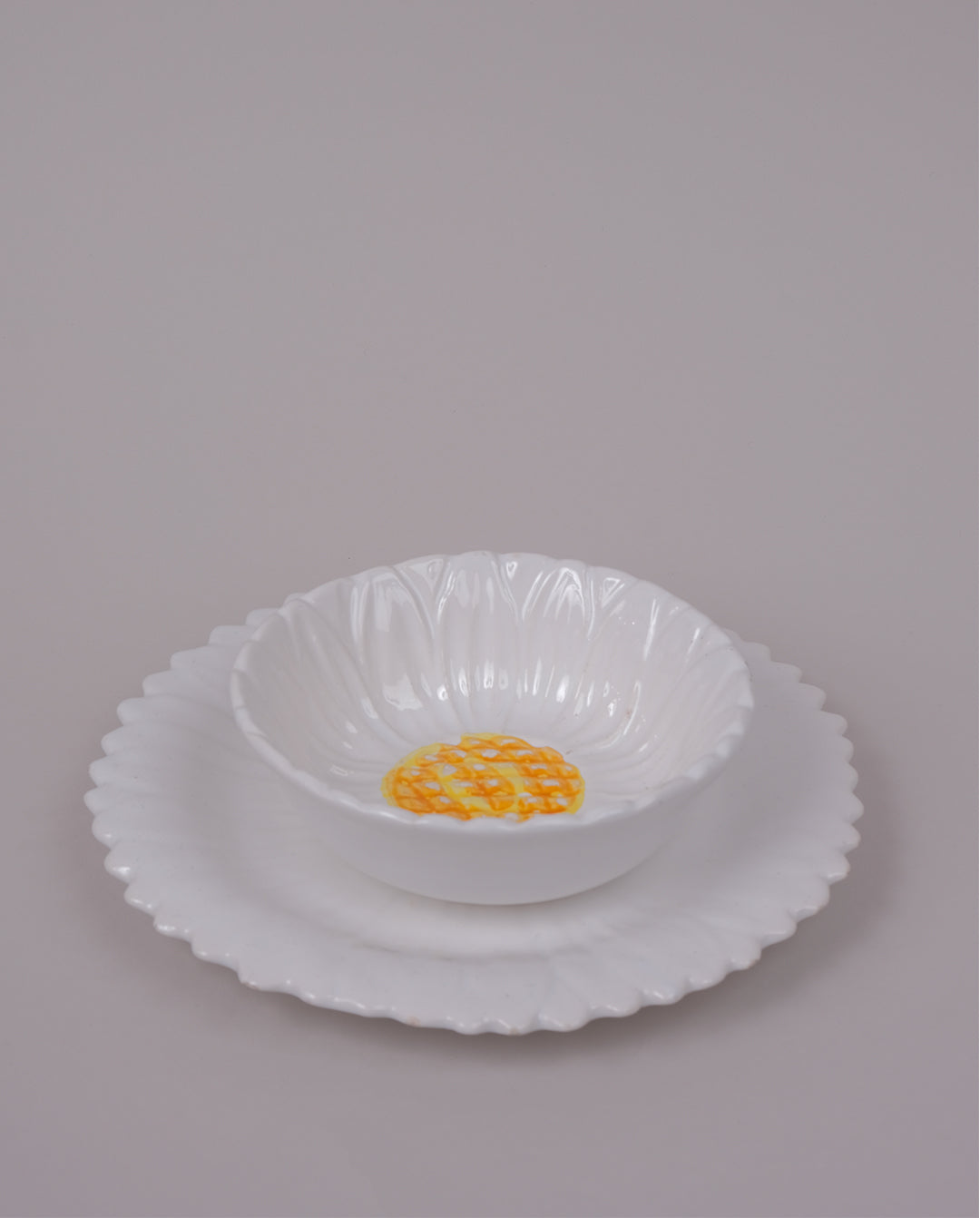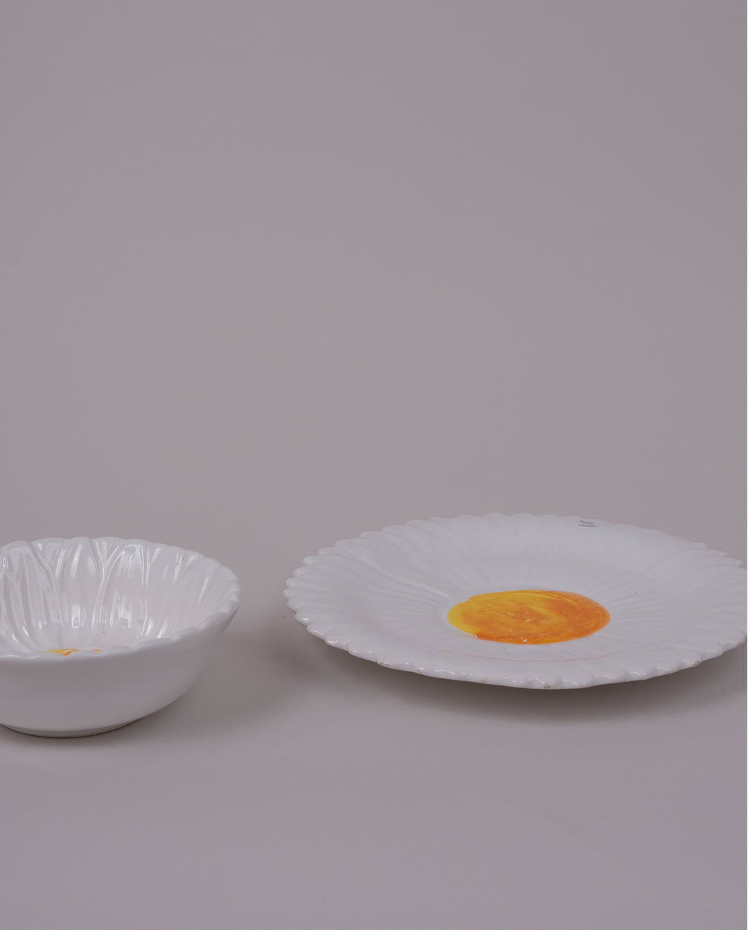 Ensemble comprenant un plat et un bol en céramique et barbotine à décor de tournesol.