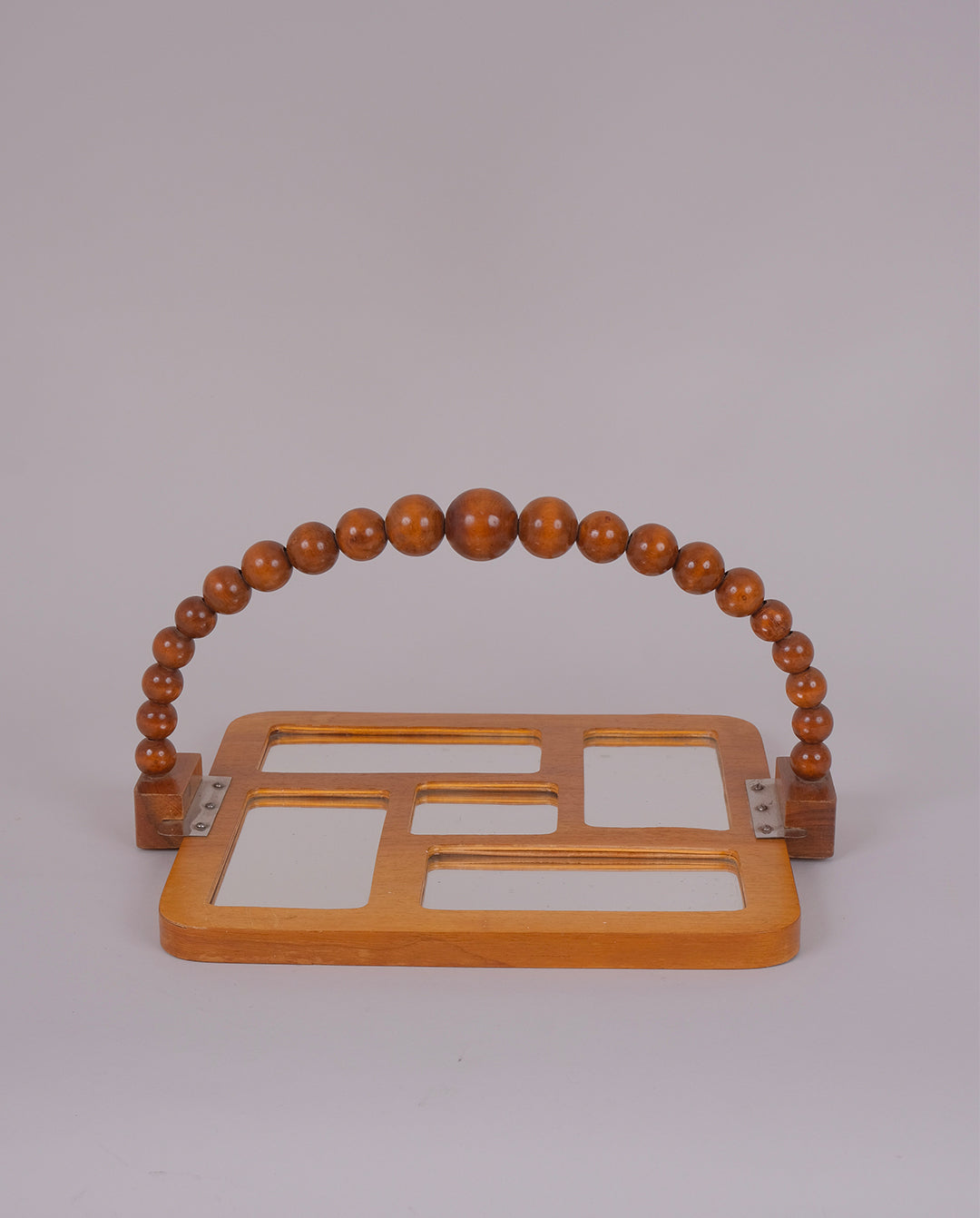 Plateau vintage en bois et miroir avec poignée composée de perles en bois.