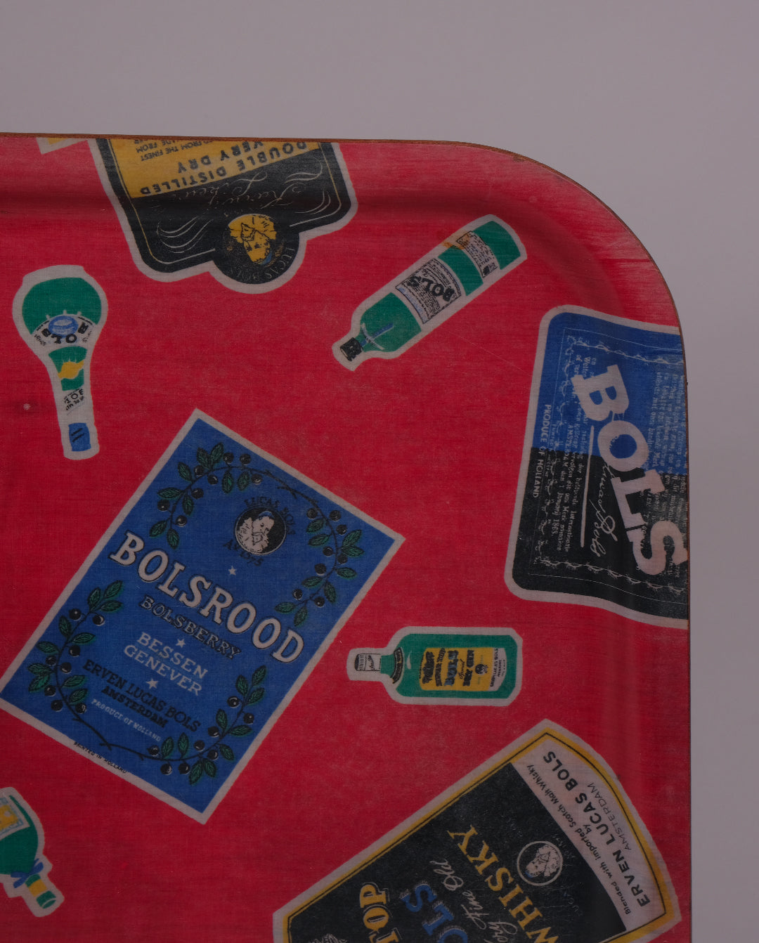 Grand plateau vintage en fibres de verre à décor d'étiquettes de bouteilles d'alcool