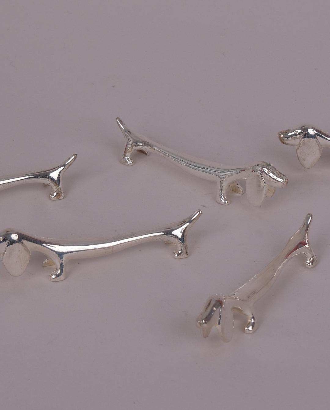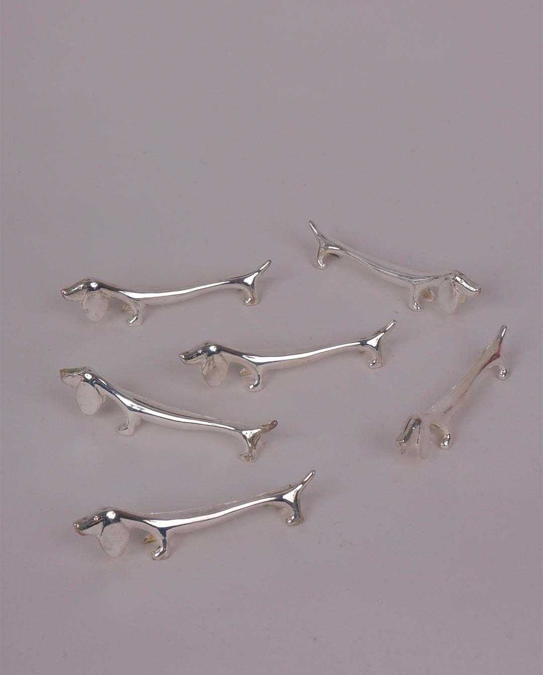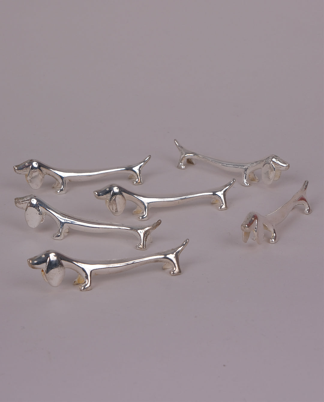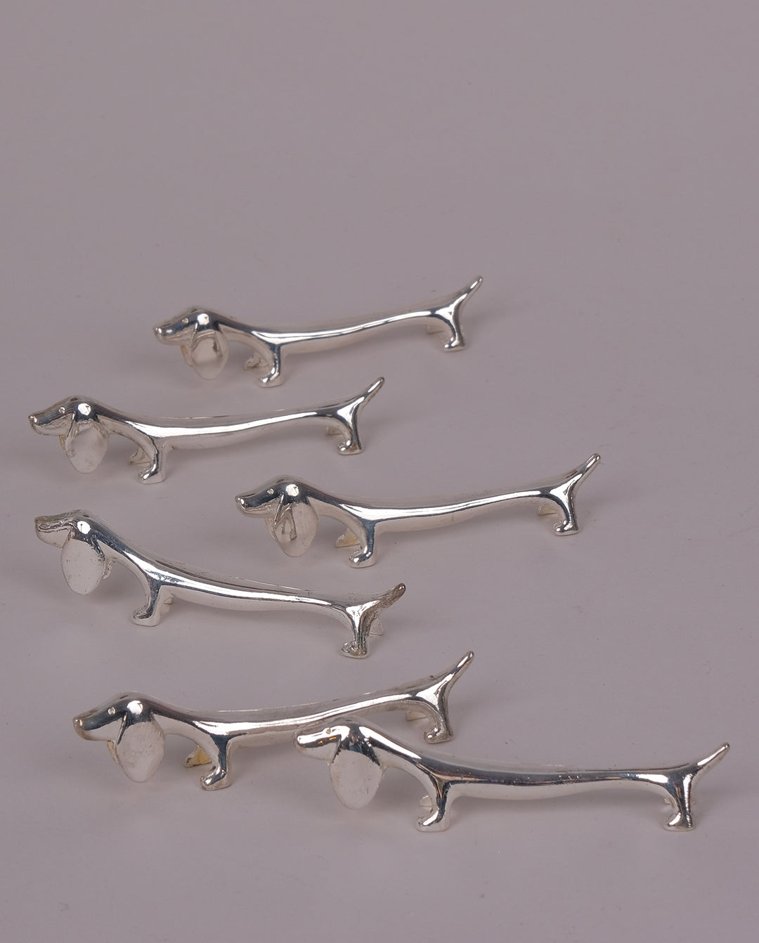 Ensemble de 8 porte-couteaux vintage en métal argenté en forme de teckel (il y en a 6 sur la photo mais 8 en tout)