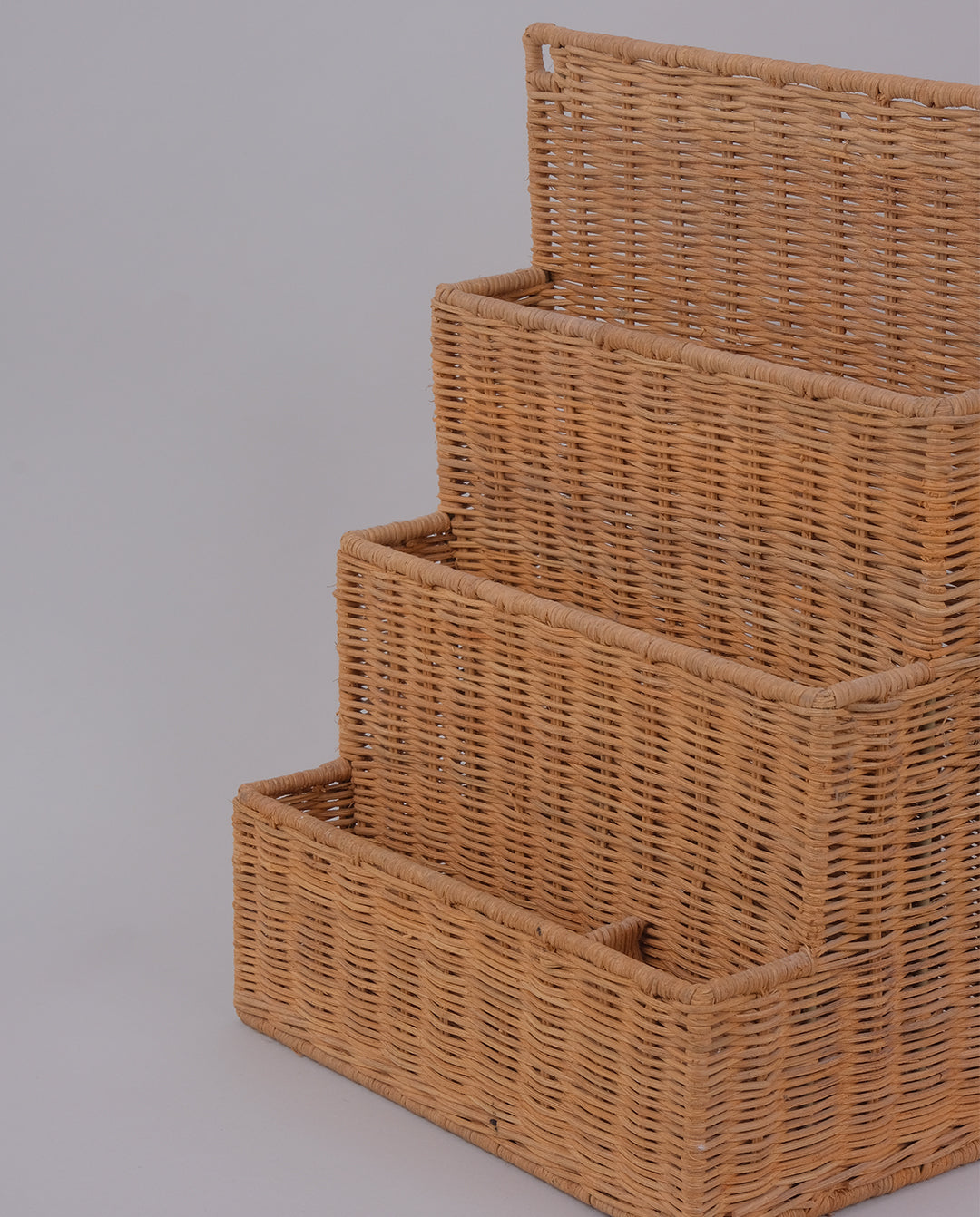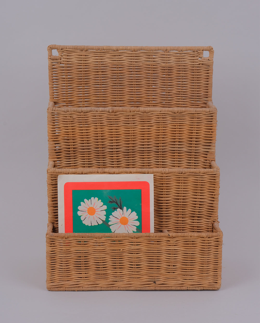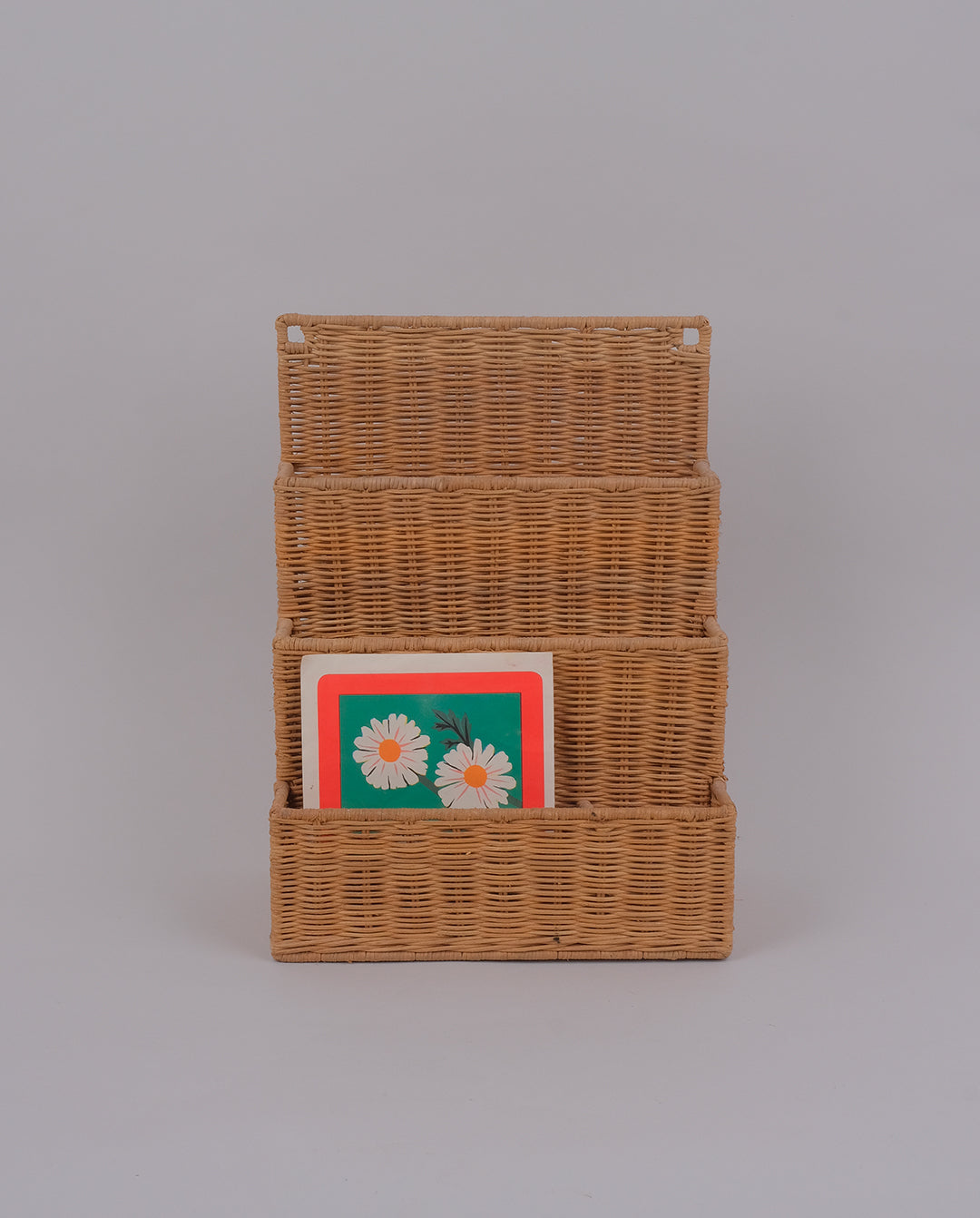 Porte-magazine ou range-document mural en osier. Compartiments répartis sur trois étages. Deux perforations prévues pour fixer le porte-document. Peut aussi se poser sur un bureau.