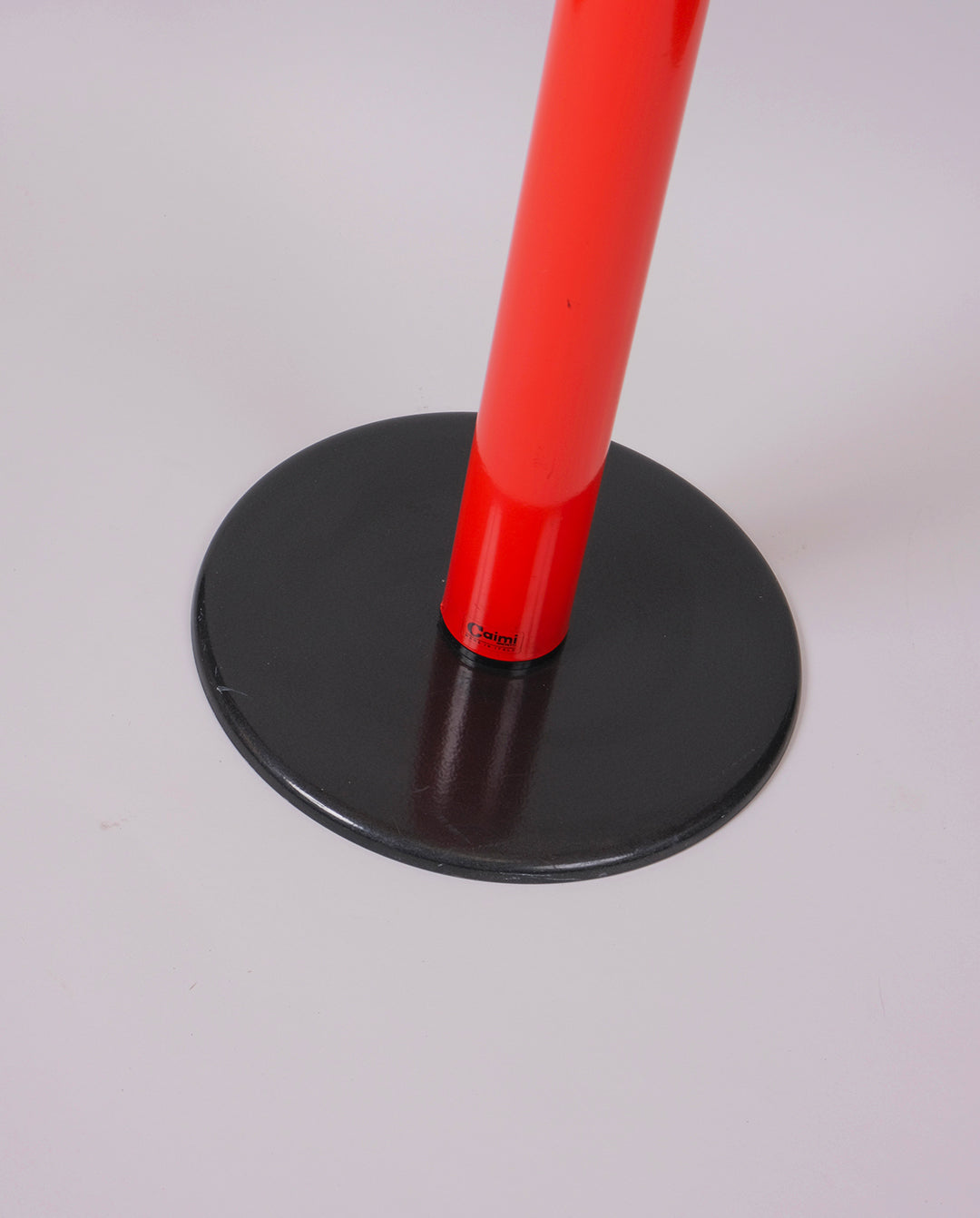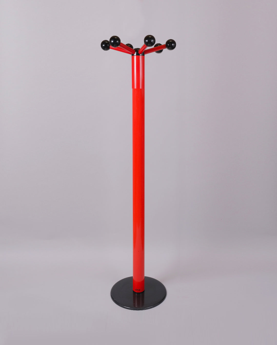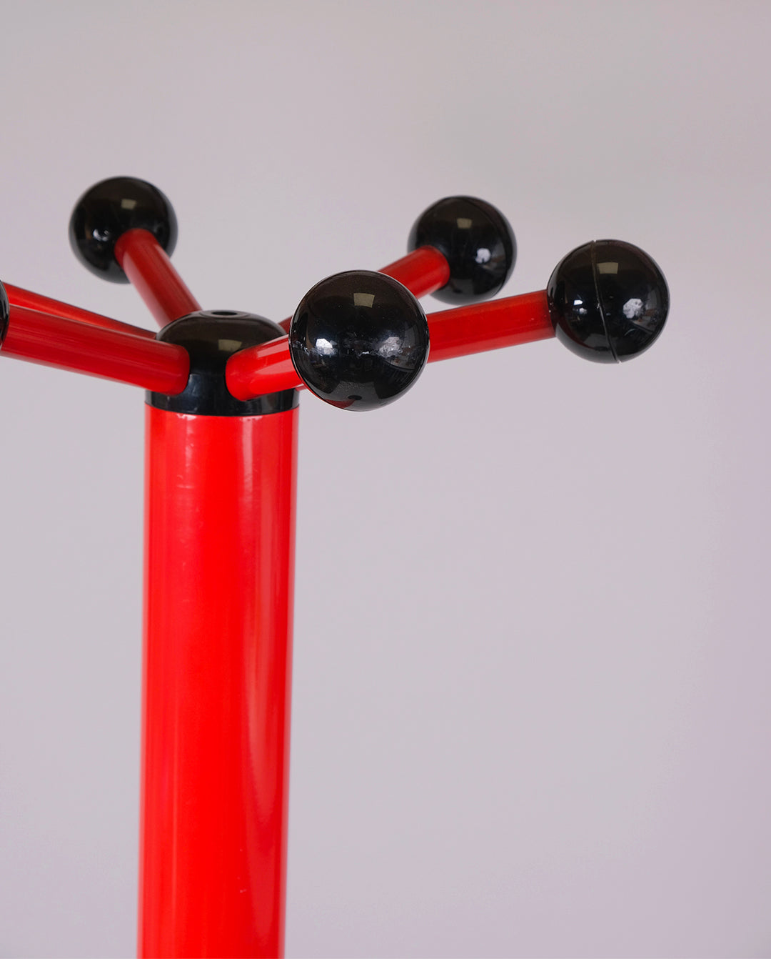 Porte-manteau vintage en métal rouge et 6 patères boules en plastique noir. Italie, années 80.