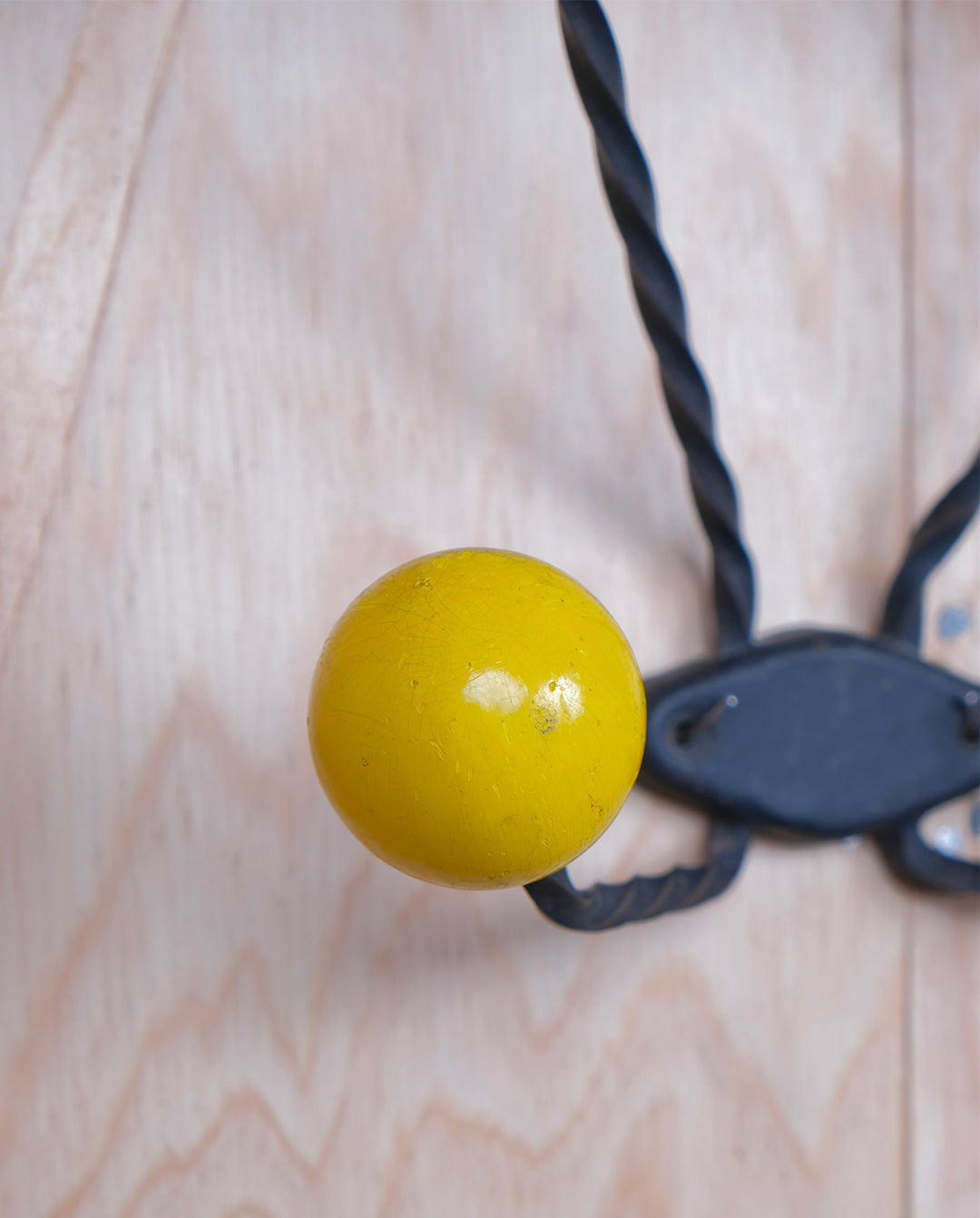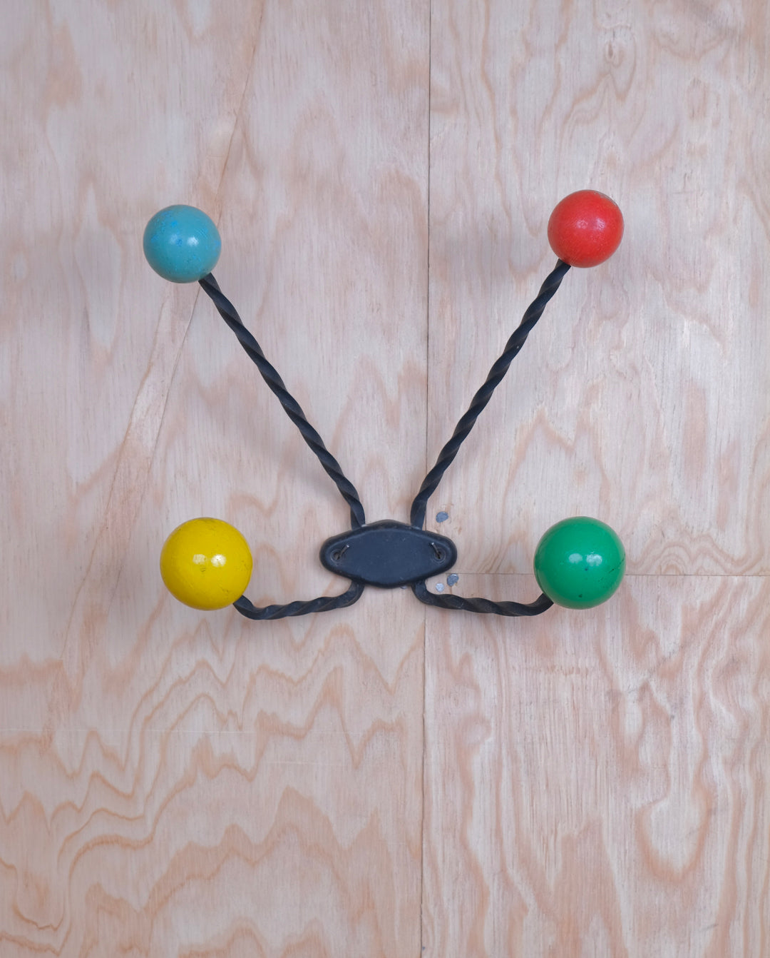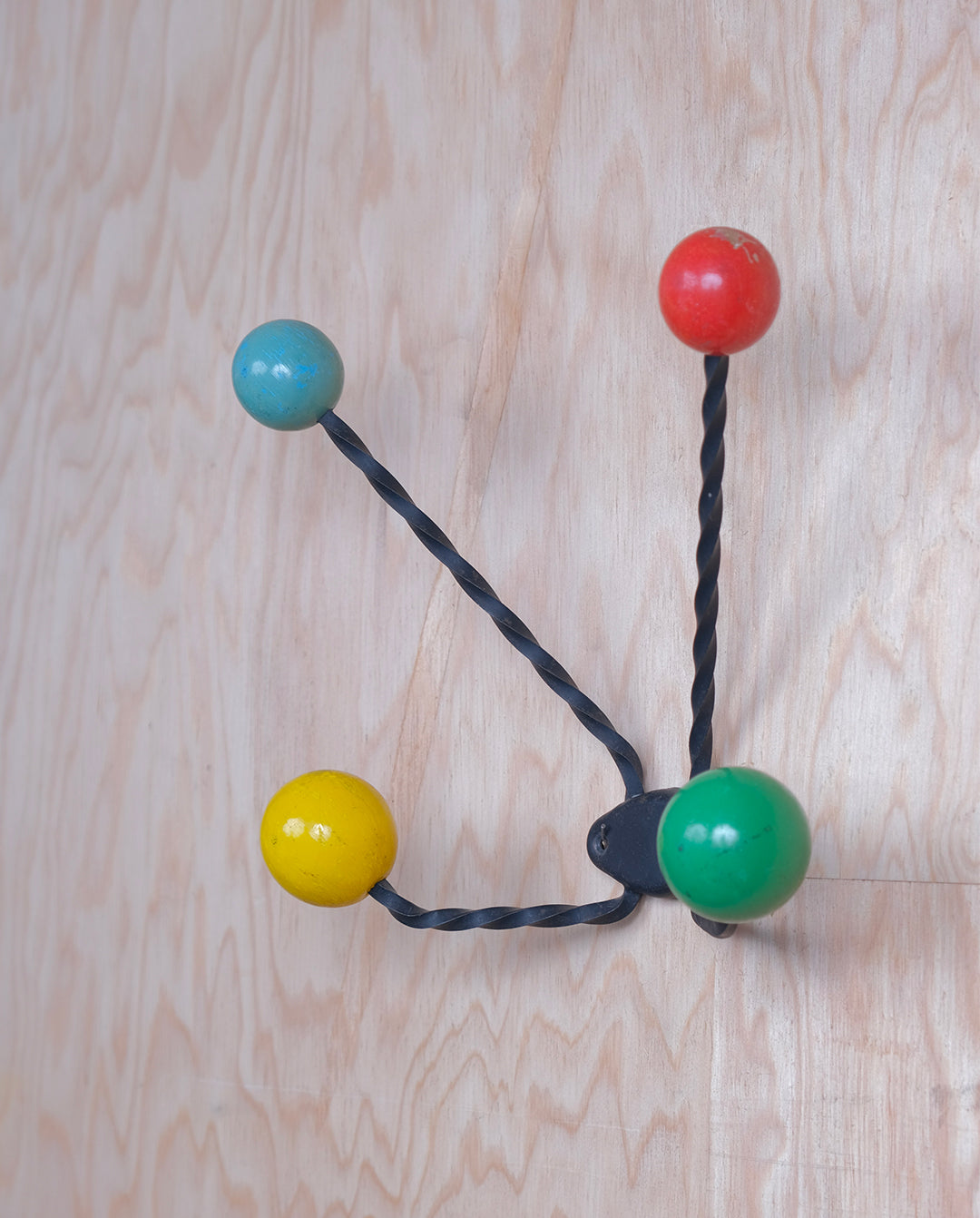 Porte-manteau mural vintage en métal à 4 patères en bois peint.