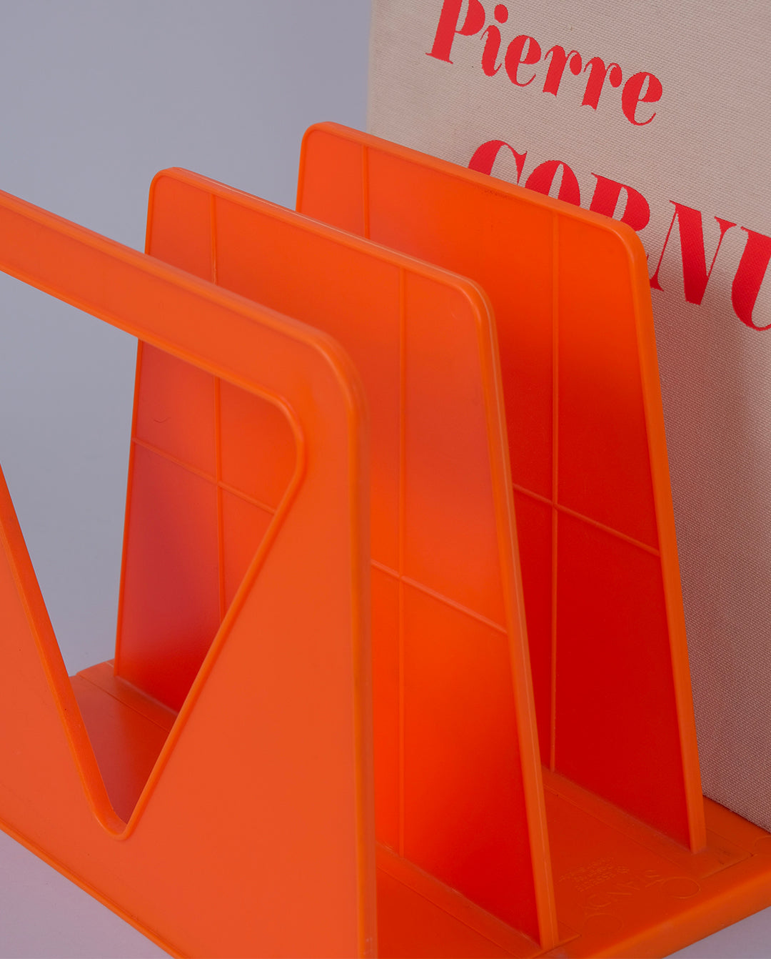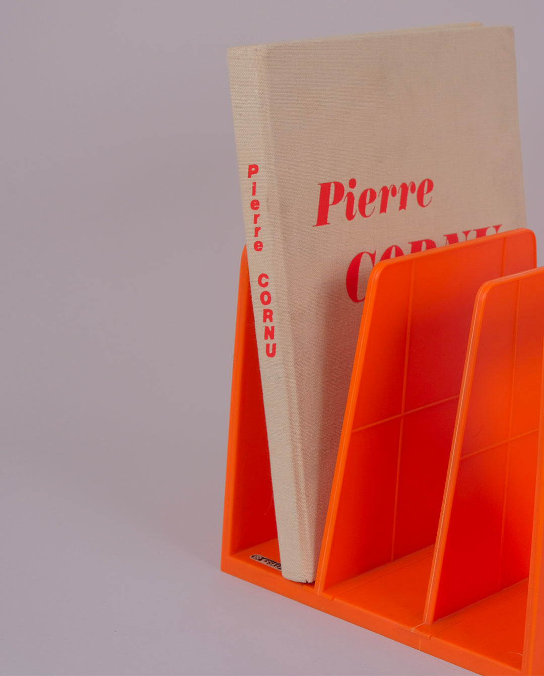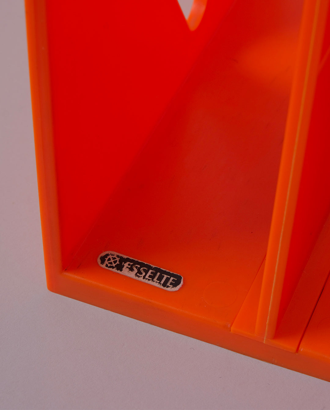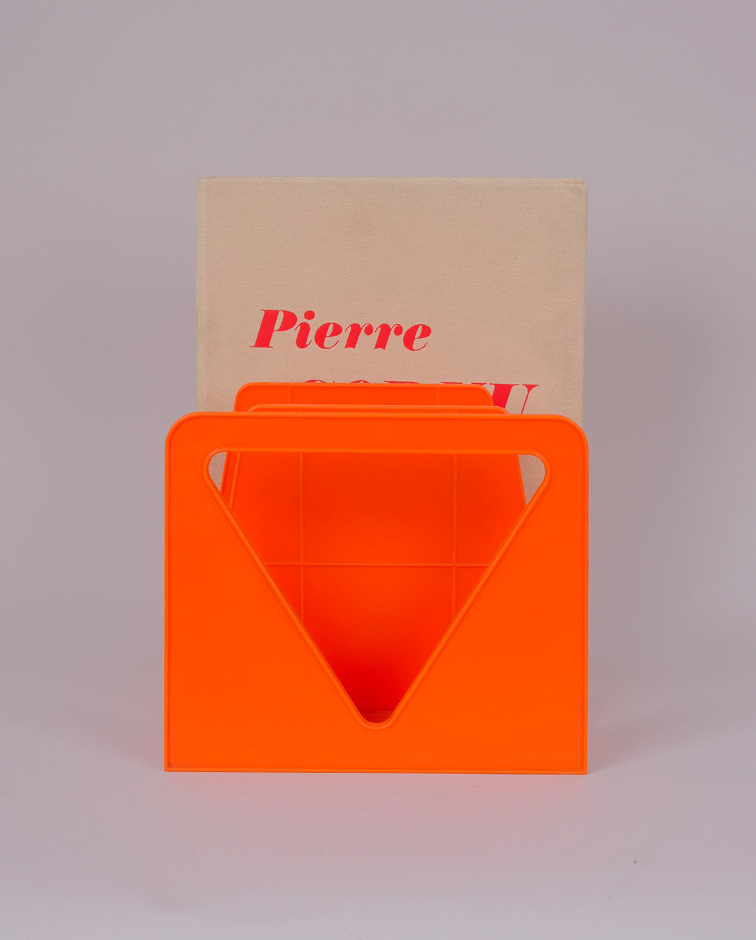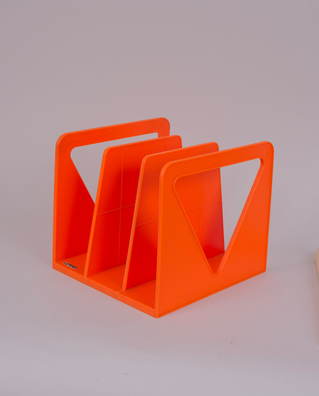Porte-revue ou range-vinyle en plastique orange de la marque d'accessoires de bureau suédoise Esselte.