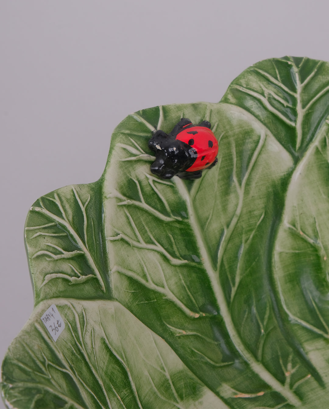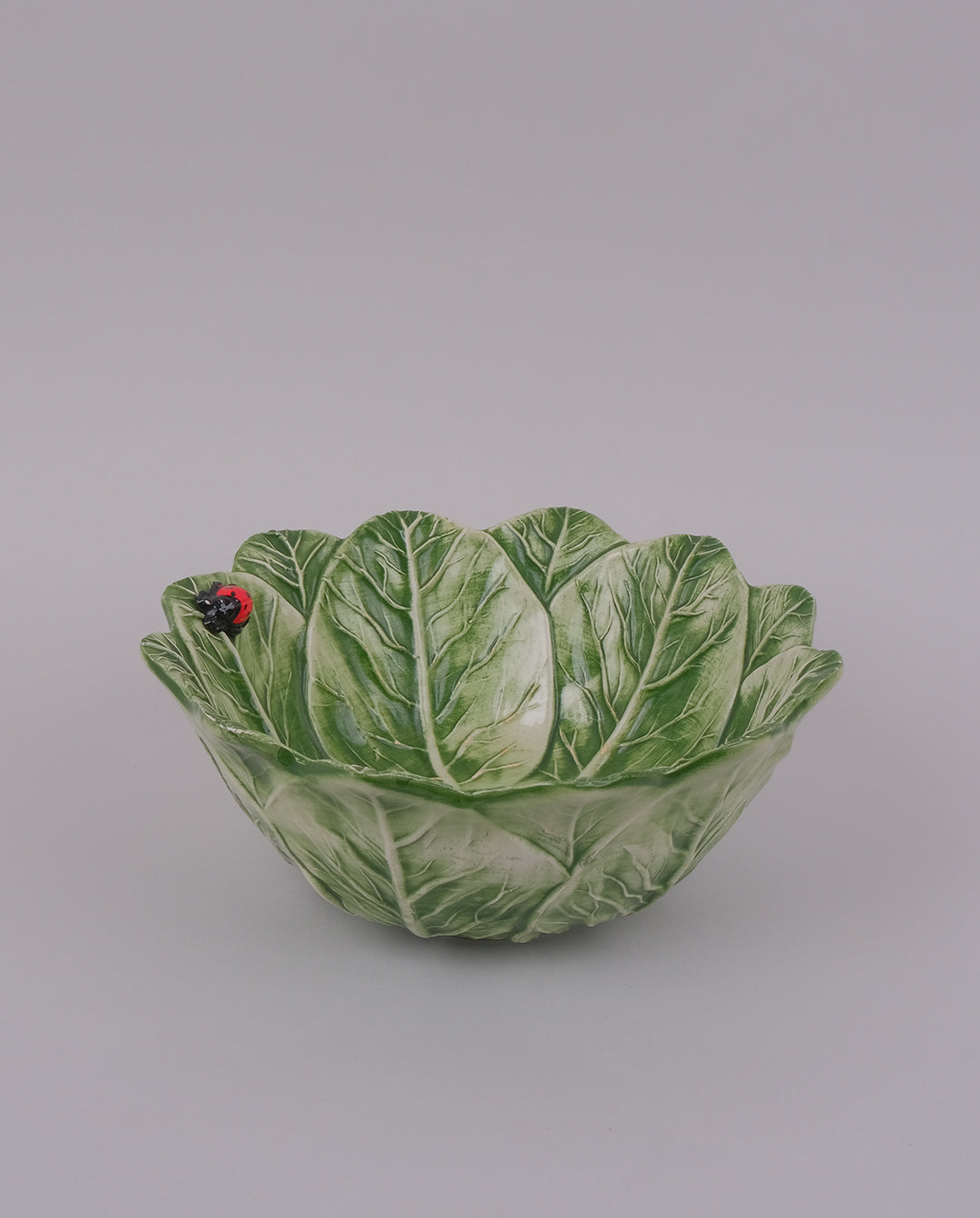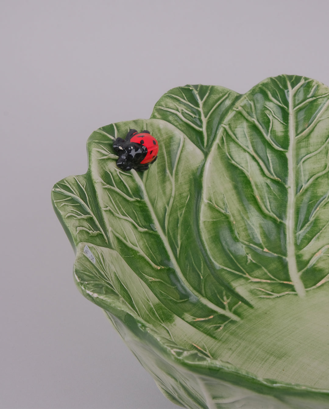 Saladier en céramique et barbotine en forme de feuilles de chou, détail d'une coccinelle sur le contour du bol.