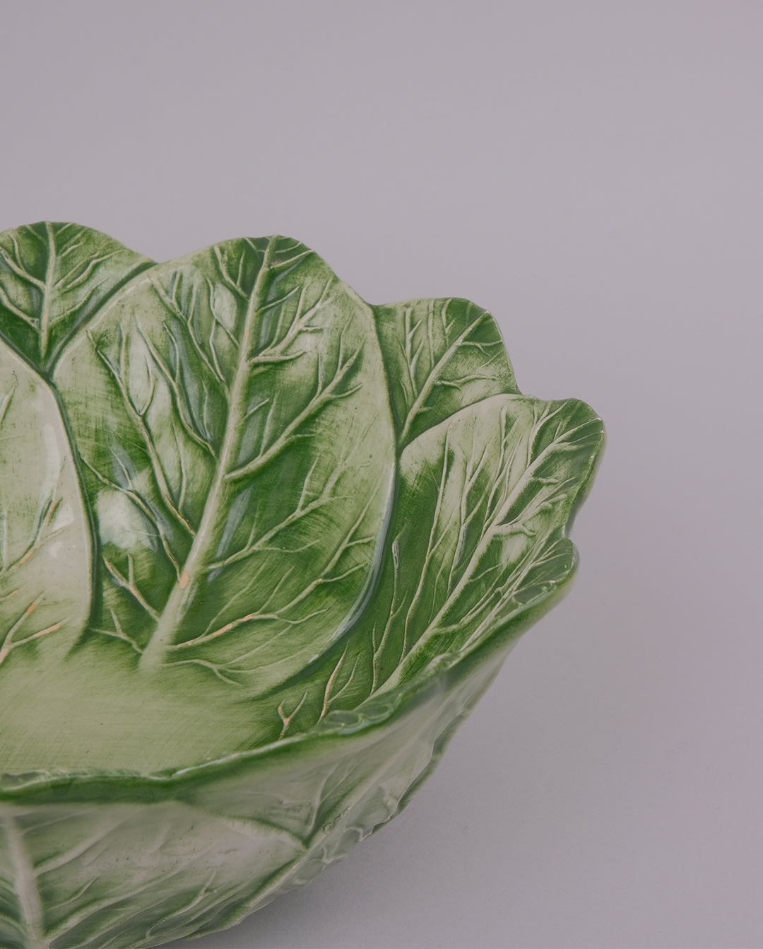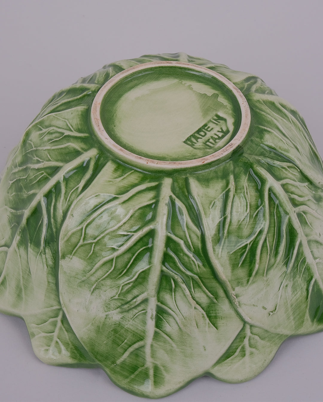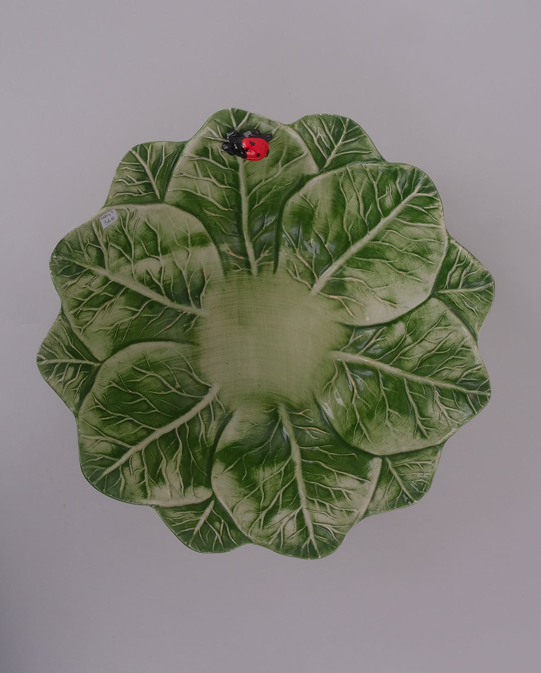 Saladier en céramique et barbotine en forme de feuilles de chou, détail d'une coccinelle sur le contour du bol.