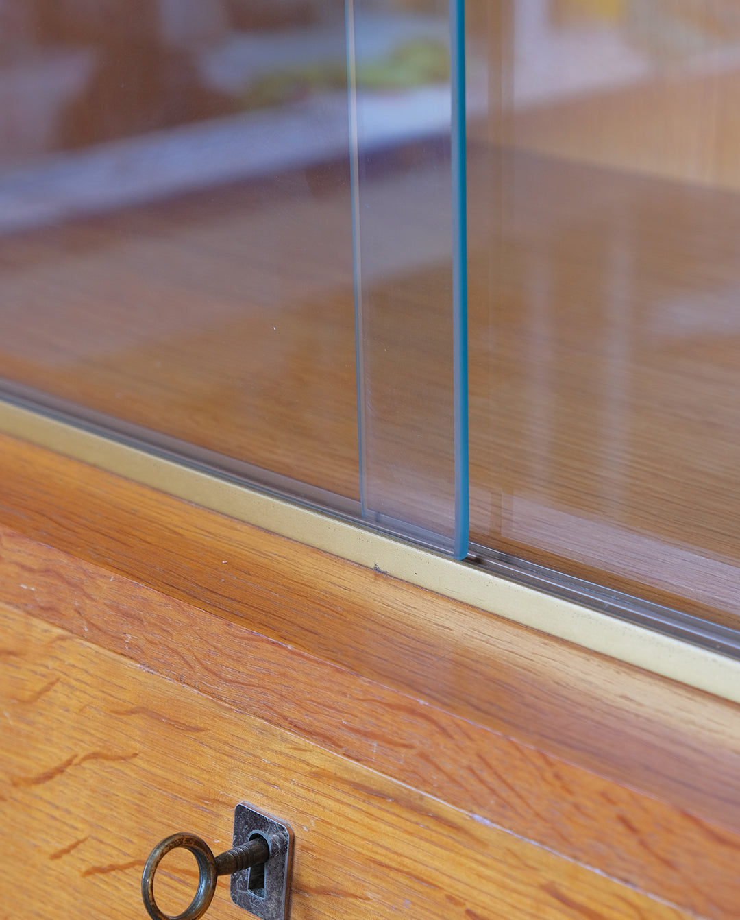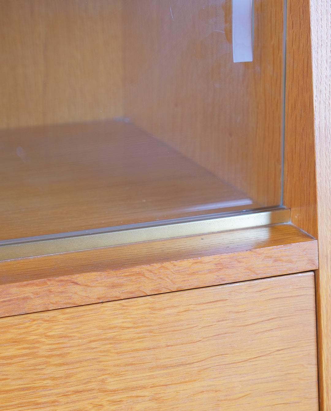 Une étagère derrière des portes coulissantes en verre