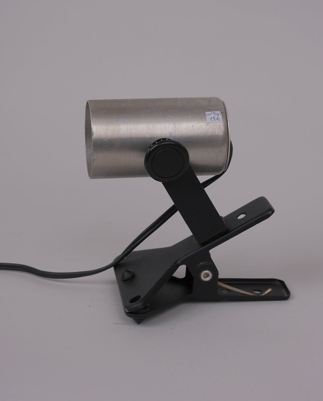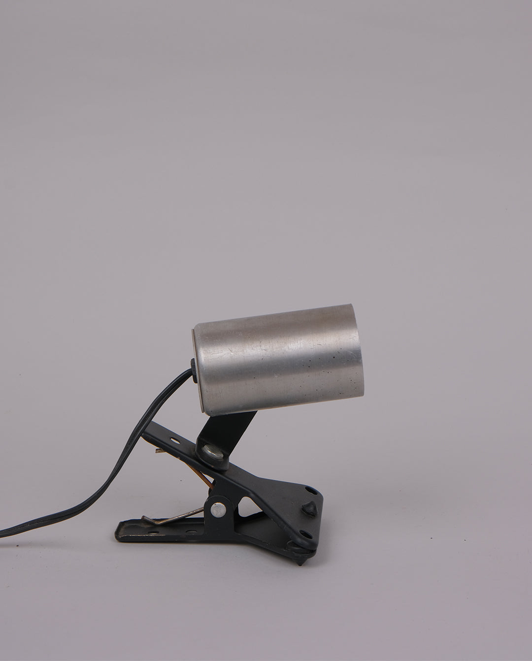 Spot pince vintage, des années 70 en aluminium brossé et plastique noir.