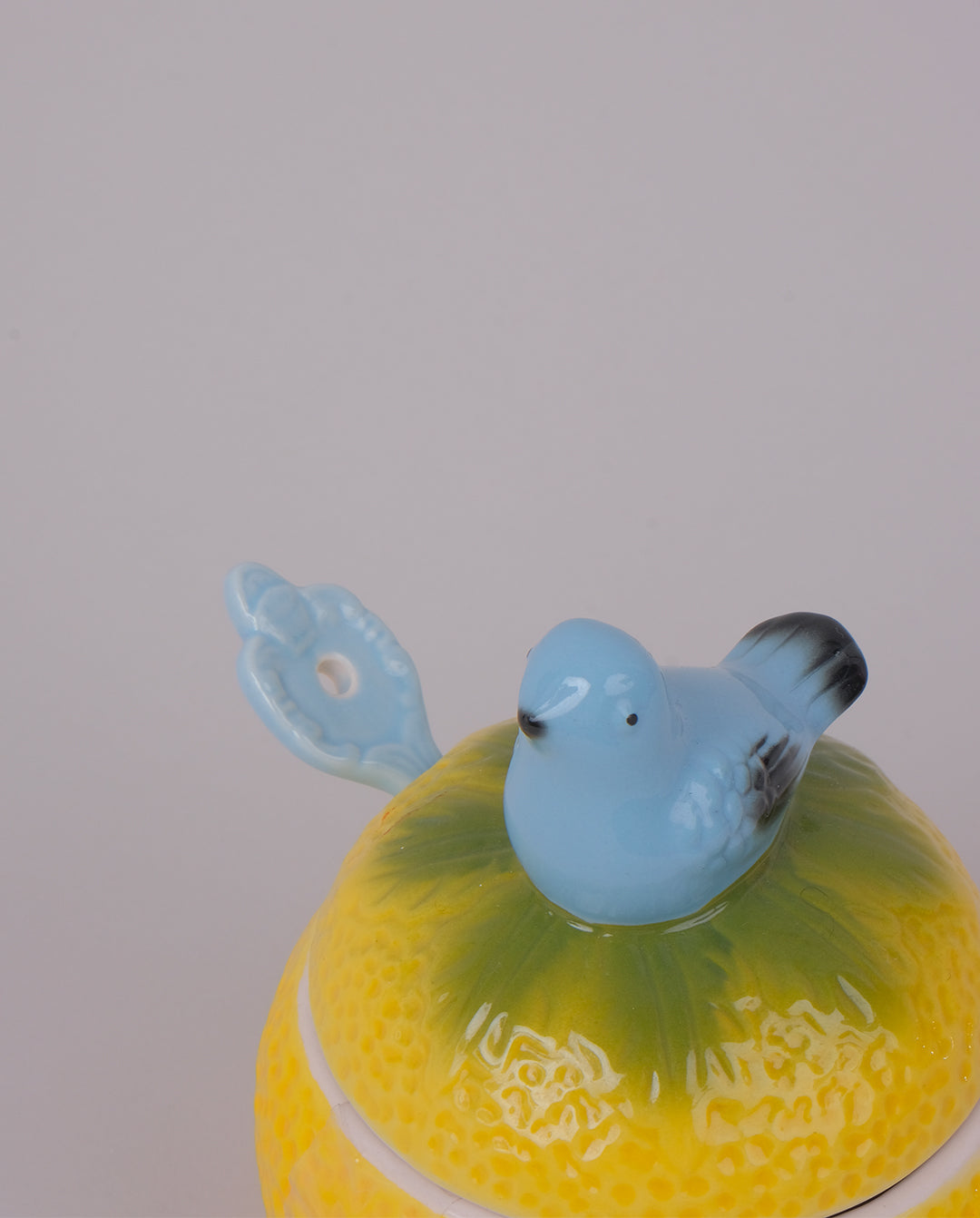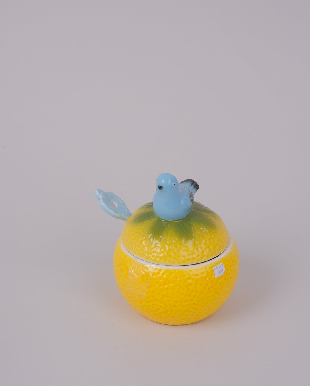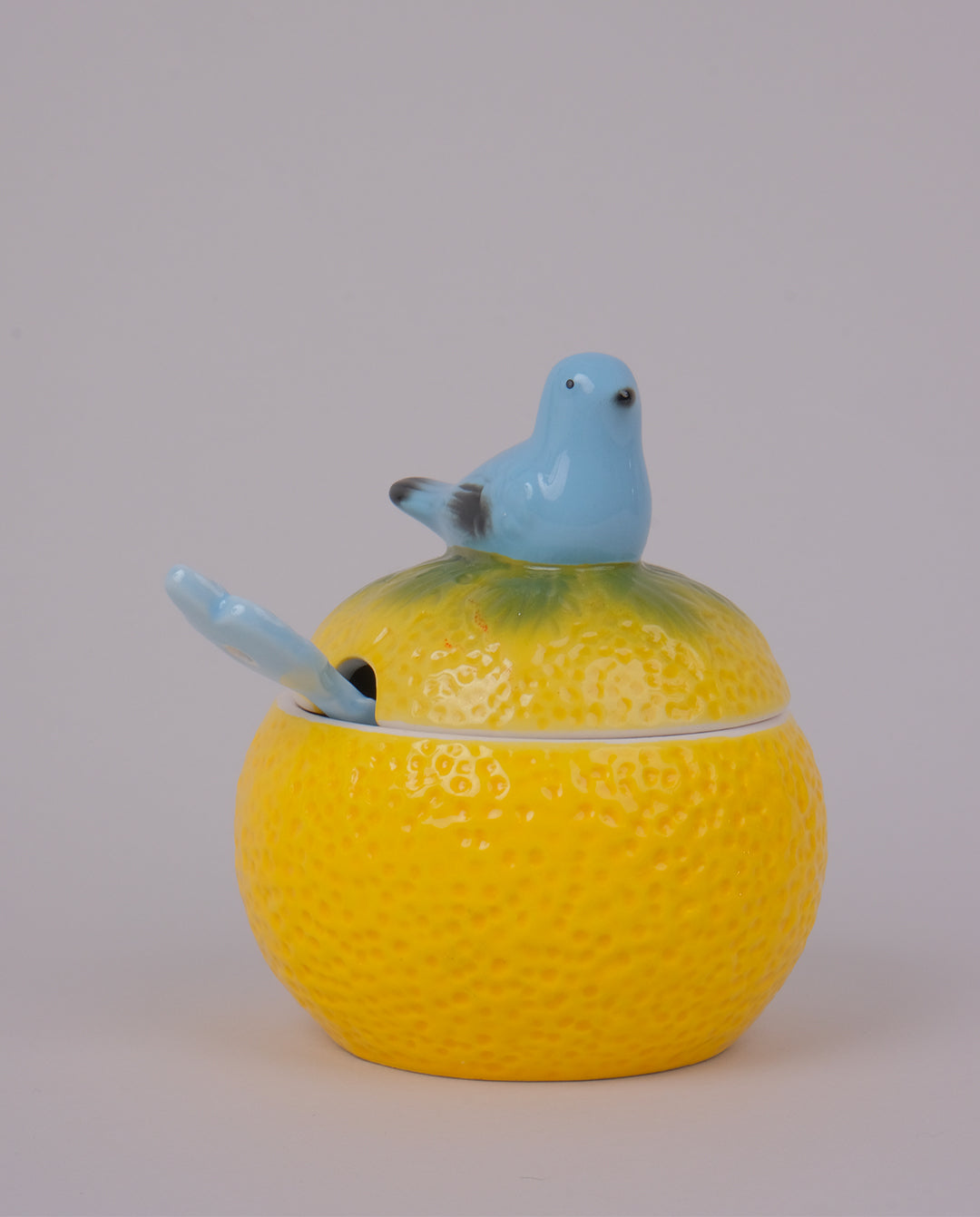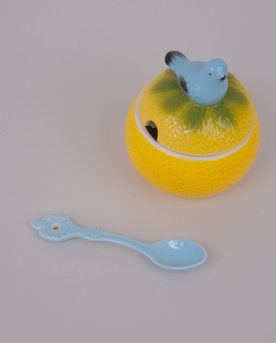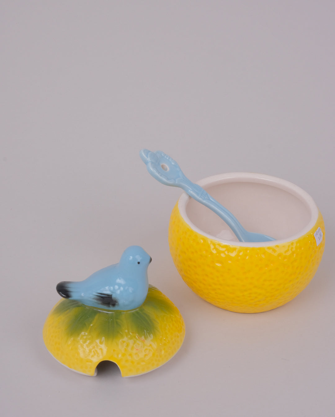 Sucrier ou confiturier en céramique et barbotine en forme d'agrume surmonté d'un oiseau. Cuillère en céramique.
