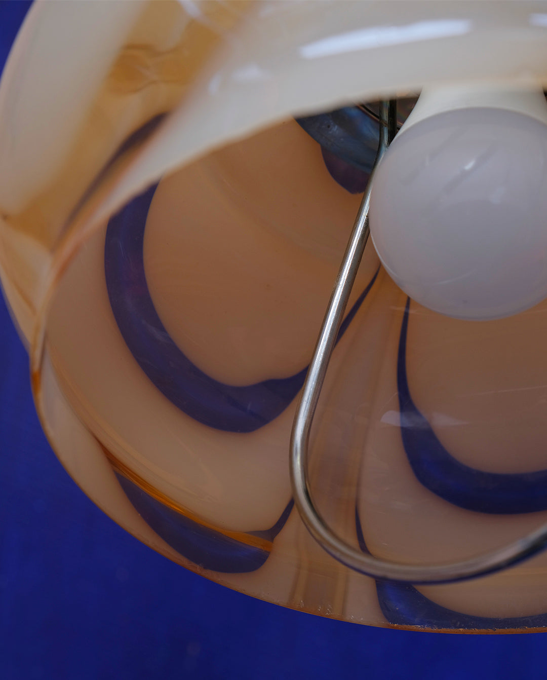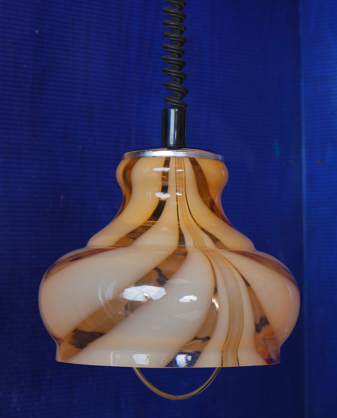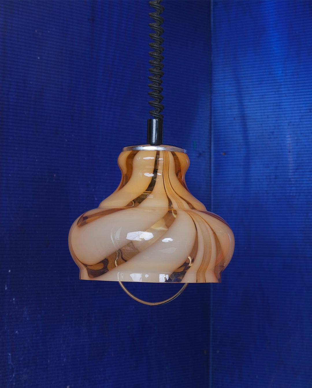 Suspension en verre teinté vintage au design arrondi qui évoque le courant space age.
