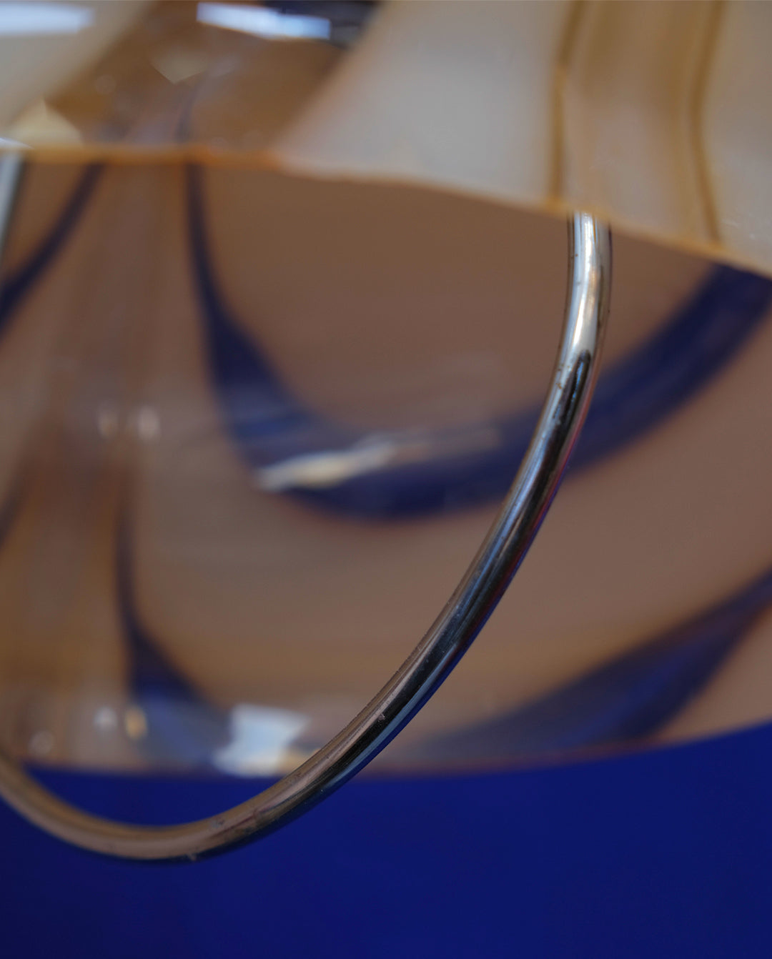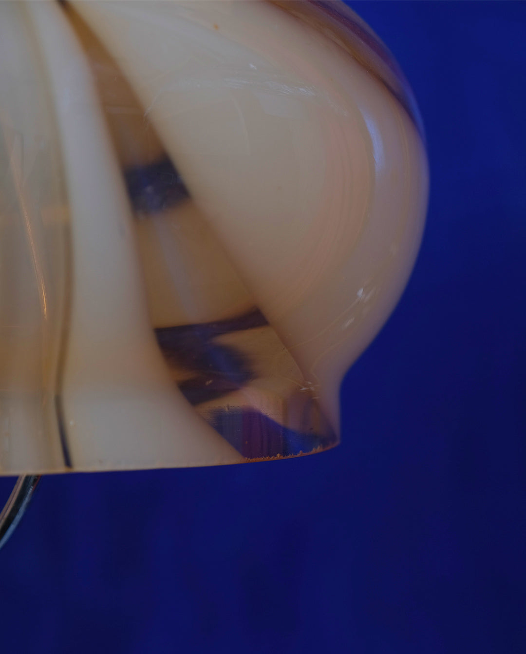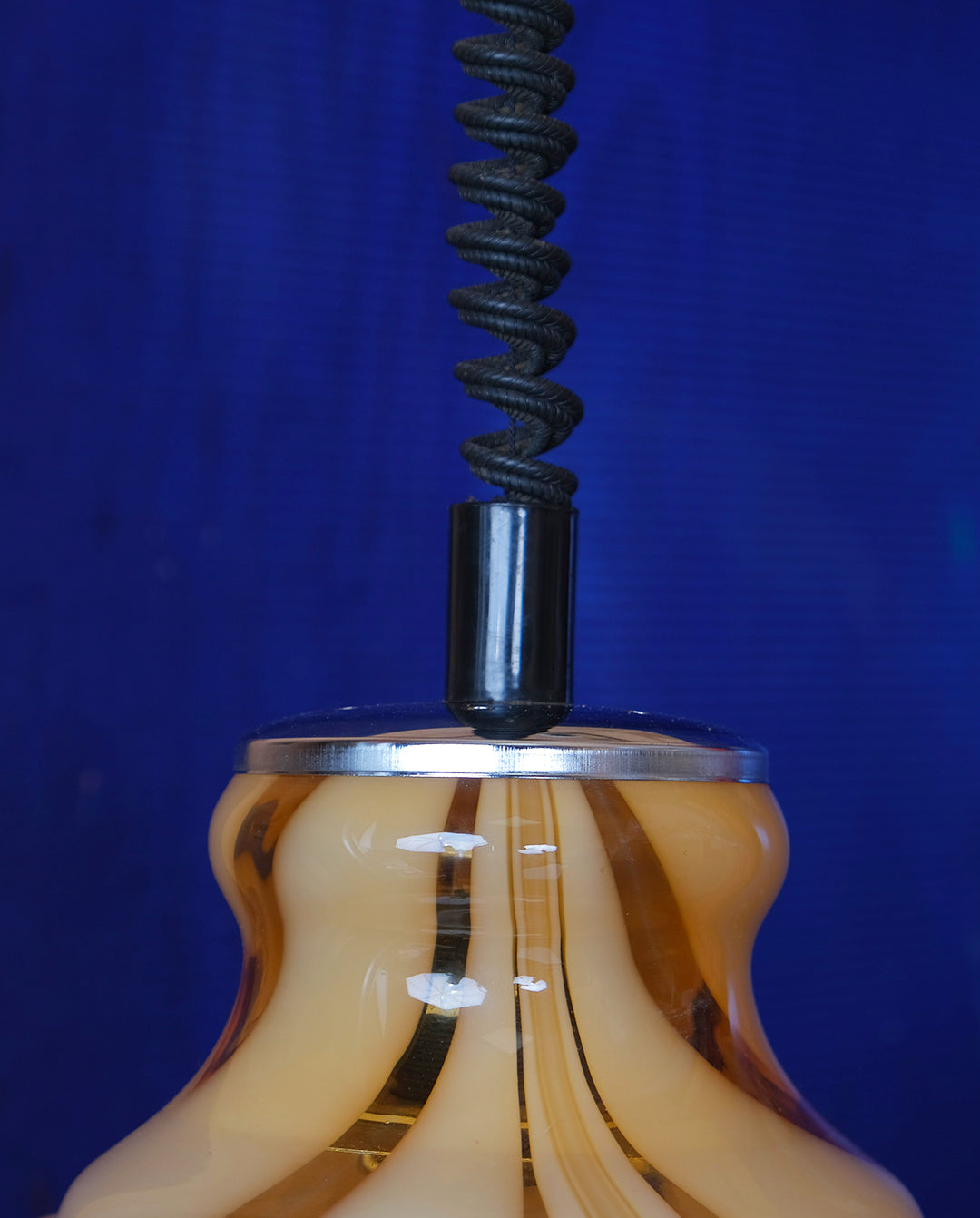 Suspension en verre teinté vintage au design arrondi qui évoque le courant space age.