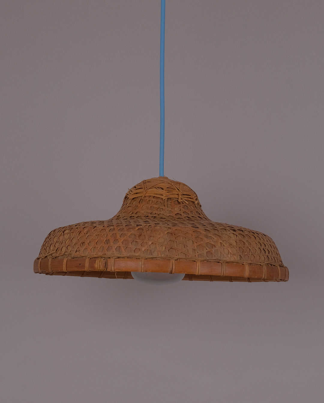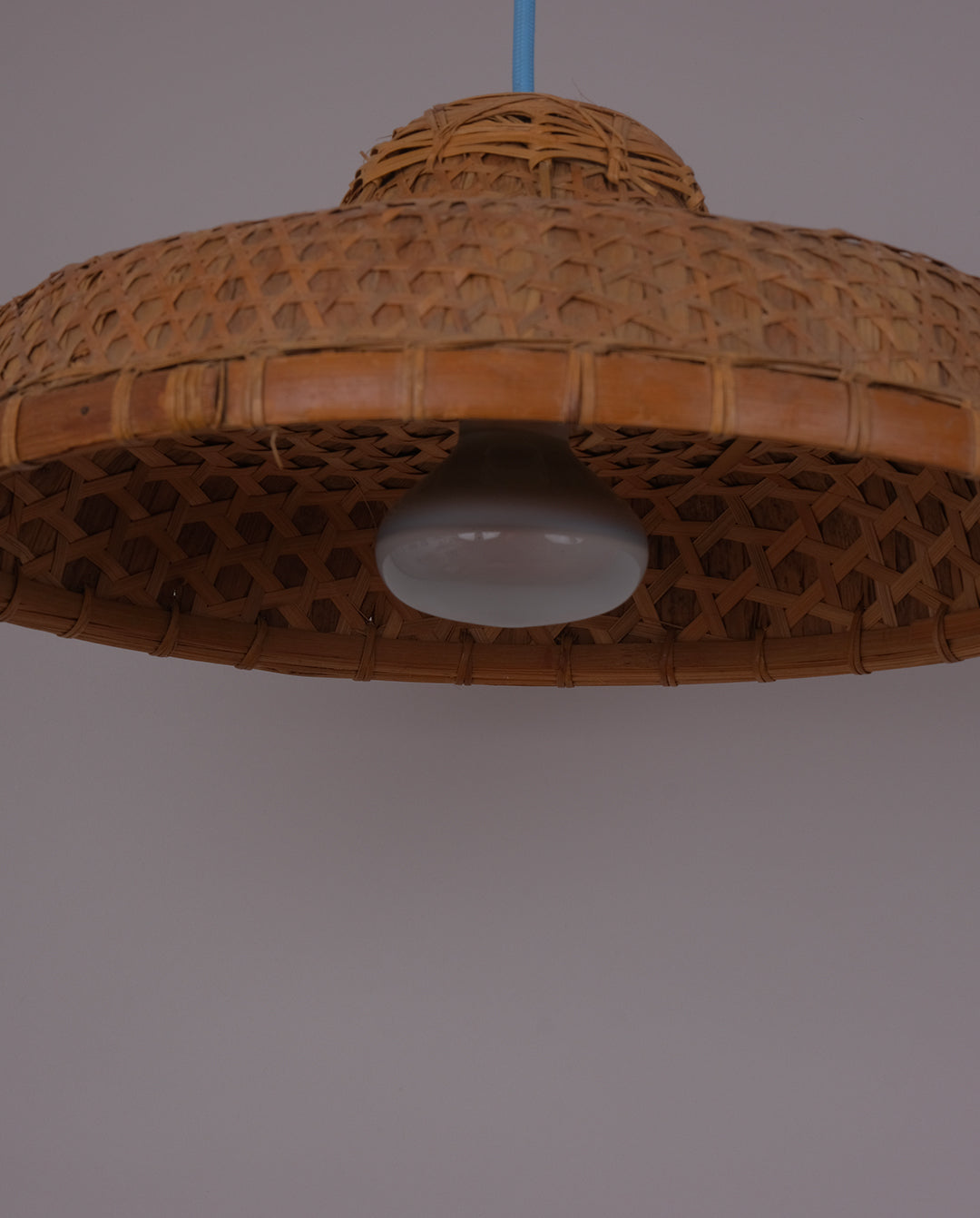 Suspension réalisée à partir d’un chapeau en cannage et fil électrique tissé bleu ciel