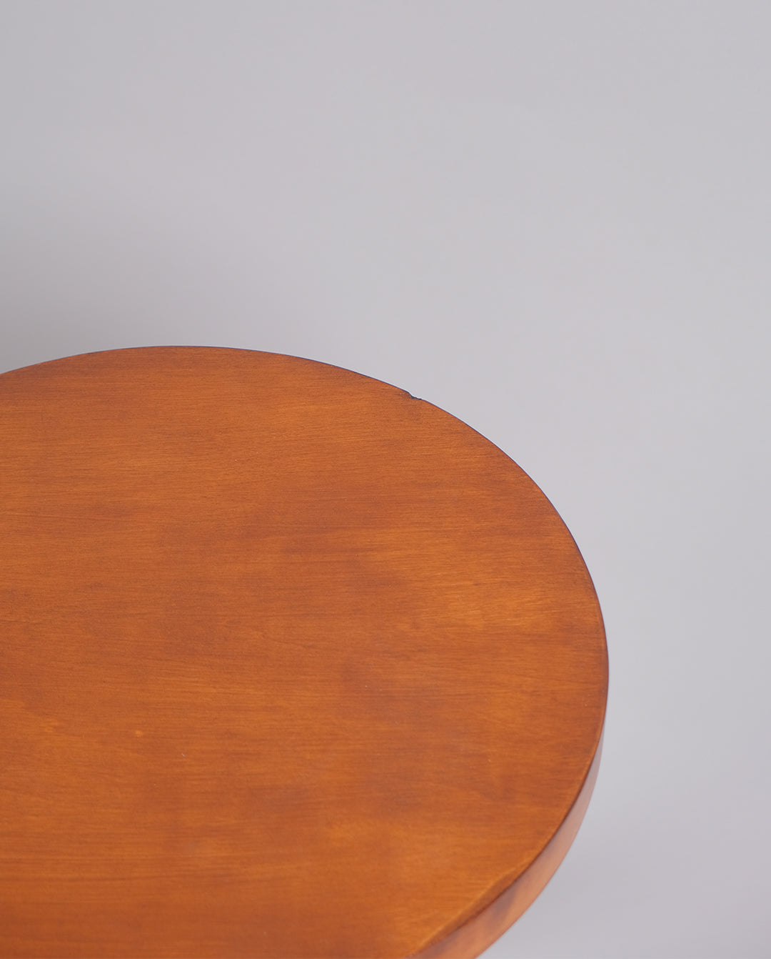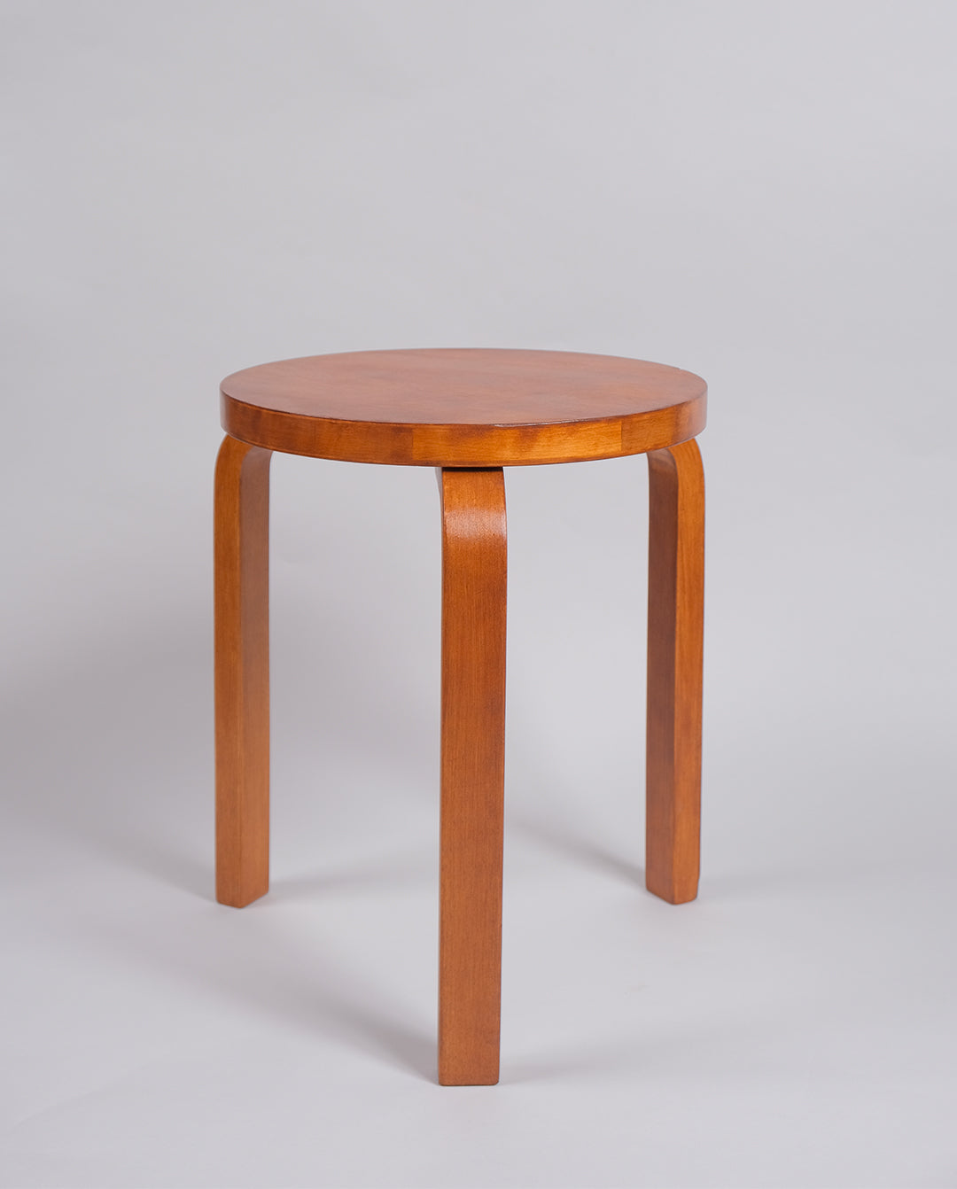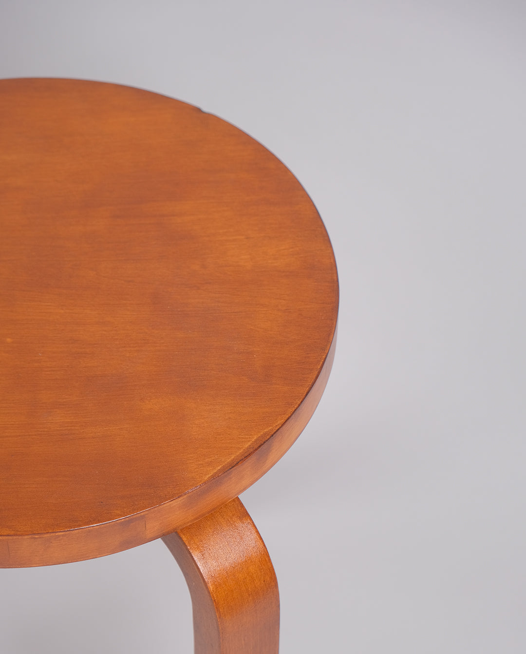 Tabouret tripode conçu par Alvar Aalto et fabriqués par Artek (Finlande) de couleur châtain.