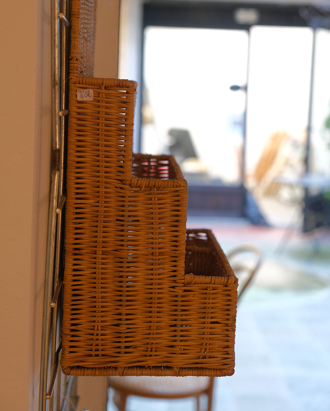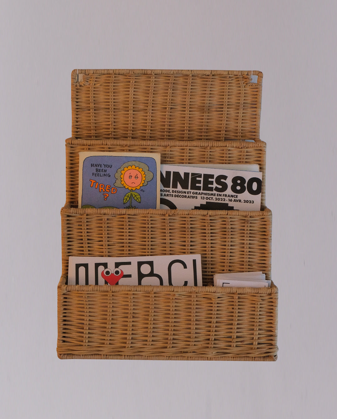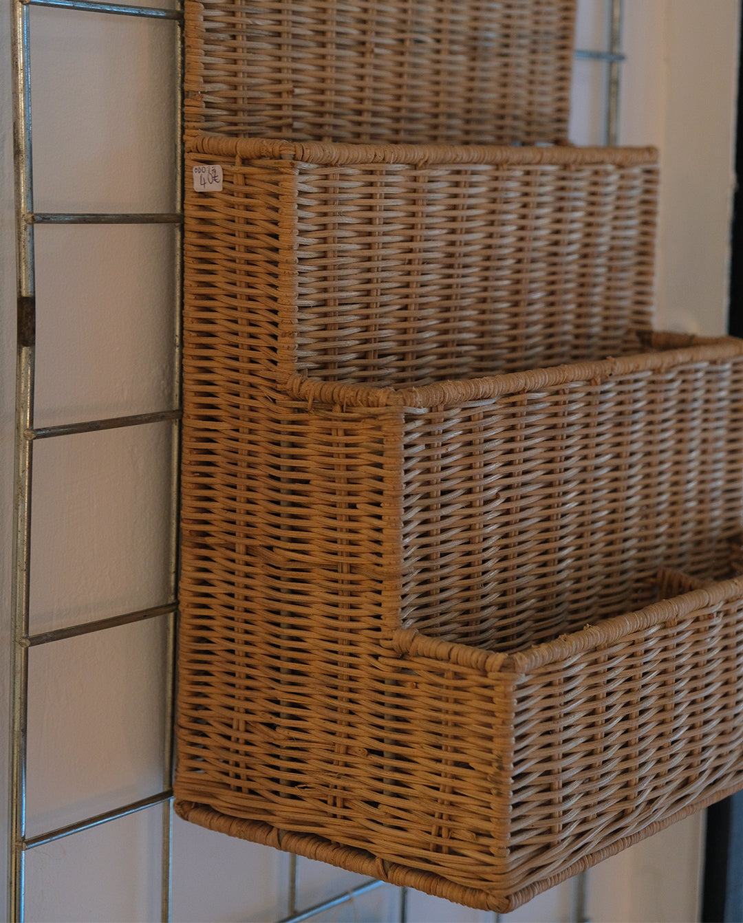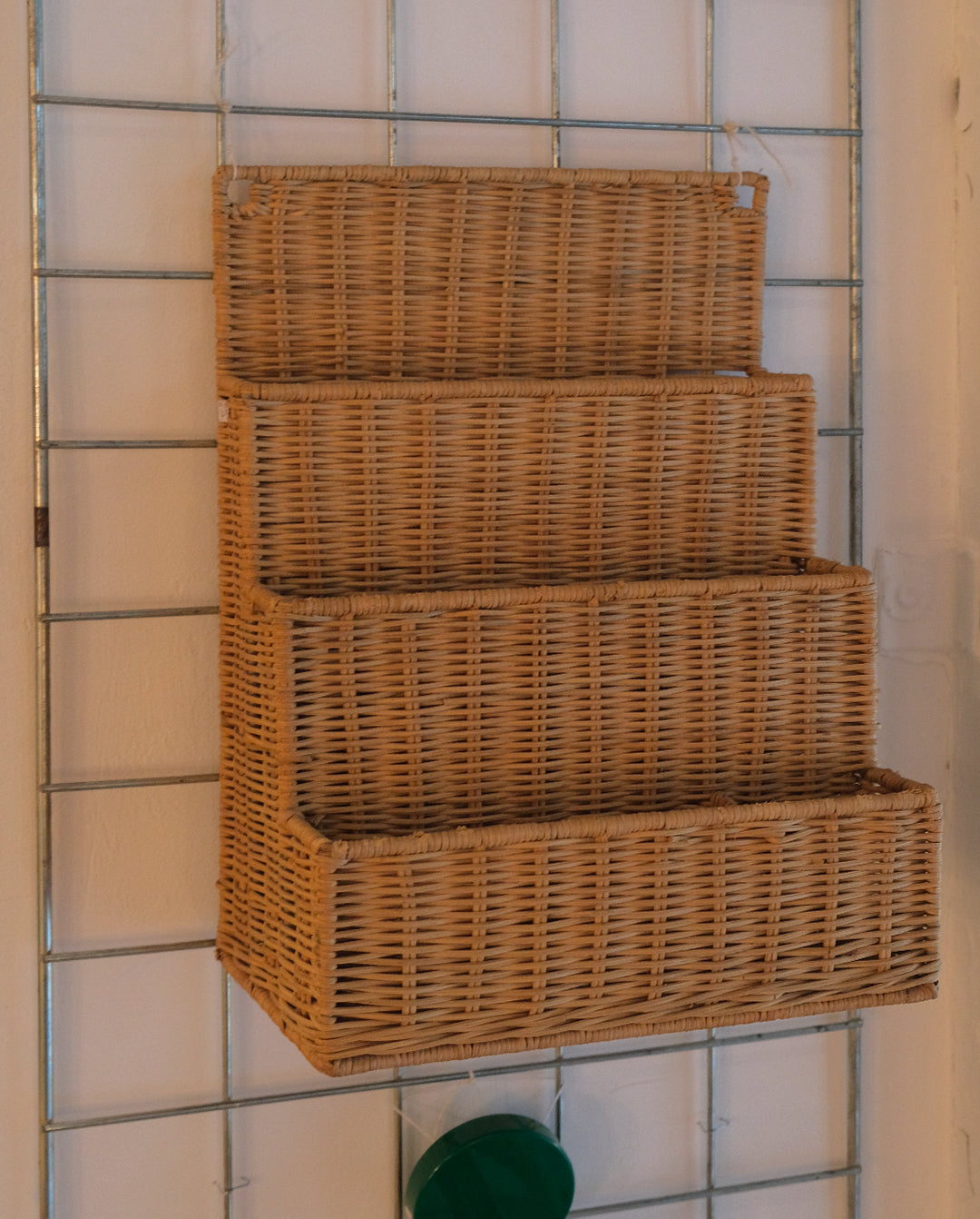 Porte-magazine ou range-document mural en osier. Compartiments répartis sur trois étages. Deux perforations prévues pour fixer le porte-document. Peut aussi se poser sur un bureau.