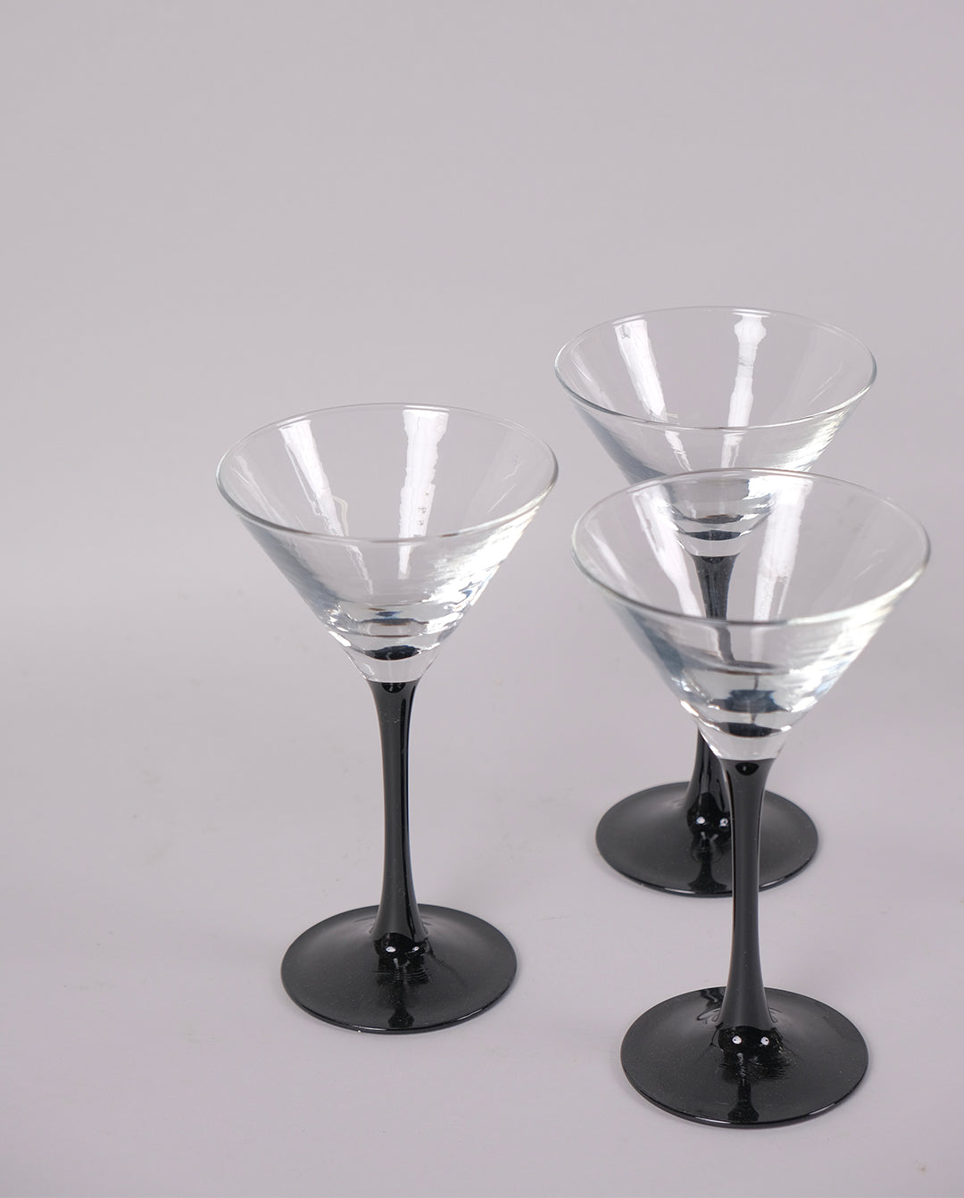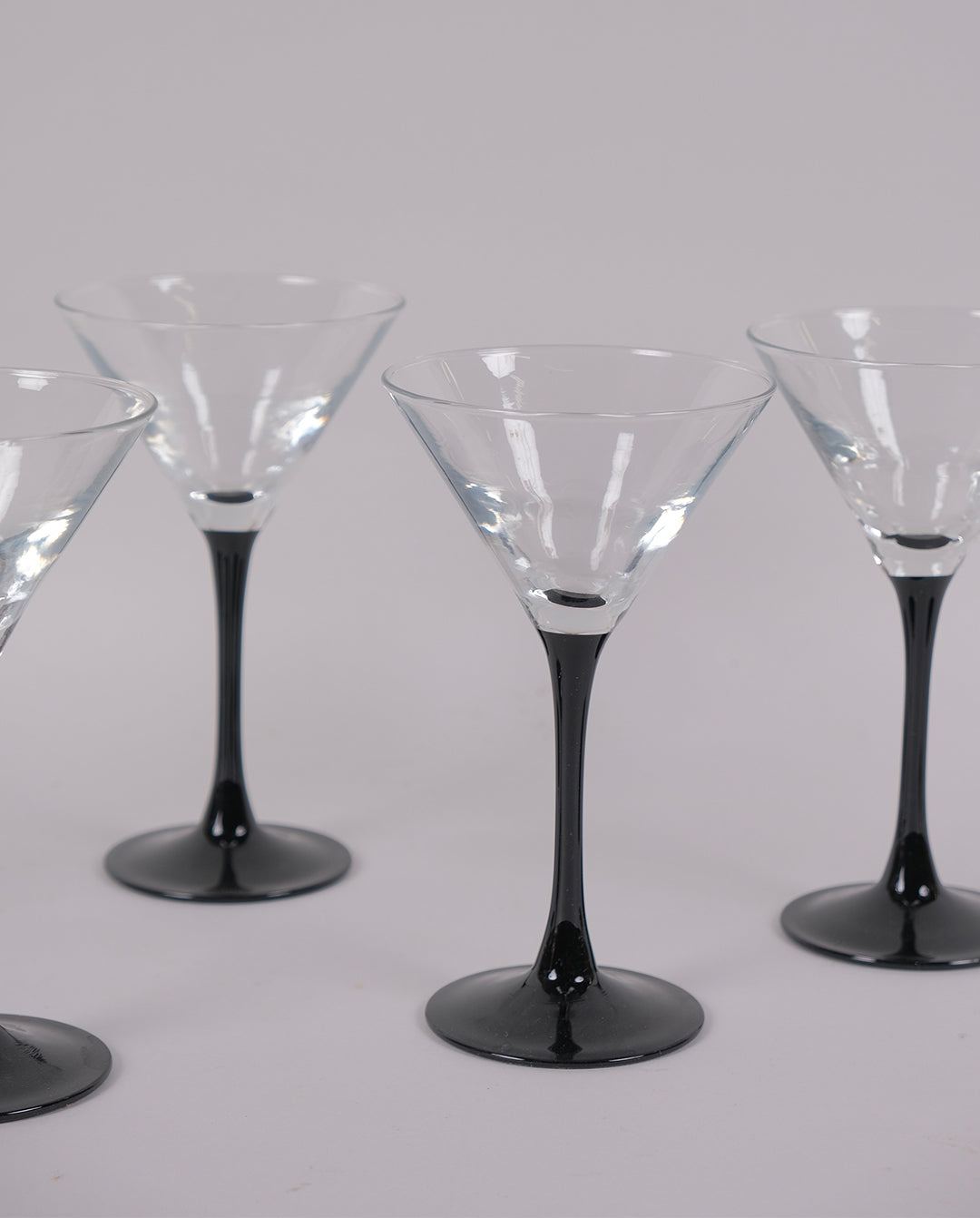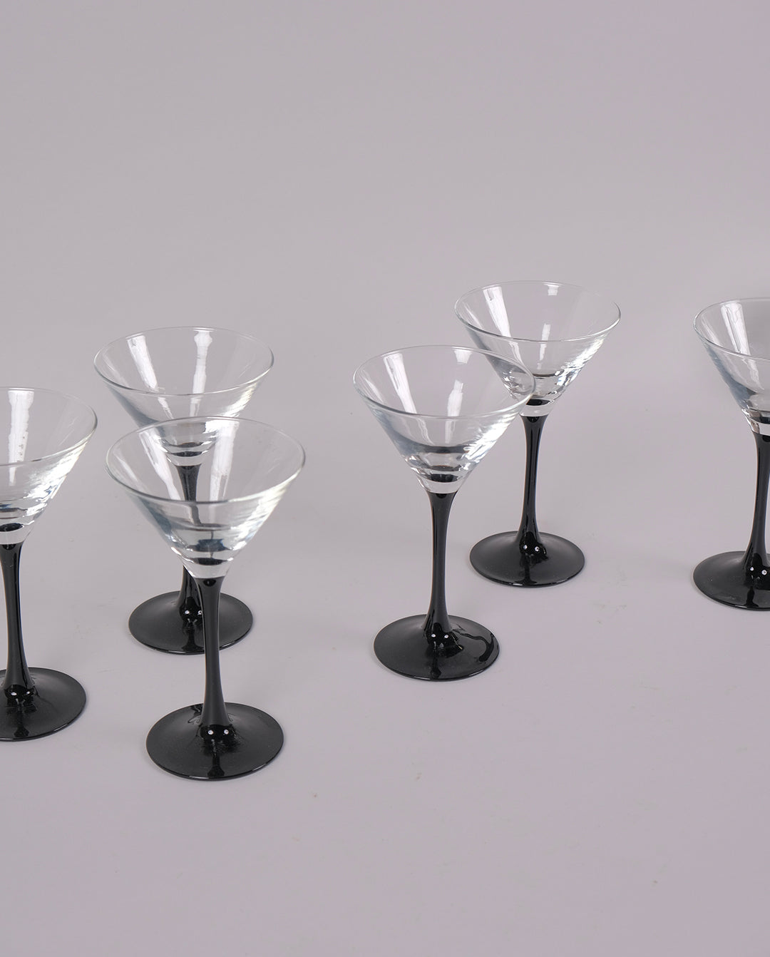 Ensemble de 6 verres à cocktails, forme conique et pieds noir, années 80
